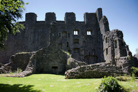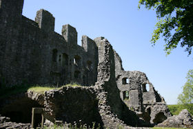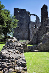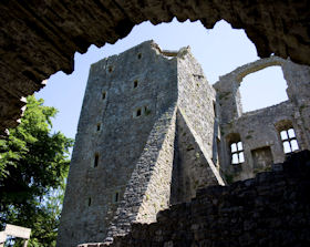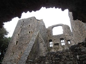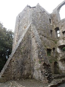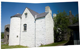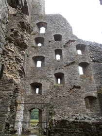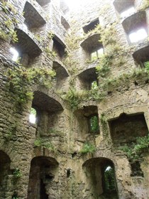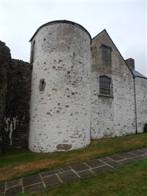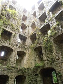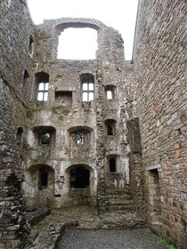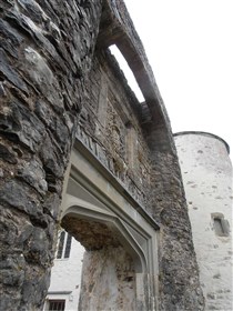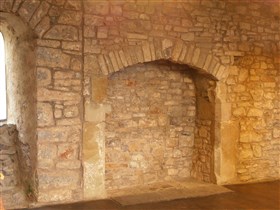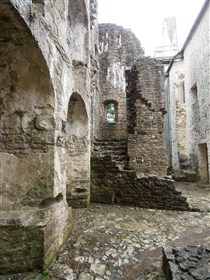 The north-east part has the base of a staircase in straight flights around a core of masonry to the left, with a vaulted kitchen adjacent. To the right of these are two undercroft vaults, with a mural staircase to the entrance passage above. In the inner face of the south-west wall at second storey level is a fireplace with stone-frame cupboards each side. In the south-east part there is a kitchen at the left, now the custodian's room with visitors' stairs, a middle room, and two inner rooms to the right; lateral fireplaces to middle room and kitchen. The doors from the middle room to the inner unit indicate the latter was subdivided two rooms. One has a chamfered stone frame with diagonal stops. The upper storey is reached by a newel stair in the round tower, entered in the south corner of the yard. There are fireplaces also at first floor level. Timber-framed partition.