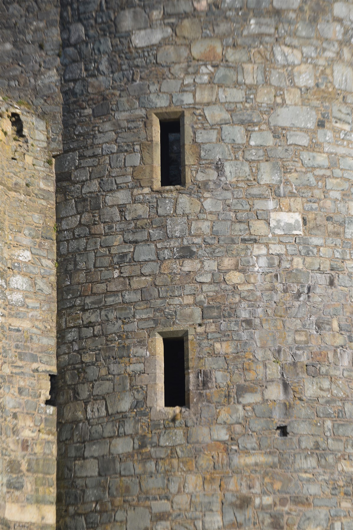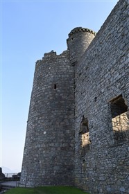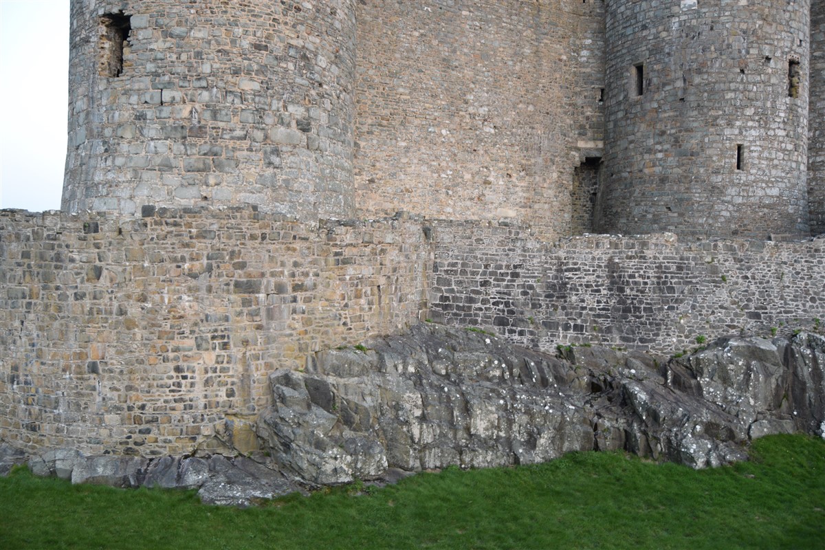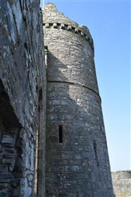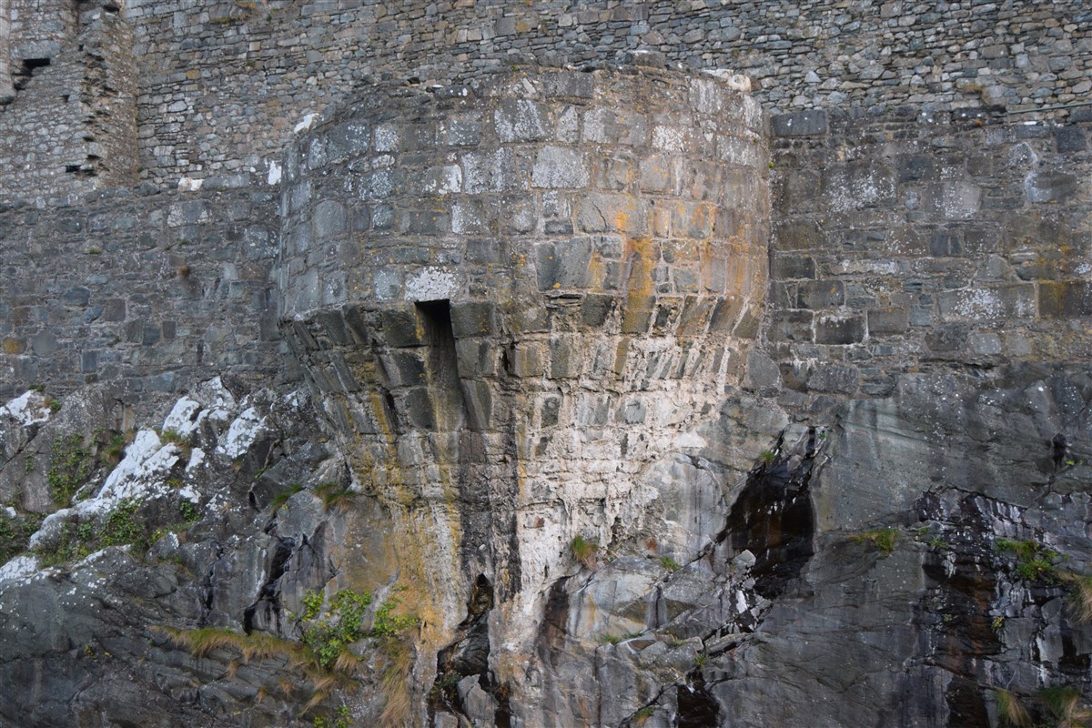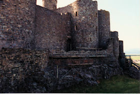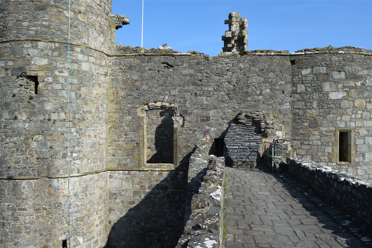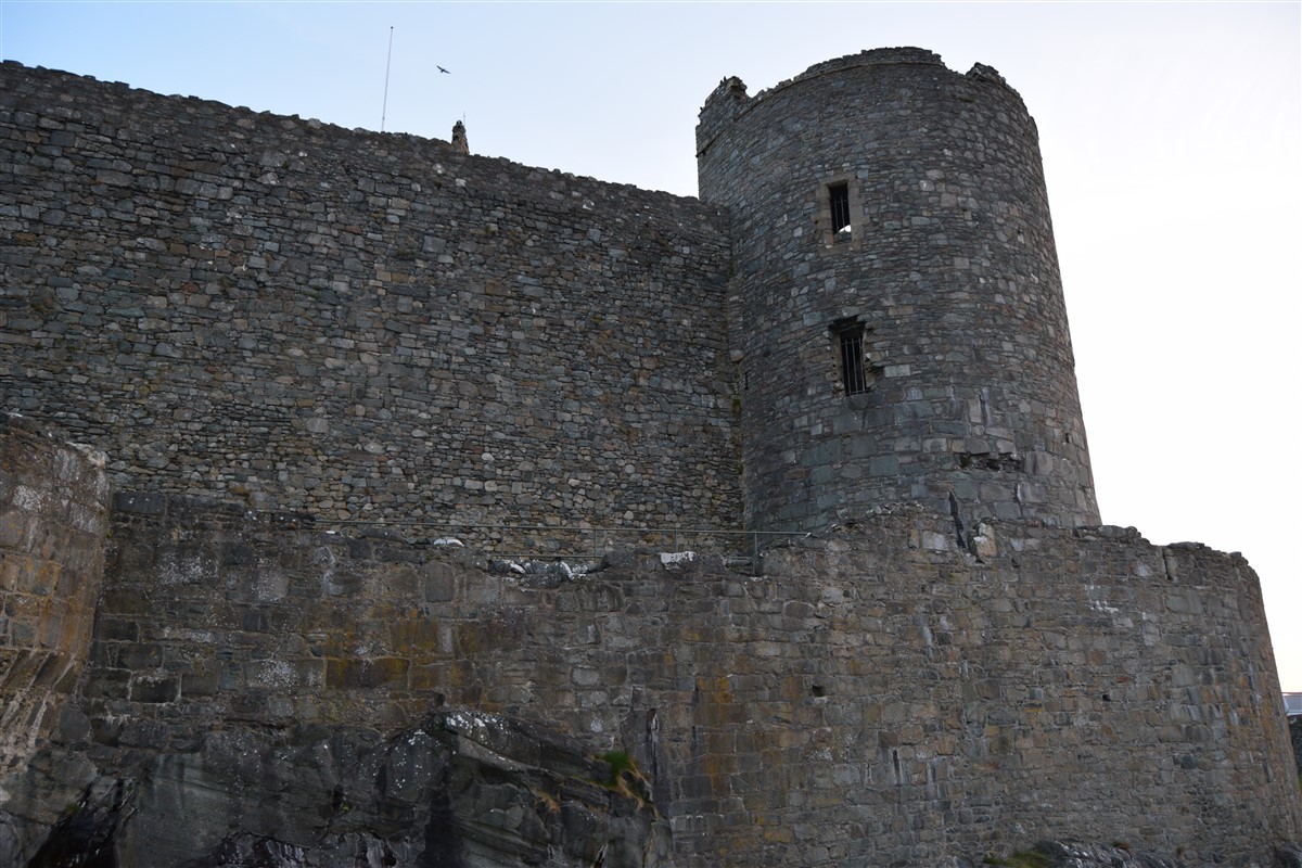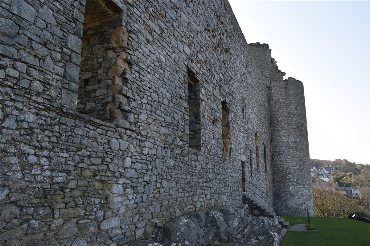 Masonry castle, now roofless; of limestone and granite construction faced with roughly-squared and coursed blocks; sandstone dressings to the openings; rock foundations. The castle is of the concentric type and occupies a tight, restricted site on a natural rock outcrop. The main defences consist of a four round towers placed at the corners of a roughly rectangular high-walled inner ward, with a lower-walled outer ward forming a narrow secondary line of defence. The latter broadly follows the line of the inner ward, though its walls have been reduced in height. In the centre of the inner ward's eastern (town-facing) wall is a large square gatehouse block. This consists of a pair of high D-shaped drum towers to the front, and a pair of narrower stair towers to the rear, the latter rising up two stages above the inner ward's corner towers and one stage above the paired front towers. The hall, chapel, service and storage buildings were ranged around the N, S and W sides, with the well located against the N wall. Of these buildings, only the walls of the gabled chapel stand to any height; the remainder is reduced to foundation level. The gatehouse housed the principal rooms, arranged as lavishly-appointed suites, one on each of the upper floors. The first-floor apartment probably served as the constable's quarters, whilst the upper floor rooms, of rather finer quality of detail, would have been reserved for important visitors such as the King and his circle. Access to these apartments was from the inner ward. Here an external stone stair, arranged in three straight flights, leads to a round-arched entrance off-centre to the L on the gatehouse's 3-window inner elevation. The windows to the upper apartments have finely-cut hollow-chamfered jambs and segmental heads, formerly with Decorated tracery lights, typical of the Edwardian Court Style. Various fragmentary fireplaces survive, mostly with stone hoods with decorative corbels. The gatehouse was conceived as an independently defensible unit, and correspondingly could withstand assault from the inner ward, should this be taken. The main approach is in the form of a tunnel entrance between the front towers. This leads through to the inner ward via a system of defences including portcullises, gates and murderholes. The portcullises were operated from the first floor and were therefore under the constable's direct control. The outer ward has a postern gate, comprising a gateway between small turrets, corbelled-out from the wall; a complex bridge system with further gates and a large drawbridge no longer survives. On the N side is a postern gate with small D-shaped drum towers. This gives access to 'Castle Rock', the rocky plateau which provides the site. A wall runs north-eastwards and curves around and down to protect the rock on this side. At the foot of the rock, at the north-western point, is the 'Gate-Next-the-Sea', where supplies were landed by ship. This gateway had its own drawbridge and portcullis system and was further covered by two rock-cut engine platforms above. It was linked to the main castle by a walled and defended track, known as the 'Way From the Sea', which winds its way up along the E and S sides of the rock. (Listed Building Report)