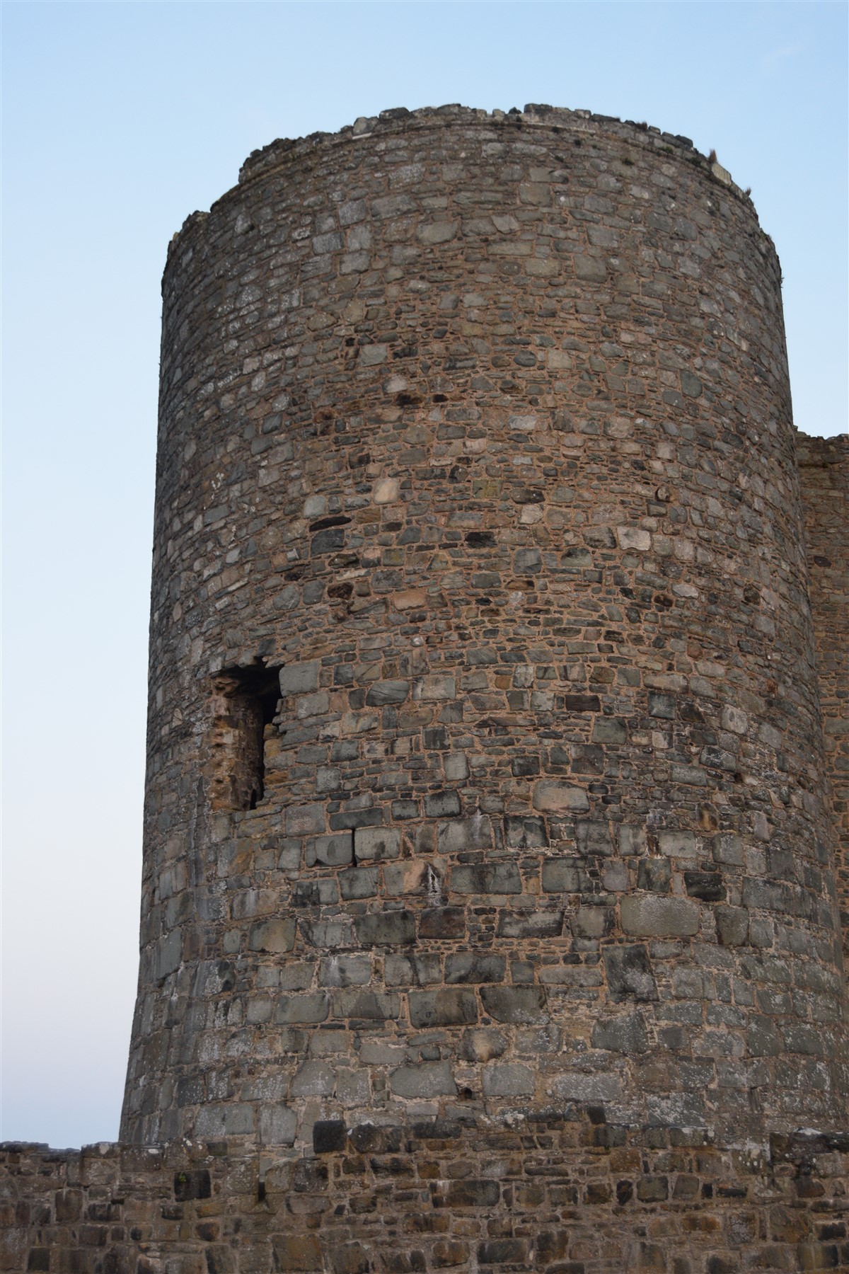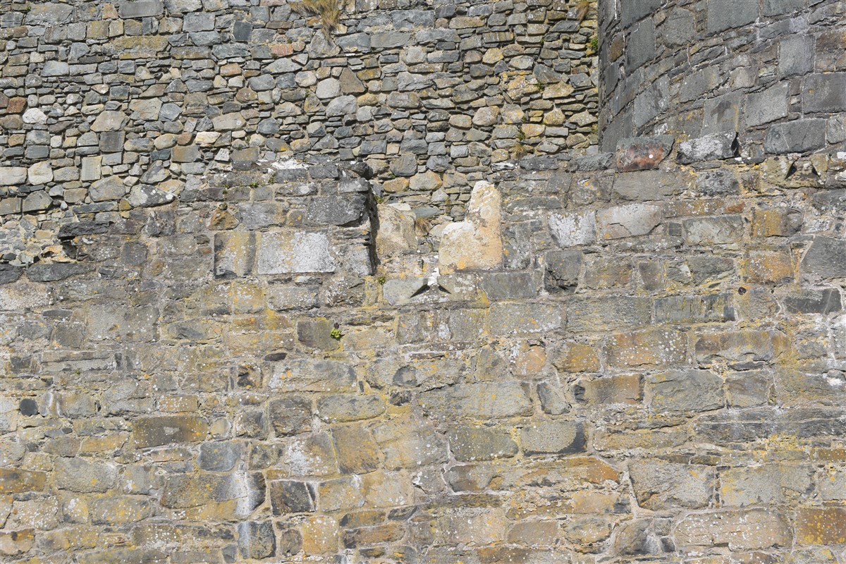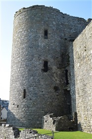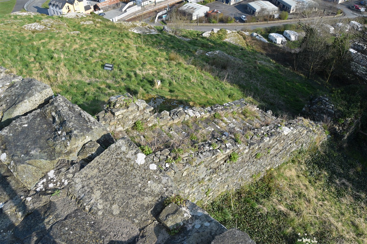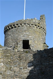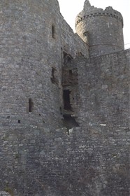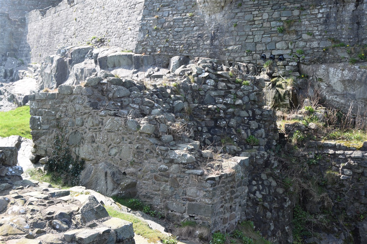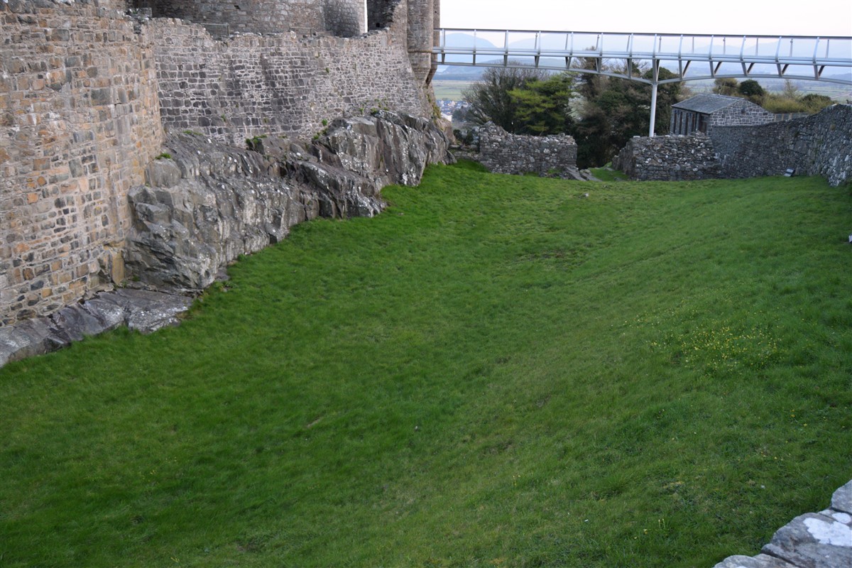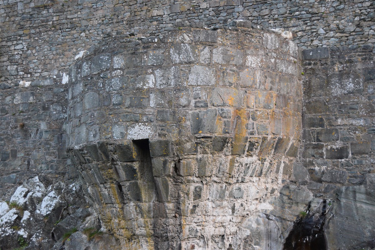 Masonry castle, now roofless; of limestone and granite construction faced with roughly-squared and coursed blocks; sandstone dressings to the openings; rock foundations. The castle is of the concentric type and occupies a tight, restricted site on a natural rock outcrop. The main defences consist of a four round towers placed at the corners of a roughly rectangular high-walled inner ward, with a lower-walled outer ward forming a narrow secondary line of defence. The latter broadly follows the line of the inner ward, though its walls have been reduced in height. In the centre of the inner ward's eastern (town-facing) wall is a large square gatehouse block. This consists of a pair of high D-shaped drum towers to the front, and a pair of narrower stair towers to the rear, the latter rising up two stages above the inner ward's corner towers and one stage above the paired front towers. The hall, chapel, service and storage buildings were ranged around the N, S and W sides, with the well located against the N wall. Of these buildings, only the walls of the gabled chapel stand to any height; the remainder is reduced to foundation level. The gatehouse housed the principal rooms, arranged as lavishly-appointed suites, one on each of the upper floors. The first-floor apartment probably served as the constable's quarters, whilst the upper floor rooms, of rather finer quality of detail, would have been reserved for important visitors such as the King and his circle. Access to these apartments was from the inner ward. Here an external stone stair, arranged in three straight flights, leads to a round-arched entrance off-centre to the L on the gatehouse's 3-window inner elevation. The windows to the upper apartments have finely-cut hollow-chamfered jambs and segmental heads, formerly with Decorated tracery lights, typical of the Edwardian Court Style. Various fragmentary fireplaces survive, mostly with stone hoods with decorative corbels. The gatehouse was conceived as an independently defensible unit, and correspondingly could withstand assault from the inner ward, should this be taken. The main approach is in the form of a tunnel entrance between the front towers. This leads through to the inner ward via a system of defences including portcullises, gates and murderholes. The portcullises were operated from the first floor and were therefore under the constable's direct control. The outer ward has a postern gate, comprising a gateway between small turrets, corbelled-out from the wall; a complex bridge system with further gates and a large drawbridge no longer survives. On the N side is a postern gate with small D-shaped drum towers. This gives access to 'Castle Rock', the rocky plateau which provides the site. A wall runs north-eastwards and curves around and down to protect the rock on this side. At the foot of the rock, at the north-western point, is the 'Gate-Next-the-Sea', where supplies were landed by ship. This gateway had its own drawbridge and portcullis system and was further covered by two rock-cut engine platforms above. It was linked to the main castle by a walled and defended track, known as the 'Way From the Sea', which winds its way up along the E and S sides of the rock. (Listed Building Report)
