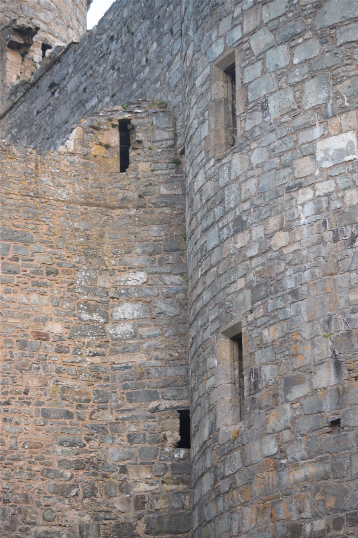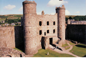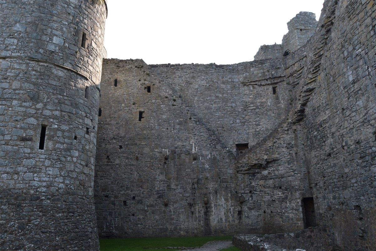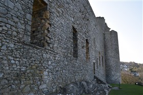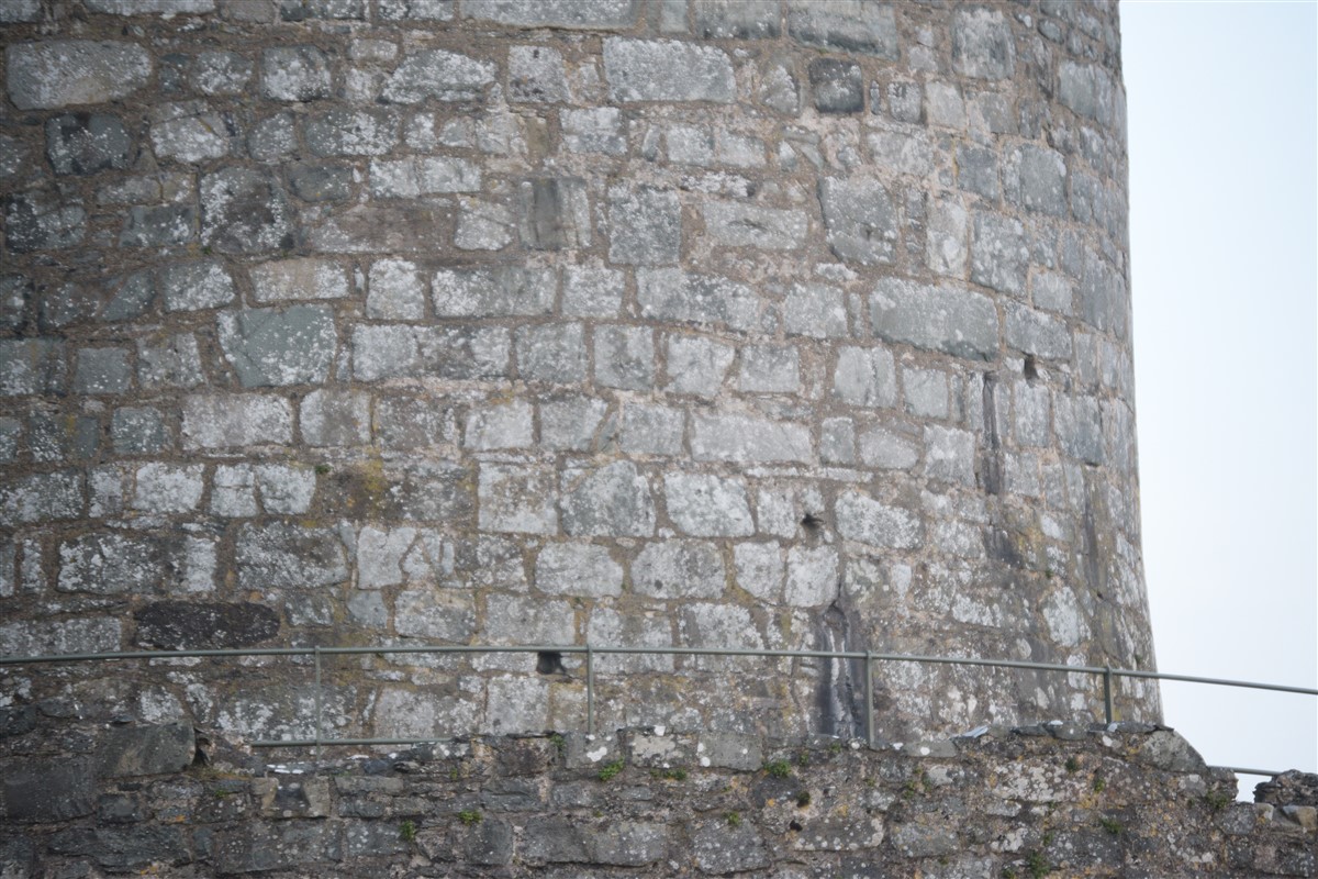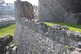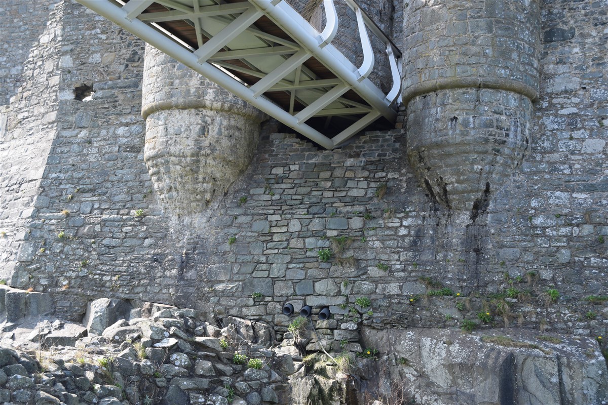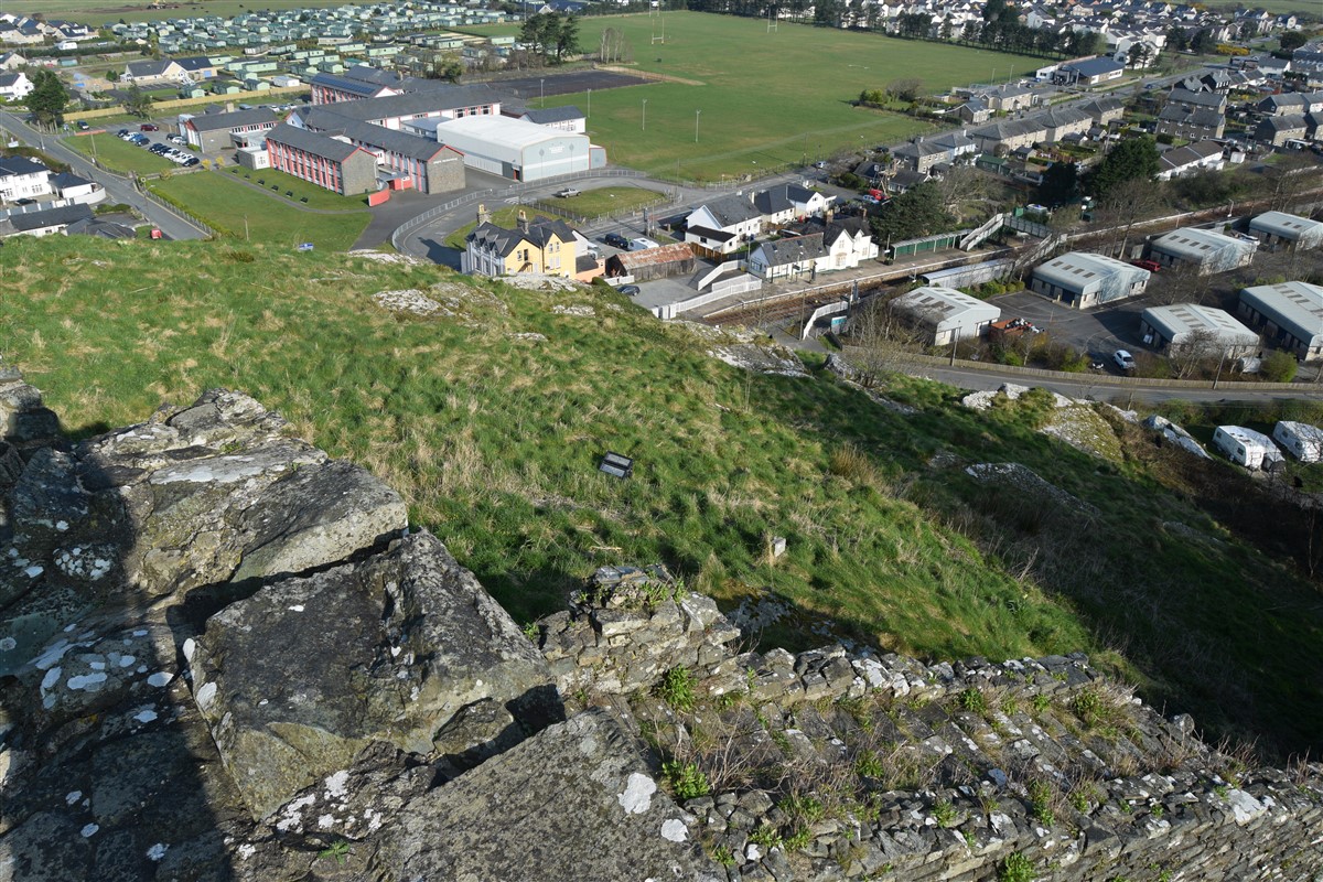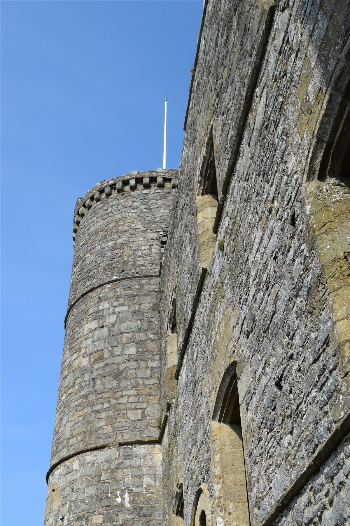 Masonry castle, now roofless; of limestone and granite construction faced with roughly-squared and coursed blocks; sandstone dressings to the openings; rock foundations. The castle is of the concentric type and occupies a tight, restricted site on a natural rock outcrop. The main defences consist of a four round towers placed at the corners of a roughly rectangular high-walled inner ward, with a lower-walled outer ward forming a narrow secondary line of defence. The latter broadly follows the line of the inner ward, though its walls have been reduced in height. In the centre of the inner ward's eastern (town-facing) wall is a large square gatehouse block. This consists of a pair of high D-shaped drum towers to the front, and a pair of narrower stair towers to the rear, the latter rising up two stages above the inner ward's corner towers and one stage above the paired front towers. The hall, chapel, service and storage buildings were ranged around the N, S and W sides, with the well located against the N wall. Of these buildings, only the walls of the gabled chapel stand to any height; the remainder is reduced to foundation level. The gatehouse housed the principal rooms, arranged as lavishly-appointed suites, one on each of the upper floors. The first-floor apartment probably served as the constable's quarters, whilst the upper floor rooms, of rather finer quality of detail, would have been reserved for important visitors such as the King and his circle. Access to these apartments was from the inner ward. Here an external stone stair, arranged in three straight flights, leads to a round-arched entrance off-centre to the L on the gatehouse's 3-window inner elevation. The windows to the upper apartments have finely-cut hollow-chamfered jambs and segmental heads, formerly with Decorated tracery lights, typical of the Edwardian Court Style. Various fragmentary fireplaces survive, mostly with stone hoods with decorative corbels. The gatehouse was conceived as an independently defensible unit, and correspondingly could withstand assault from the inner ward, should this be taken. The main approach is in the form of a tunnel entrance between the front towers. This leads through to the inner ward via a system of defences including portcullises, gates and murderholes. The portcullises were operated from the first floor and were therefore under the constable's direct control. The outer ward has a postern gate, comprising a gateway between small turrets, corbelled-out from the wall; a complex bridge system with further gates and a large drawbridge no longer survives. On the N side is a postern gate with small D-shaped drum towers. This gives access to 'Castle Rock', the rocky plateau which provides the site. A wall runs north-eastwards and curves around and down to protect the rock on this side. At the foot of the rock, at the north-western point, is the 'Gate-Next-the-Sea', where supplies were landed by ship. This gateway had its own drawbridge and portcullis system and was further covered by two rock-cut engine platforms above. It was linked to the main castle by a walled and defended track, known as the 'Way From the Sea', which winds its way up along the E and S sides of the rock. (Listed Building Report)