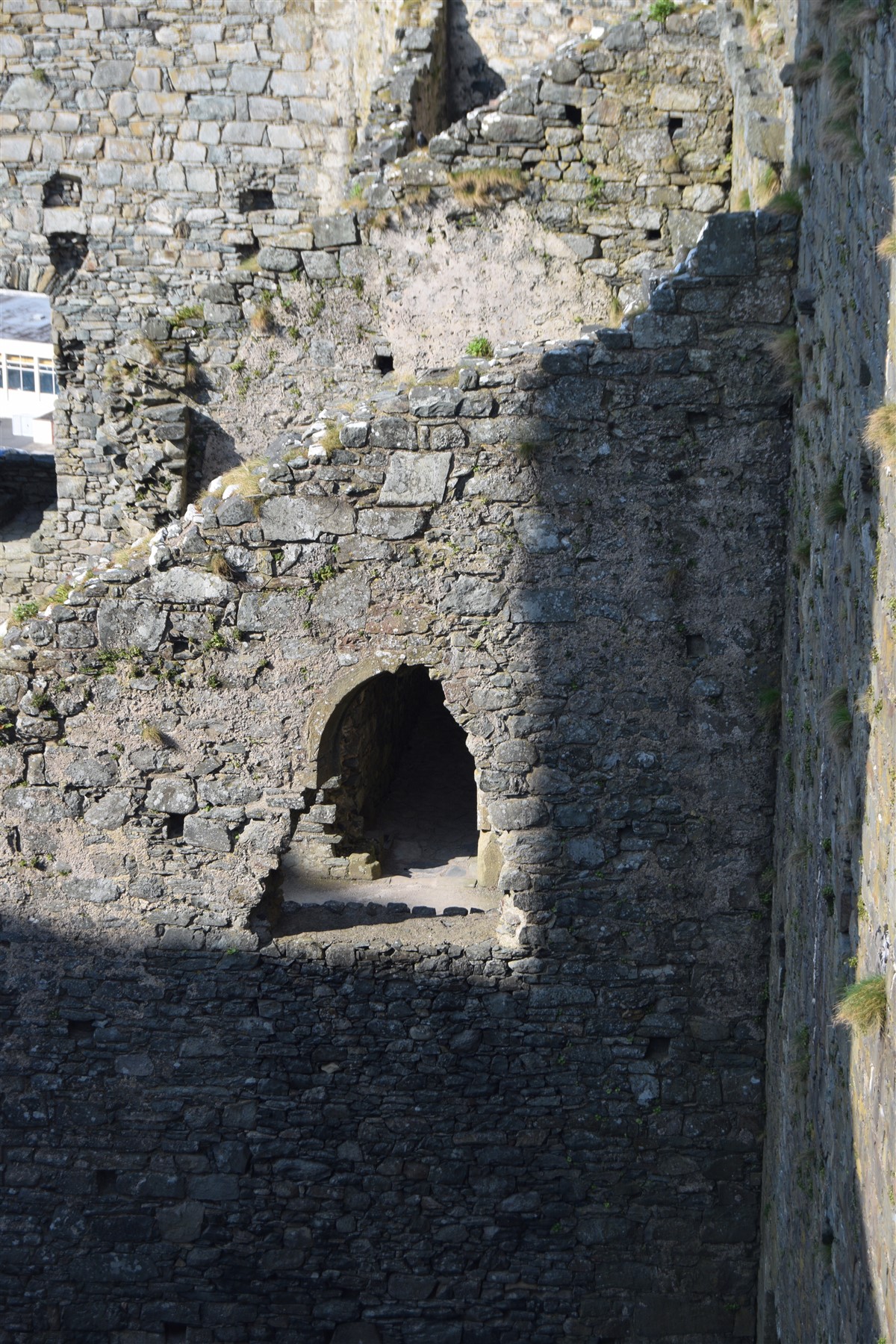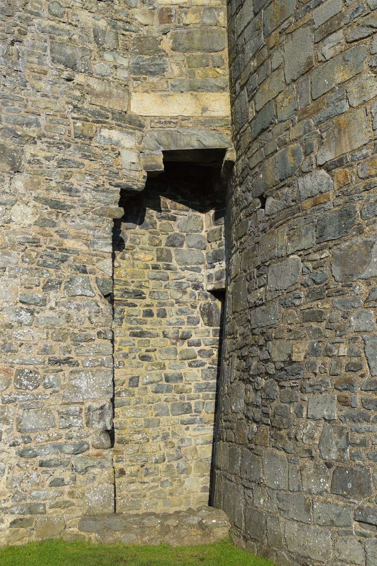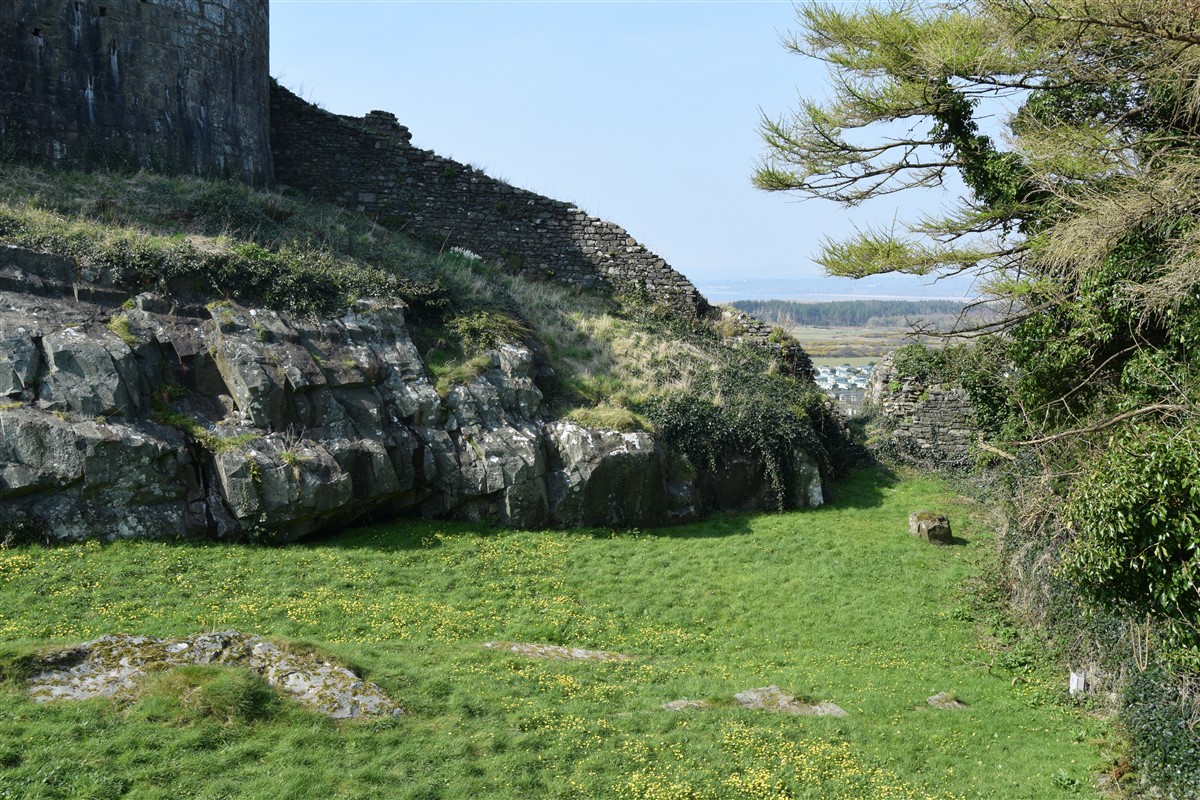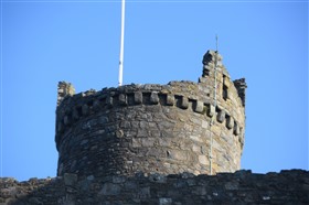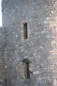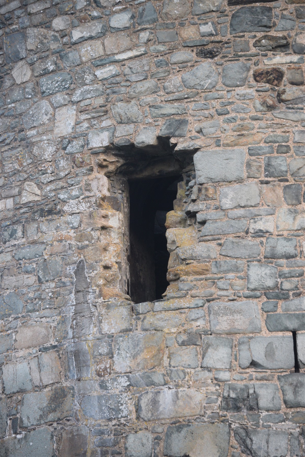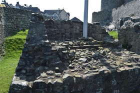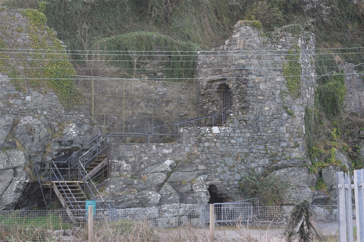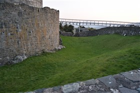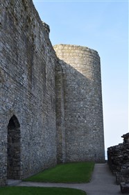 Masonry castle, now roofless; of limestone and granite construction faced with roughly-squared and coursed blocks; sandstone dressings to the openings; rock foundations. The castle is of the concentric type and occupies a tight, restricted site on a natural rock outcrop. The main defences consist of a four round towers placed at the corners of a roughly rectangular high-walled inner ward, with a lower-walled outer ward forming a narrow secondary line of defence. The latter broadly follows the line of the inner ward, though its walls have been reduced in height. In the centre of the inner ward's eastern (town-facing) wall is a large square gatehouse block. This consists of a pair of high D-shaped drum towers to the front, and a pair of narrower stair towers to the rear, the latter rising up two stages above the inner ward's corner towers and one stage above the paired front towers. The hall, chapel, service and storage buildings were ranged around the N, S and W sides, with the well located against the N wall. Of these buildings, only the walls of the gabled chapel stand to any height; the remainder is reduced to foundation level. The gatehouse housed the principal rooms, arranged as lavishly-appointed suites, one on each of the upper floors. The first-floor apartment probably served as the constable's quarters, whilst the upper floor rooms, of rather finer quality of detail, would have been reserved for important visitors such as the King and his circle. Access to these apartments was from the inner ward. Here an external stone stair, arranged in three straight flights, leads to a round-arched entrance off-centre to the L on the gatehouse's 3-window inner elevation. The windows to the upper apartments have finely-cut hollow-chamfered jambs and segmental heads, formerly with Decorated tracery lights, typical of the Edwardian Court Style. Various fragmentary fireplaces survive, mostly with stone hoods with decorative corbels. The gatehouse was conceived as an independently defensible unit, and correspondingly could withstand assault from the inner ward, should this be taken. The main approach is in the form of a tunnel entrance between the front towers. This leads through to the inner ward via a system of defences including portcullises, gates and murderholes. The portcullises were operated from the first floor and were therefore under the constable's direct control. The outer ward has a postern gate, comprising a gateway between small turrets, corbelled-out from the wall; a complex bridge system with further gates and a large drawbridge no longer survives. On the N side is a postern gate with small D-shaped drum towers. This gives access to 'Castle Rock', the rocky plateau which provides the site. A wall runs north-eastwards and curves around and down to protect the rock on this side. At the foot of the rock, at the north-western point, is the 'Gate-Next-the-Sea', where supplies were landed by ship. This gateway had its own drawbridge and portcullis system and was further covered by two rock-cut engine platforms above. It was linked to the main castle by a walled and defended track, known as the 'Way From the Sea', which winds its way up along the E and S sides of the rock. (Listed Building Report)