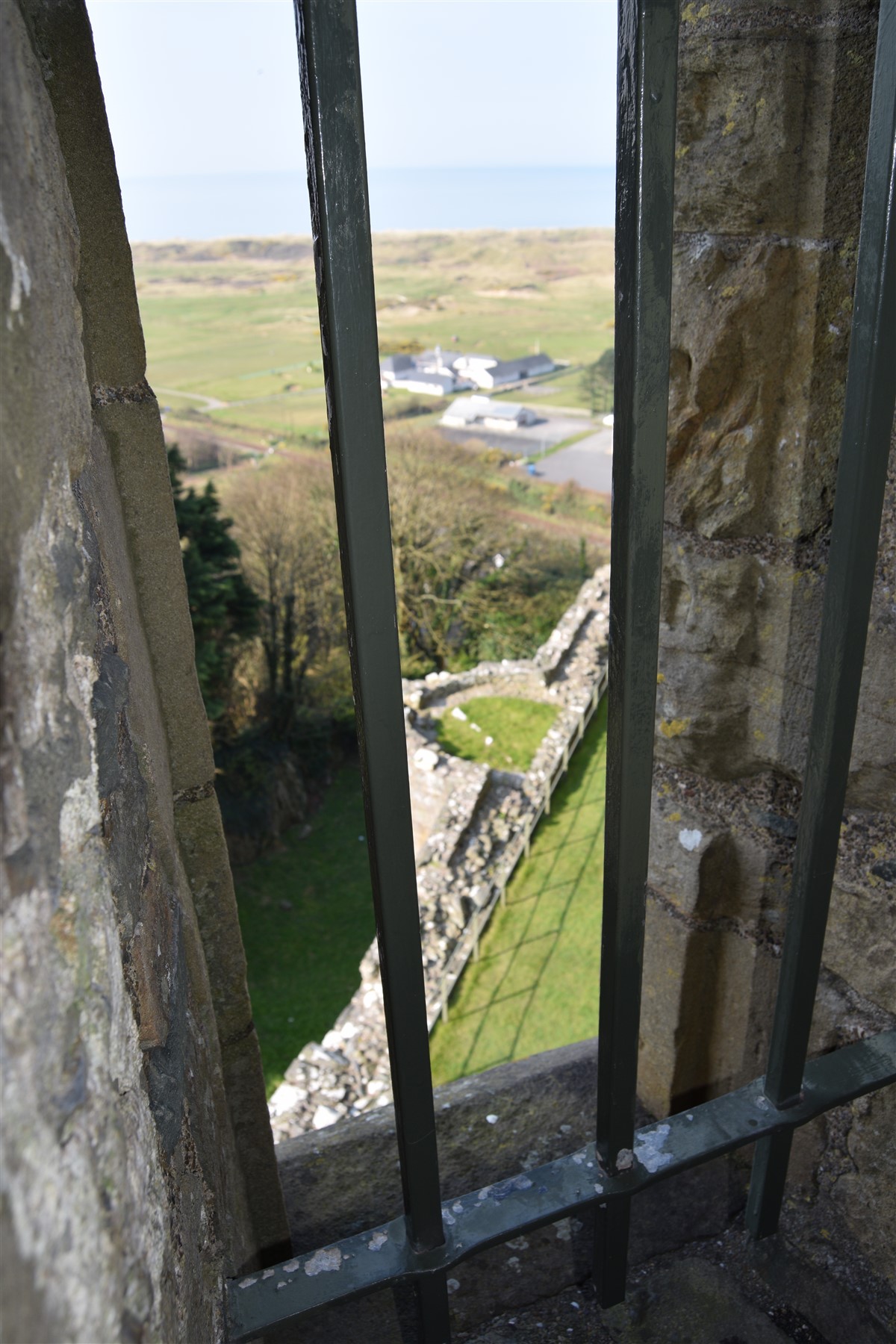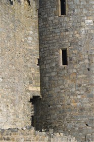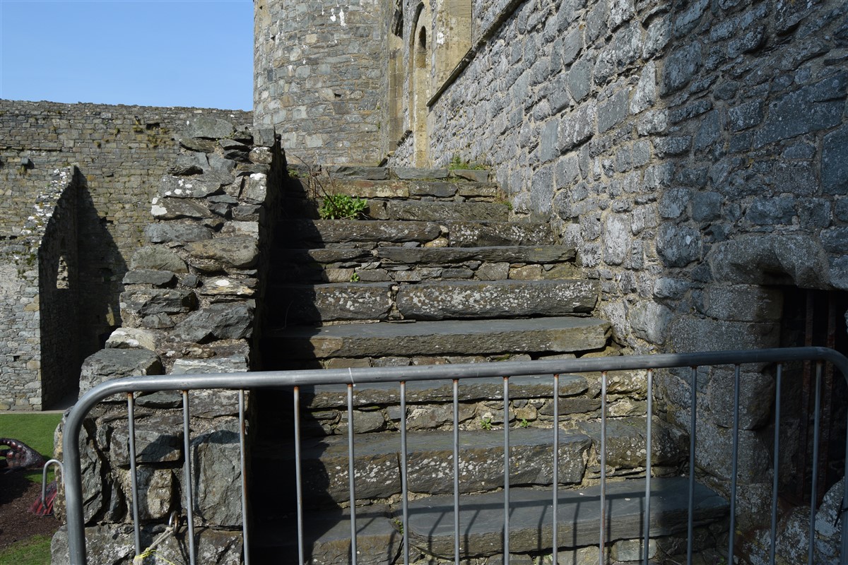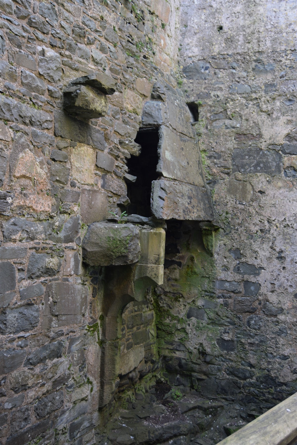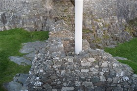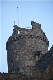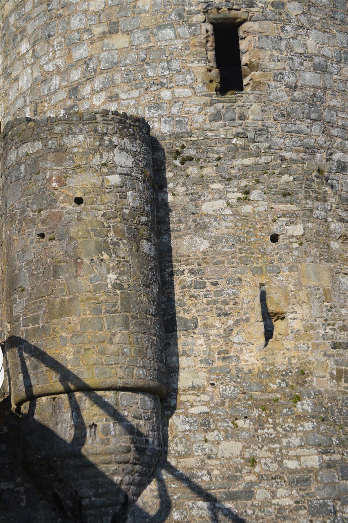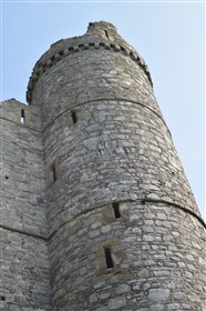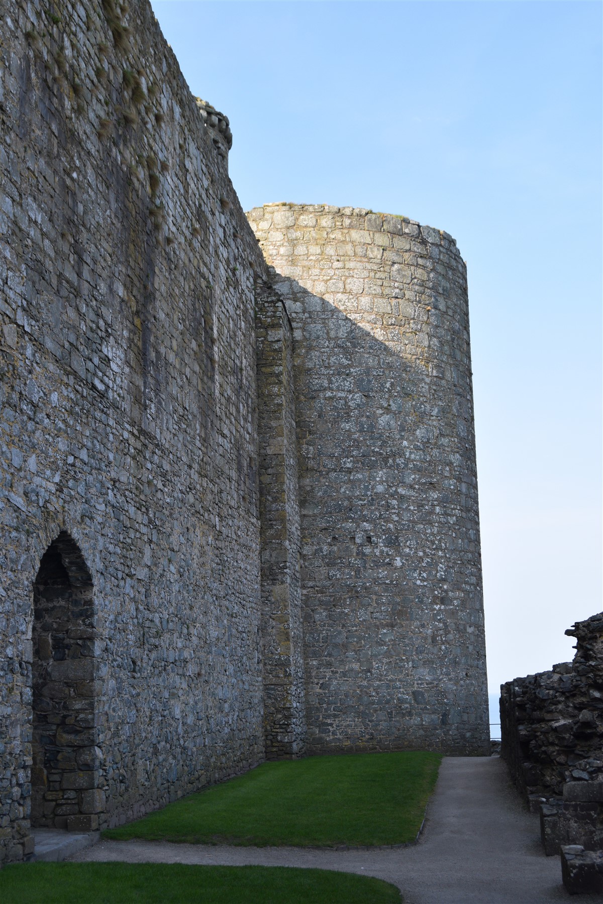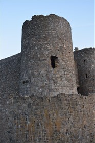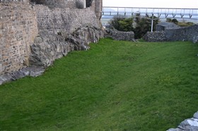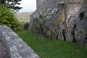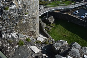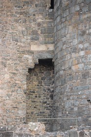 Masonry castle, now roofless; of limestone and granite construction faced with roughly-squared and coursed blocks; sandstone dressings to the openings; rock foundations. The castle is of the concentric type and occupies a tight, restricted site on a natural rock outcrop. The main defences consist of a four round towers placed at the corners of a roughly rectangular high-walled inner ward, with a lower-walled outer ward forming a narrow secondary line of defence. The latter broadly follows the line of the inner ward, though its walls have been reduced in height. In the centre of the inner ward's eastern (town-facing) wall is a large square gatehouse block. This consists of a pair of high D-shaped drum towers to the front, and a pair of narrower stair towers to the rear, the latter rising up two stages above the inner ward's corner towers and one stage above the paired front towers. The hall, chapel, service and storage buildings were ranged around the N, S and W sides, with the well located against the N wall. Of these buildings, only the walls of the gabled chapel stand to any height; the remainder is reduced to foundation level. The gatehouse housed the principal rooms, arranged as lavishly-appointed suites, one on each of the upper floors. The first-floor apartment probably served as the constable's quarters, whilst the upper floor rooms, of rather finer quality of detail, would have been reserved for important visitors such as the King and his circle. Access to these apartments was from the inner ward. Here an external stone stair, arranged in three straight flights, leads to a round-arched entrance off-centre to the L on the gatehouse's 3-window inner elevation. The windows to the upper apartments have finely-cut hollow-chamfered jambs and segmental heads, formerly with Decorated tracery lights, typical of the Edwardian Court Style. Various fragmentary fireplaces survive, mostly with stone hoods with decorative corbels. The gatehouse was conceived as an independently defensible unit, and correspondingly could withstand assault from the inner ward, should this be taken. The main approach is in the form of a tunnel entrance between the front towers. This leads through to the inner ward via a system of defences including portcullises, gates and murderholes. The portcullises were operated from the first floor and were therefore under the constable's direct control. The outer ward has a postern gate, comprising a gateway between small turrets, corbelled-out from the wall; a complex bridge system with further gates and a large drawbridge no longer survives. On the N side is a postern gate with small D-shaped drum towers. This gives access to 'Castle Rock', the rocky plateau which provides the site. A wall runs north-eastwards and curves around and down to protect the rock on this side. At the foot of the rock, at the north-western point, is the 'Gate-Next-the-Sea', where supplies were landed by ship. This gateway had its own drawbridge and portcullis system and was further covered by two rock-cut engine platforms above. It was linked to the main castle by a walled and defended track, known as the 'Way From the Sea', which winds its way up along the E and S sides of the rock. (Listed Building Report)