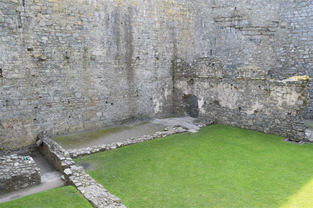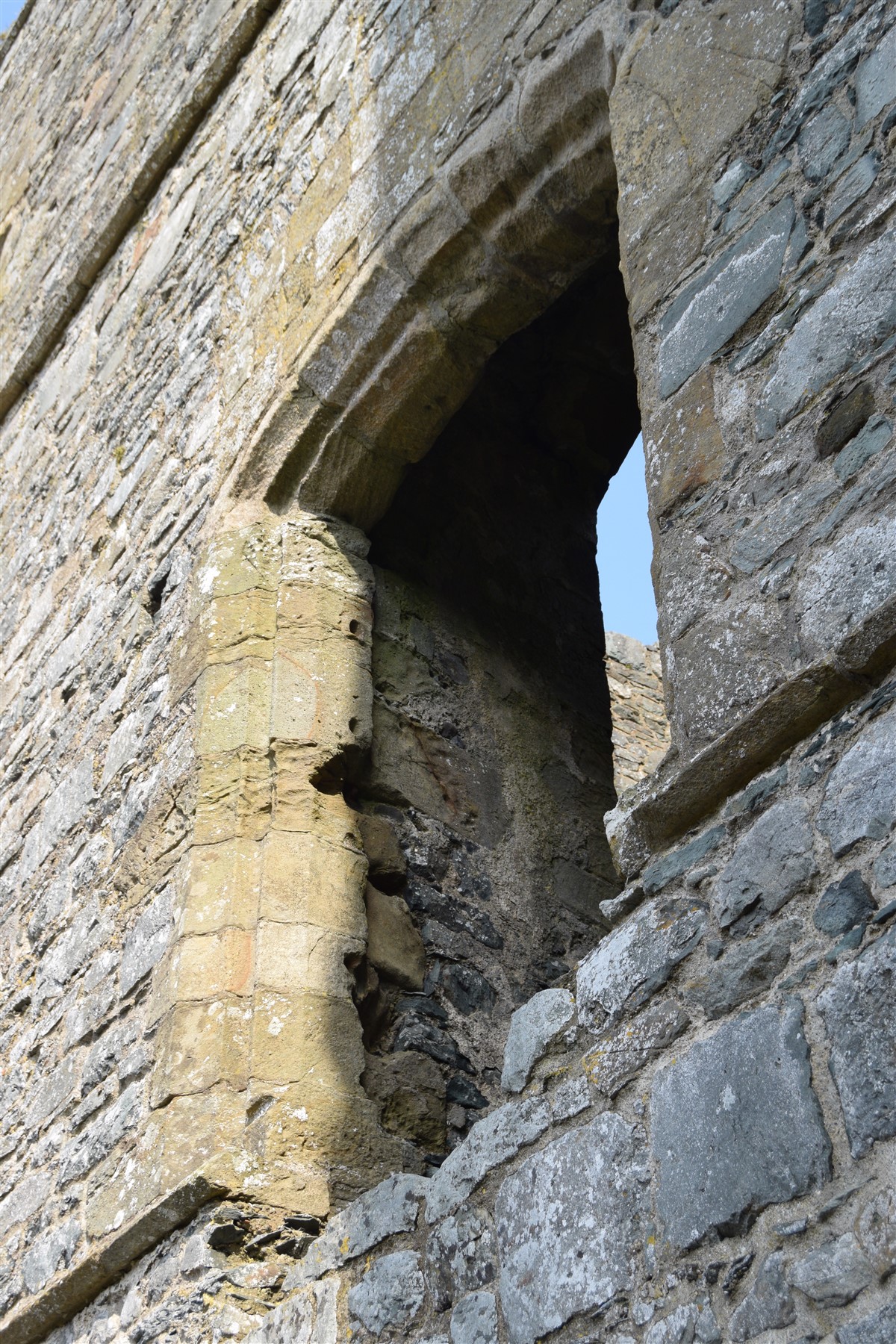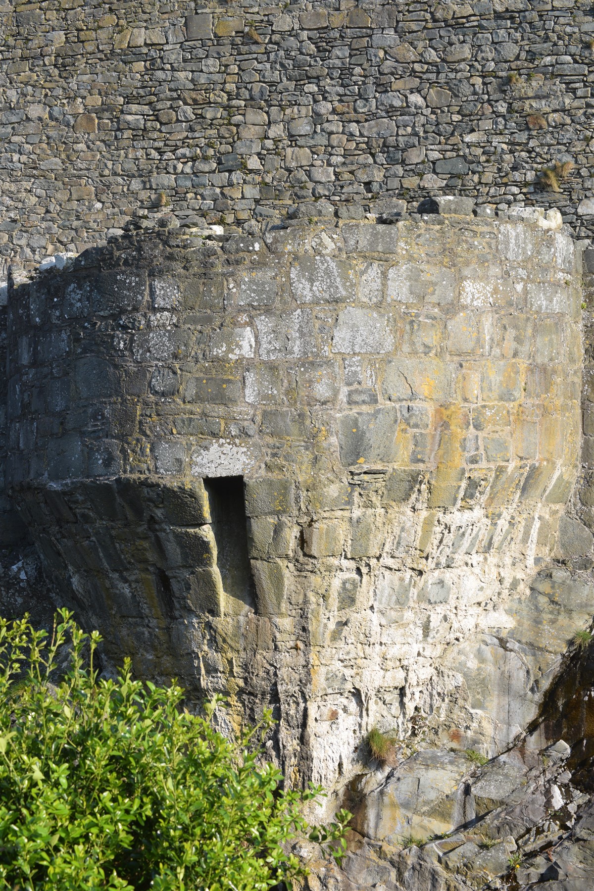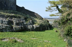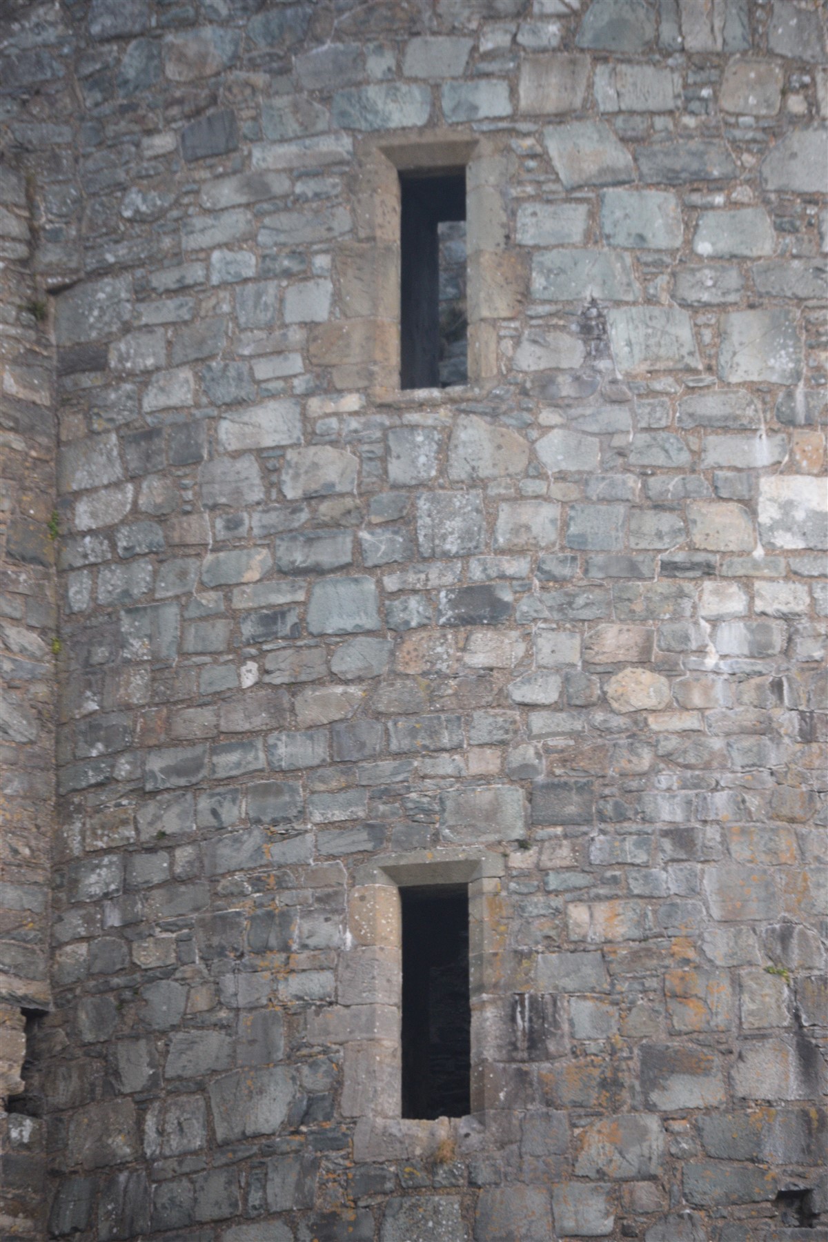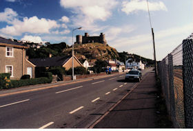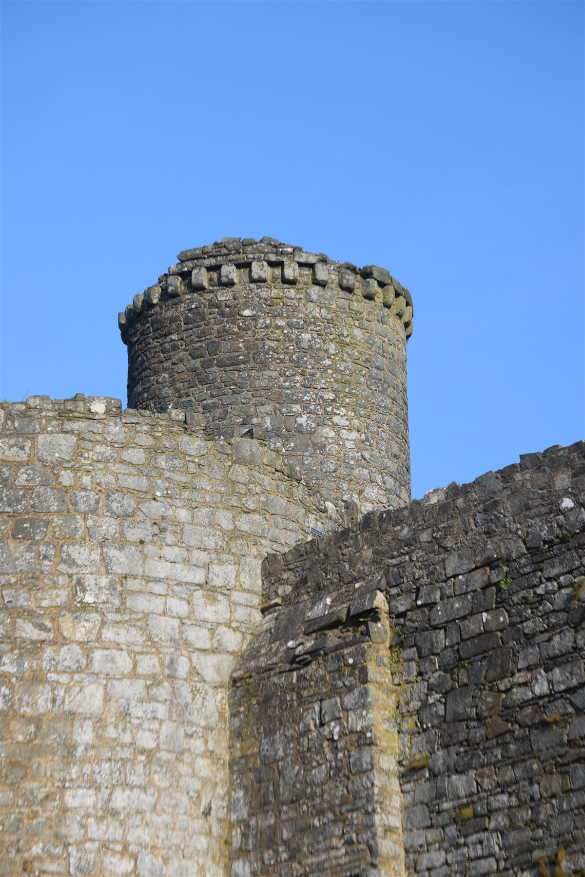Masonry castle, now roofless; of limestone and granite construction faced with roughly-squared and coursed blocks; sandstone dressings to the openings; rock foundations. The castle is of the concentric type and occupies a tight, restricted site on a natural rock outcrop. The main defences consist of a four round towers placed at the corners of a roughly rectangular high-walled inner ward, with a lower-walled outer ward forming a narrow secondary line of defence. The latter broadly follows the line of the inner ward, though its walls have been reduced in height. In the centre of the inner ward's eastern (town-facing) wall is a large square gatehouse block. This consists of a pair of high D-shaped drum towers to the front, and a pair of narrower stair towers to the rear, the latter rising up two stages above the inner ward's corner towers and one stage above the paired front towers. The hall, chapel, service and storage buildings were ranged around the N, S and W sides, with the well located against the N wall. Of these buildings, only the walls of the gabled chapel stand to any height; the remainder is reduced to foundation level. The gatehouse housed the principal rooms, arranged as lavishly-appointed suites, one on each of the upper floors. The first-floor apartment probably served as the constable's quarters, whilst the upper floor rooms, of rather finer quality of detail, would have been reserved for important visitors such as the King and his circle. Access to these apartments was from the inner ward. Here an external stone stair, arranged in three straight flights, leads to a round-arched entrance off-centre to the L on the gatehouse's 3-window inner elevation. The windows to the upper apartments have finely-cut hollow-chamfered jambs and segmental heads, formerly with Decorated tracery lights, typical of the Edwardian Court Style. Various fragmentary fireplaces survive, mostly with stone hoods with decorative corbels. The gatehouse was conceived as an independently defensible unit, and correspondingly could withstand assault from the inner ward, should this be taken. The main approach is in the form of a tunnel entrance between the front towers. This leads through to the inner ward via a system of defences including portcullises, gates and murderholes. The portcullises were operated from the first floor and were therefore under the constable's direct control. The outer ward has a postern gate, comprising a gateway between small turrets, corbelled-out from the wall; a complex bridge system with further gates and a large drawbridge no longer survives. On the N side is a postern gate with small D-shaped drum towers. This gives access to 'Castle Rock', the rocky plateau which provides the site. A wall runs north-eastwards and curves around and down to protect the rock on this side. At the foot of the rock, at the north-western point, is the 'Gate-Next-the-Sea', where supplies were landed by ship. This gateway had its own drawbridge and portcullis system and was further covered by two rock-cut engine platforms above. It was linked to the main castle by a walled and defended track, known as the 'Way From the Sea', which winds its way up along the E and S sides of the rock. (Listed Building Report)