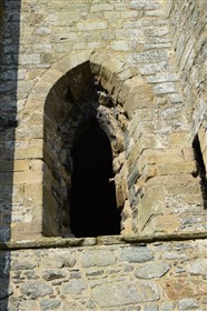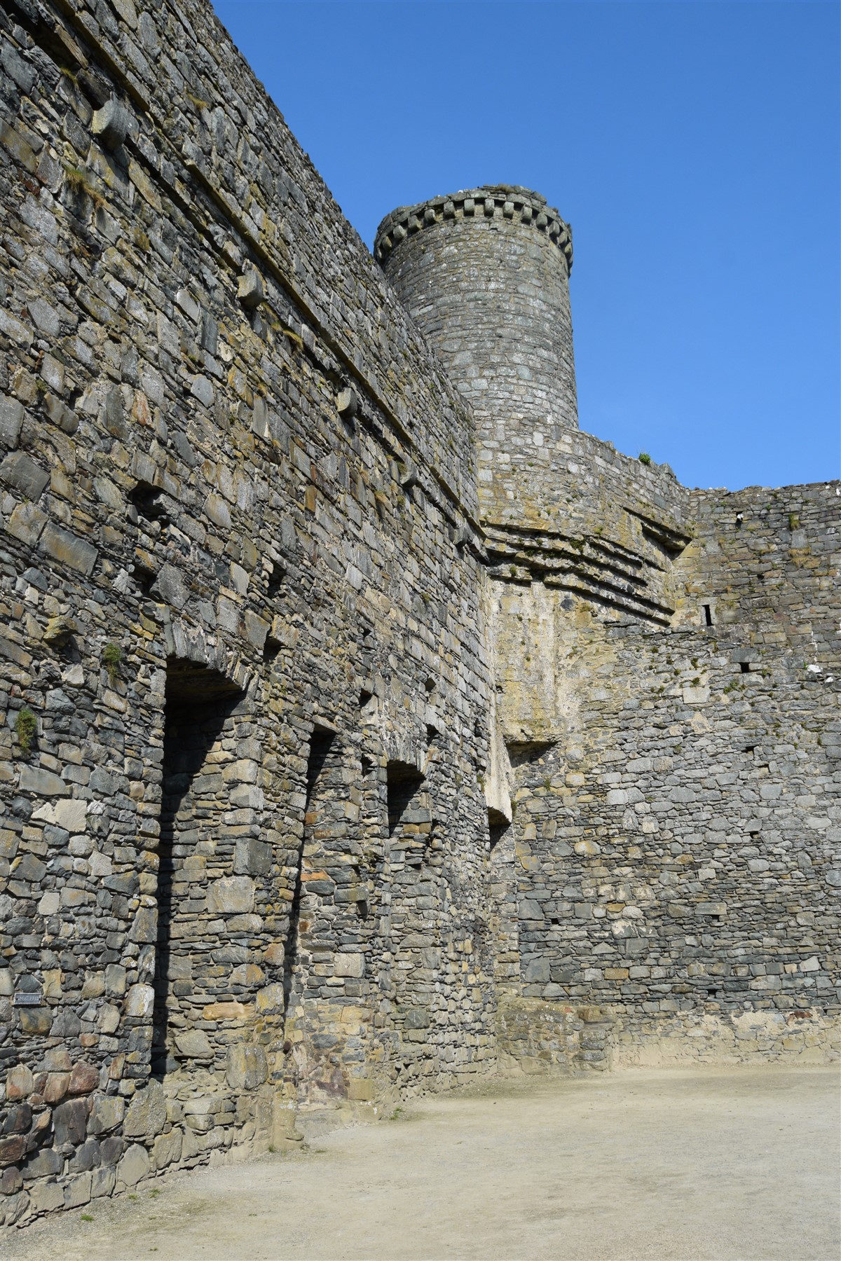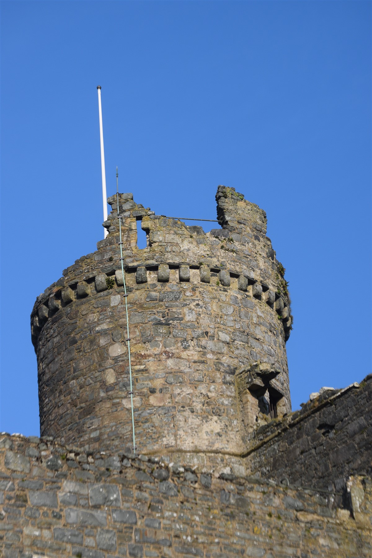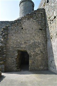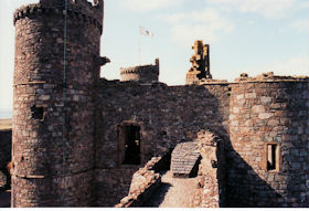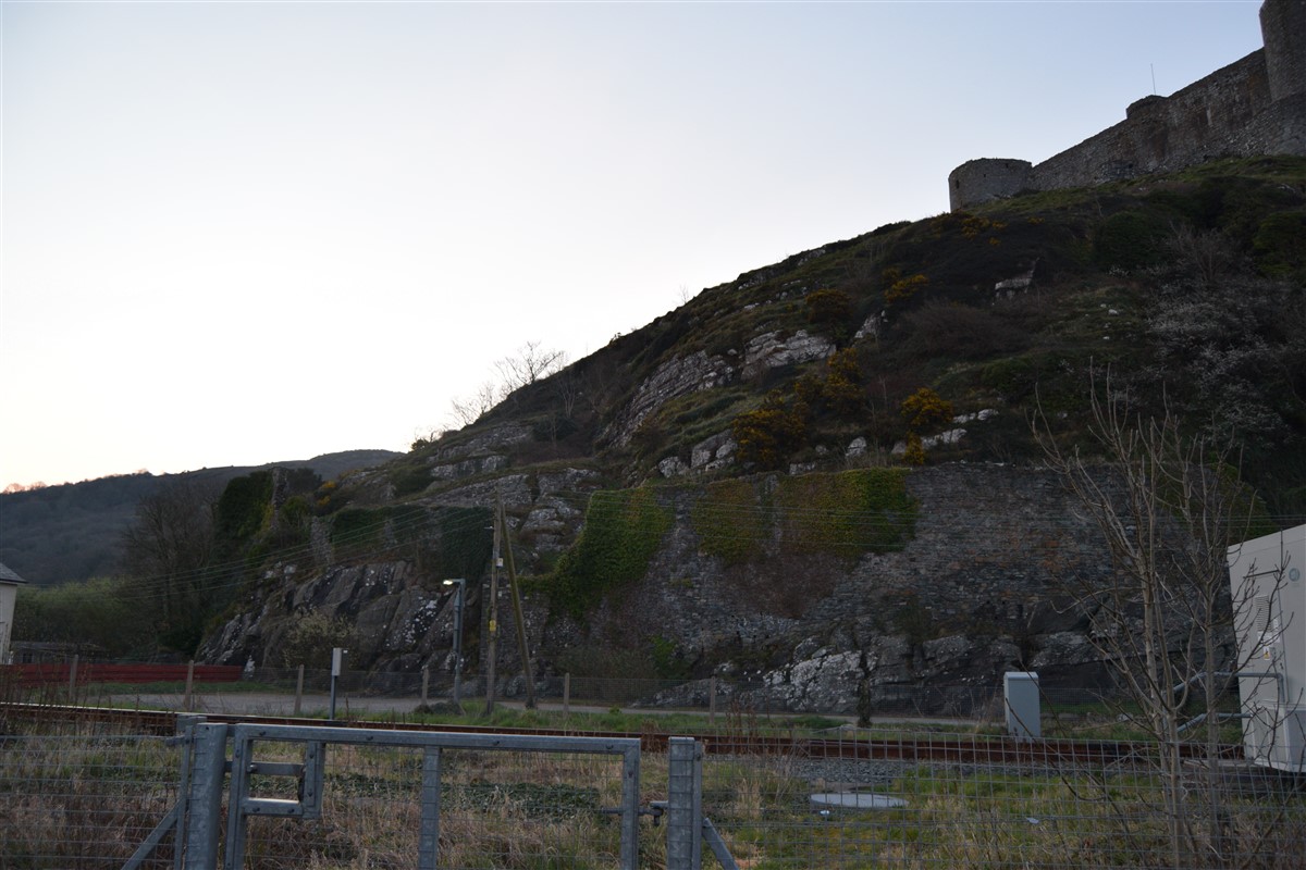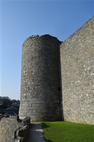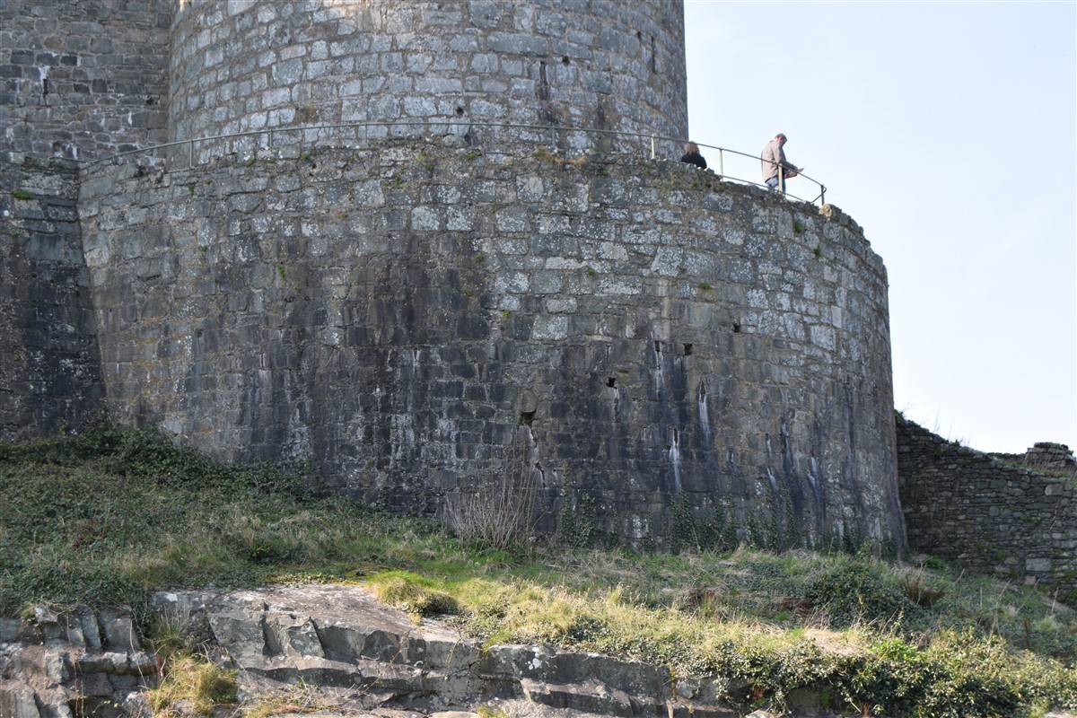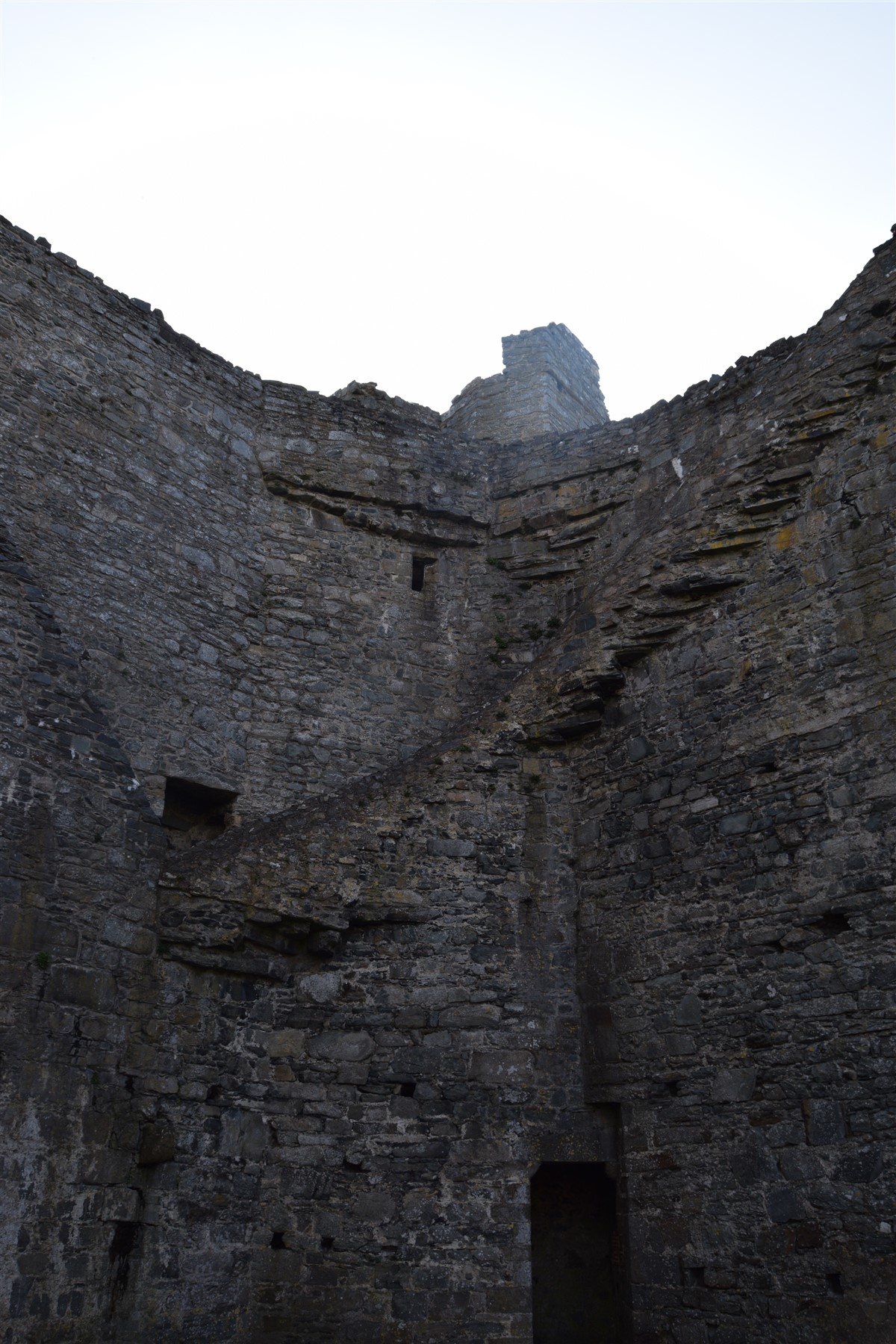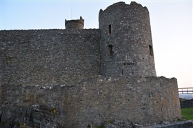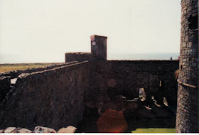 Masonry castle, now roofless; of limestone and granite construction faced with roughly-squared and coursed blocks; sandstone dressings to the openings; rock foundations. The castle is of the concentric type and occupies a tight, restricted site on a natural rock outcrop. The main defences consist of a four round towers placed at the corners of a roughly rectangular high-walled inner ward, with a lower-walled outer ward forming a narrow secondary line of defence. The latter broadly follows the line of the inner ward, though its walls have been reduced in height. In the centre of the inner ward's eastern (town-facing) wall is a large square gatehouse block. This consists of a pair of high D-shaped drum towers to the front, and a pair of narrower stair towers to the rear, the latter rising up two stages above the inner ward's corner towers and one stage above the paired front towers. The hall, chapel, service and storage buildings were ranged around the N, S and W sides, with the well located against the N wall. Of these buildings, only the walls of the gabled chapel stand to any height; the remainder is reduced to foundation level. The gatehouse housed the principal rooms, arranged as lavishly-appointed suites, one on each of the upper floors. The first-floor apartment probably served as the constable's quarters, whilst the upper floor rooms, of rather finer quality of detail, would have been reserved for important visitors such as the King and his circle. Access to these apartments was from the inner ward. Here an external stone stair, arranged in three straight flights, leads to a round-arched entrance off-centre to the L on the gatehouse's 3-window inner elevation. The windows to the upper apartments have finely-cut hollow-chamfered jambs and segmental heads, formerly with Decorated tracery lights, typical of the Edwardian Court Style. Various fragmentary fireplaces survive, mostly with stone hoods with decorative corbels. The gatehouse was conceived as an independently defensible unit, and correspondingly could withstand assault from the inner ward, should this be taken. The main approach is in the form of a tunnel entrance between the front towers. This leads through to the inner ward via a system of defences including portcullises, gates and murderholes. The portcullises were operated from the first floor and were therefore under the constable's direct control. The outer ward has a postern gate, comprising a gateway between small turrets, corbelled-out from the wall; a complex bridge system with further gates and a large drawbridge no longer survives. On the N side is a postern gate with small D-shaped drum towers. This gives access to 'Castle Rock', the rocky plateau which provides the site. A wall runs north-eastwards and curves around and down to protect the rock on this side. At the foot of the rock, at the north-western point, is the 'Gate-Next-the-Sea', where supplies were landed by ship. This gateway had its own drawbridge and portcullis system and was further covered by two rock-cut engine platforms above. It was linked to the main castle by a walled and defended track, known as the 'Way From the Sea', which winds its way up along the E and S sides of the rock. (Listed Building Report)