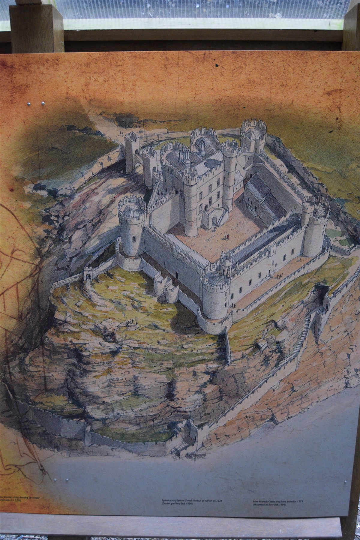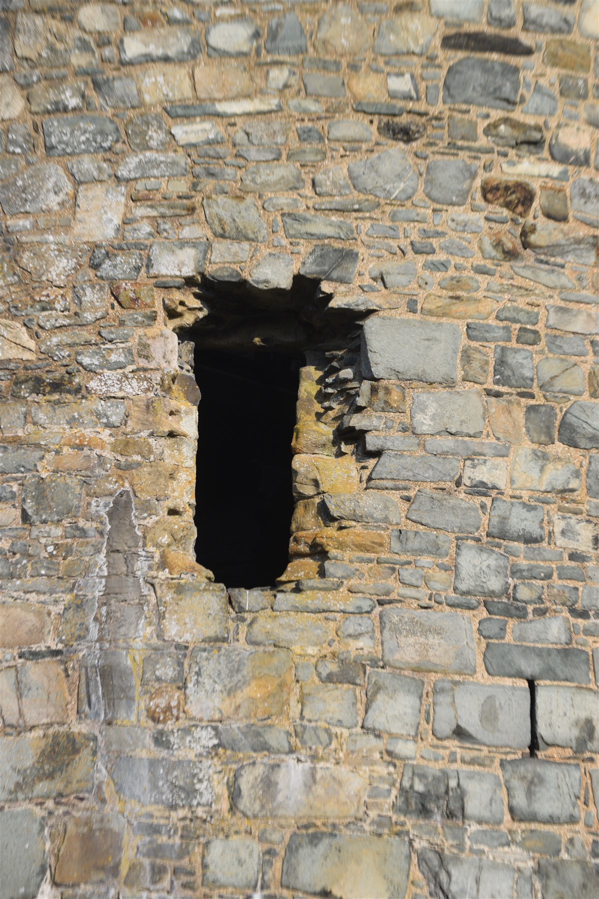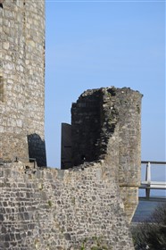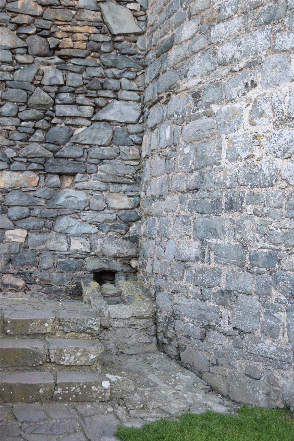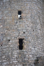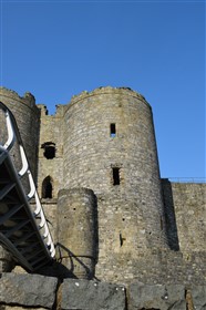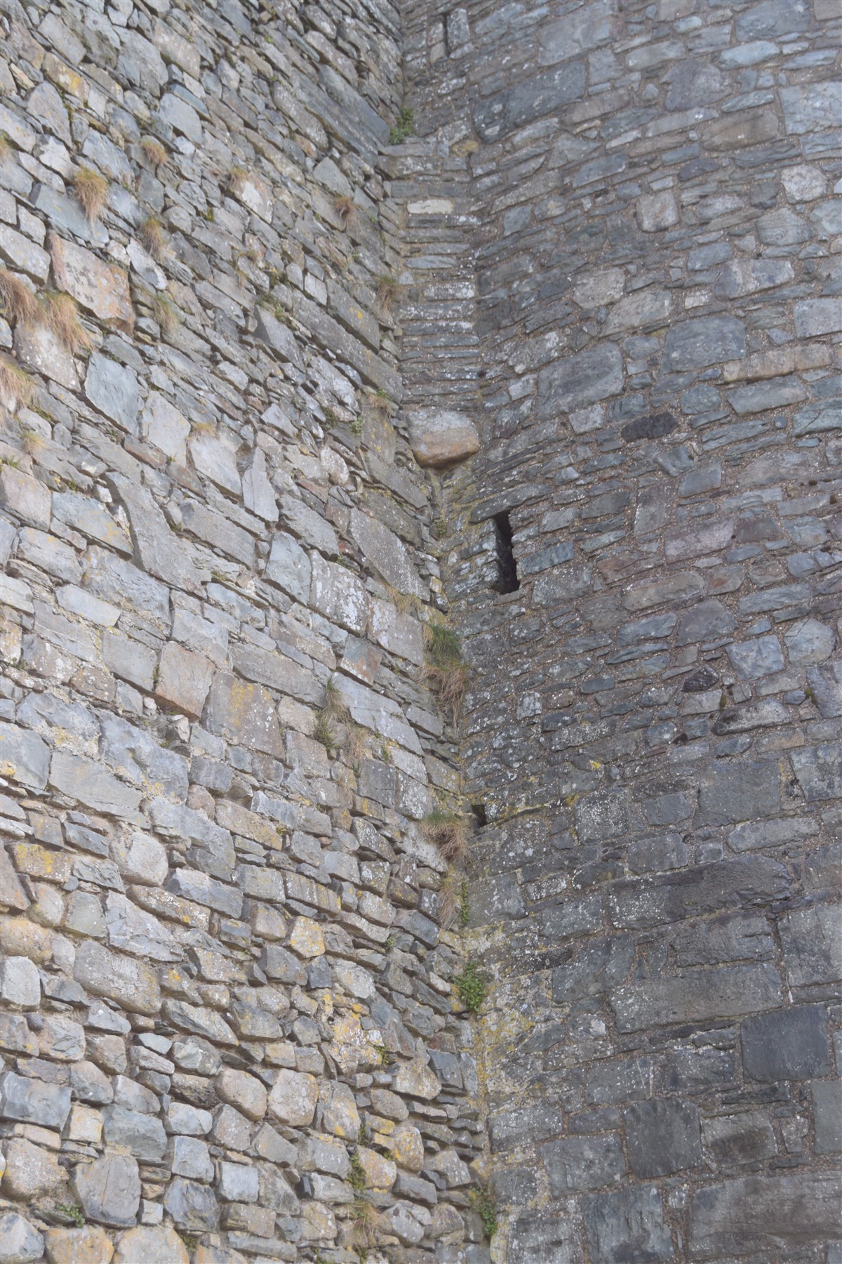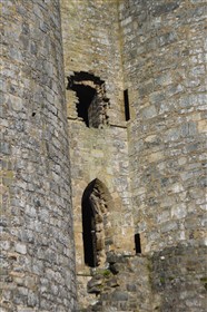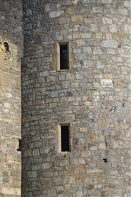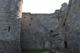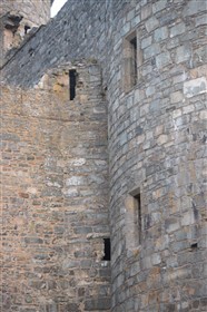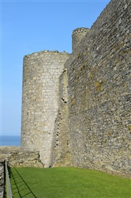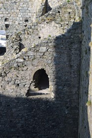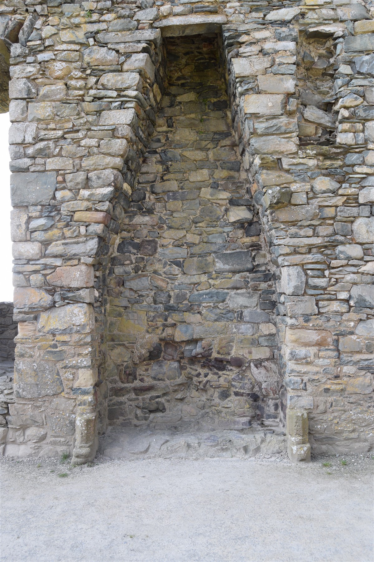 Masonry castle, now roofless; of limestone and granite construction faced with roughly-squared and coursed blocks; sandstone dressings to the openings; rock foundations. The castle is of the concentric type and occupies a tight, restricted site on a natural rock outcrop. The main defences consist of a four round towers placed at the corners of a roughly rectangular high-walled inner ward, with a lower-walled outer ward forming a narrow secondary line of defence. The latter broadly follows the line of the inner ward, though its walls have been reduced in height. In the centre of the inner ward's eastern (town-facing) wall is a large square gatehouse block. This consists of a pair of high D-shaped drum towers to the front, and a pair of narrower stair towers to the rear, the latter rising up two stages above the inner ward's corner towers and one stage above the paired front towers. The hall, chapel, service and storage buildings were ranged around the N, S and W sides, with the well located against the N wall. Of these buildings, only the walls of the gabled chapel stand to any height; the remainder is reduced to foundation level. The gatehouse housed the principal rooms, arranged as lavishly-appointed suites, one on each of the upper floors. The first-floor apartment probably served as the constable's quarters, whilst the upper floor rooms, of rather finer quality of detail, would have been reserved for important visitors such as the King and his circle. Access to these apartments was from the inner ward. Here an external stone stair, arranged in three straight flights, leads to a round-arched entrance off-centre to the L on the gatehouse's 3-window inner elevation. The windows to the upper apartments have finely-cut hollow-chamfered jambs and segmental heads, formerly with Decorated tracery lights, typical of the Edwardian Court Style. Various fragmentary fireplaces survive, mostly with stone hoods with decorative corbels. The gatehouse was conceived as an independently defensible unit, and correspondingly could withstand assault from the inner ward, should this be taken. The main approach is in the form of a tunnel entrance between the front towers. This leads through to the inner ward via a system of defences including portcullises, gates and murderholes. The portcullises were operated from the first floor and were therefore under the constable's direct control. The outer ward has a postern gate, comprising a gateway between small turrets, corbelled-out from the wall; a complex bridge system with further gates and a large drawbridge no longer survives. On the N side is a postern gate with small D-shaped drum towers. This gives access to 'Castle Rock', the rocky plateau which provides the site. A wall runs north-eastwards and curves around and down to protect the rock on this side. At the foot of the rock, at the north-western point, is the 'Gate-Next-the-Sea', where supplies were landed by ship. This gateway had its own drawbridge and portcullis system and was further covered by two rock-cut engine platforms above. It was linked to the main castle by a walled and defended track, known as the 'Way From the Sea', which winds its way up along the E and S sides of the rock. (Listed Building Report)