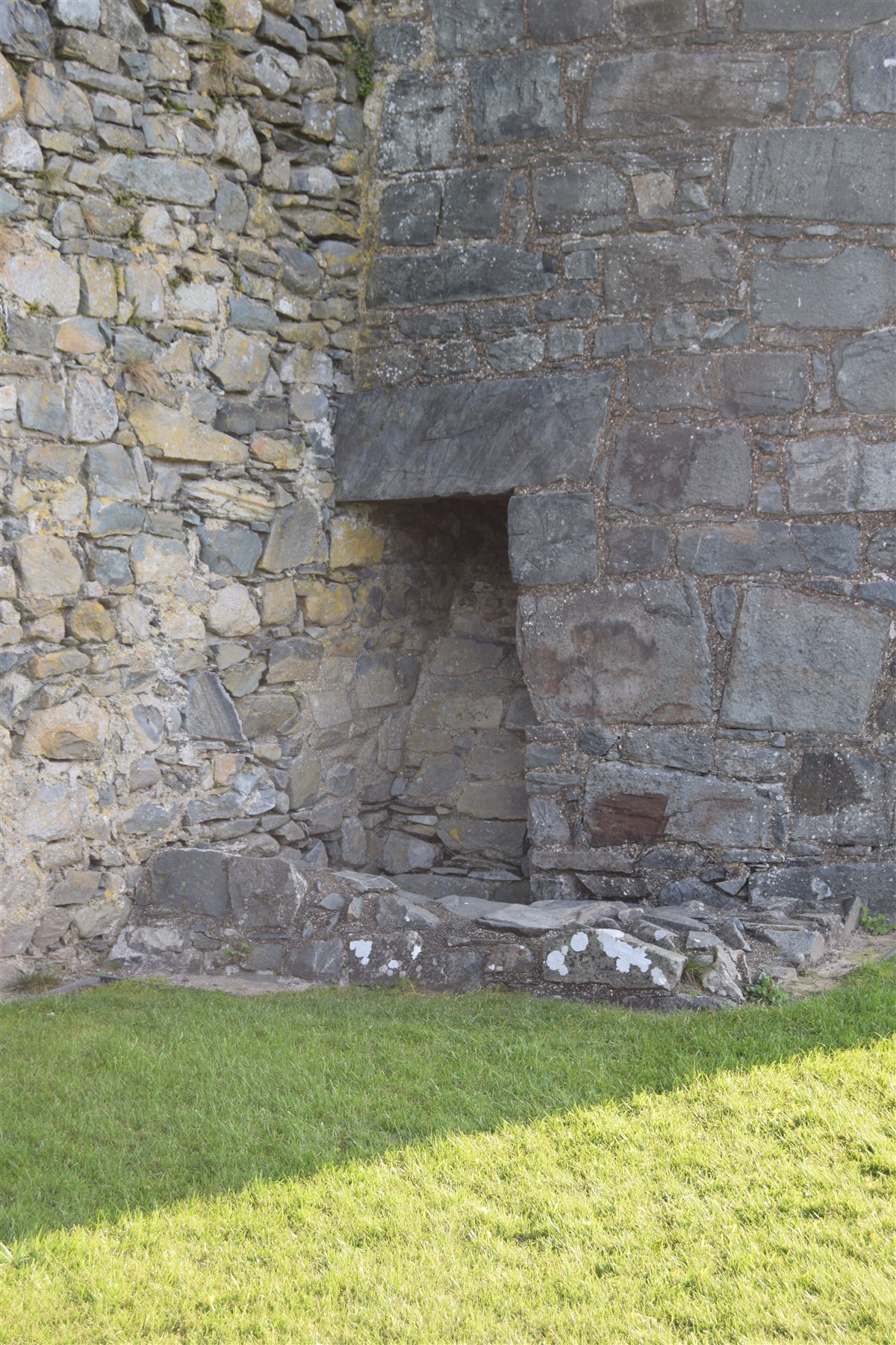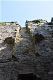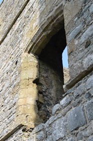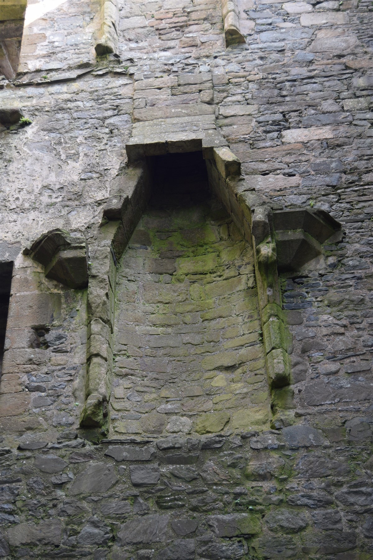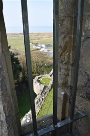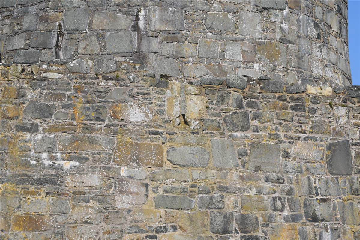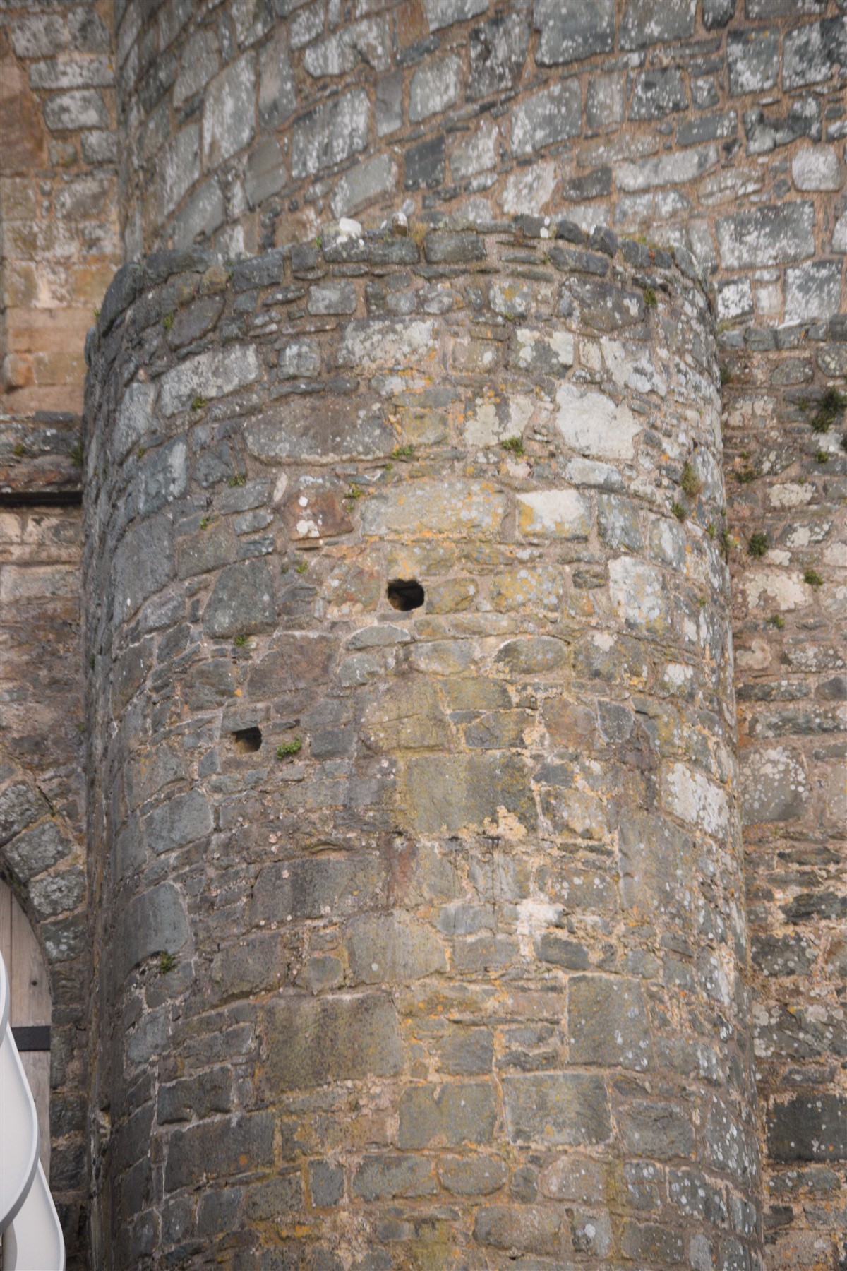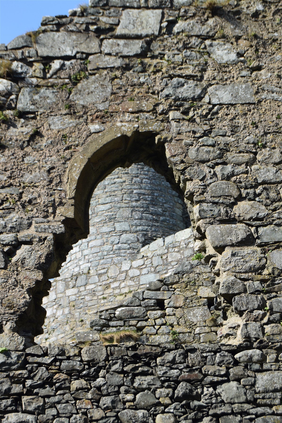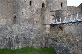 Masonry castle, now roofless; of limestone and granite construction faced with roughly-squared and coursed blocks; sandstone dressings to the openings; rock foundations. The castle is of the concentric type and occupies a tight, restricted site on a natural rock outcrop. The main defences consist of a four round towers placed at the corners of a roughly rectangular high-walled inner ward, with a lower-walled outer ward forming a narrow secondary line of defence. The latter broadly follows the line of the inner ward, though its walls have been reduced in height. In the centre of the inner ward's eastern (town-facing) wall is a large square gatehouse block. This consists of a pair of high D-shaped drum towers to the front, and a pair of narrower stair towers to the rear, the latter rising up two stages above the inner ward's corner towers and one stage above the paired front towers. The hall, chapel, service and storage buildings were ranged around the N, S and W sides, with the well located against the N wall. Of these buildings, only the walls of the gabled chapel stand to any height; the remainder is reduced to foundation level. The gatehouse housed the principal rooms, arranged as lavishly-appointed suites, one on each of the upper floors. The first-floor apartment probably served as the constable's quarters, whilst the upper floor rooms, of rather finer quality of detail, would have been reserved for important visitors such as the King and his circle. Access to these apartments was from the inner ward. Here an external stone stair, arranged in three straight flights, leads to a round-arched entrance off-centre to the L on the gatehouse's 3-window inner elevation. The windows to the upper apartments have finely-cut hollow-chamfered jambs and segmental heads, formerly with Decorated tracery lights, typical of the Edwardian Court Style. Various fragmentary fireplaces survive, mostly with stone hoods with decorative corbels. The gatehouse was conceived as an independently defensible unit, and correspondingly could withstand assault from the inner ward, should this be taken. The main approach is in the form of a tunnel entrance between the front towers. This leads through to the inner ward via a system of defences including portcullises, gates and murderholes. The portcullises were operated from the first floor and were therefore under the constable's direct control. The outer ward has a postern gate, comprising a gateway between small turrets, corbelled-out from the wall; a complex bridge system with further gates and a large drawbridge no longer survives. On the N side is a postern gate with small D-shaped drum towers. This gives access to 'Castle Rock', the rocky plateau which provides the site. A wall runs north-eastwards and curves around and down to protect the rock on this side. At the foot of the rock, at the north-western point, is the 'Gate-Next-the-Sea', where supplies were landed by ship. This gateway had its own drawbridge and portcullis system and was further covered by two rock-cut engine platforms above. It was linked to the main castle by a walled and defended track, known as the 'Way From the Sea', which winds its way up along the E and S sides of the rock. (Listed Building Report)