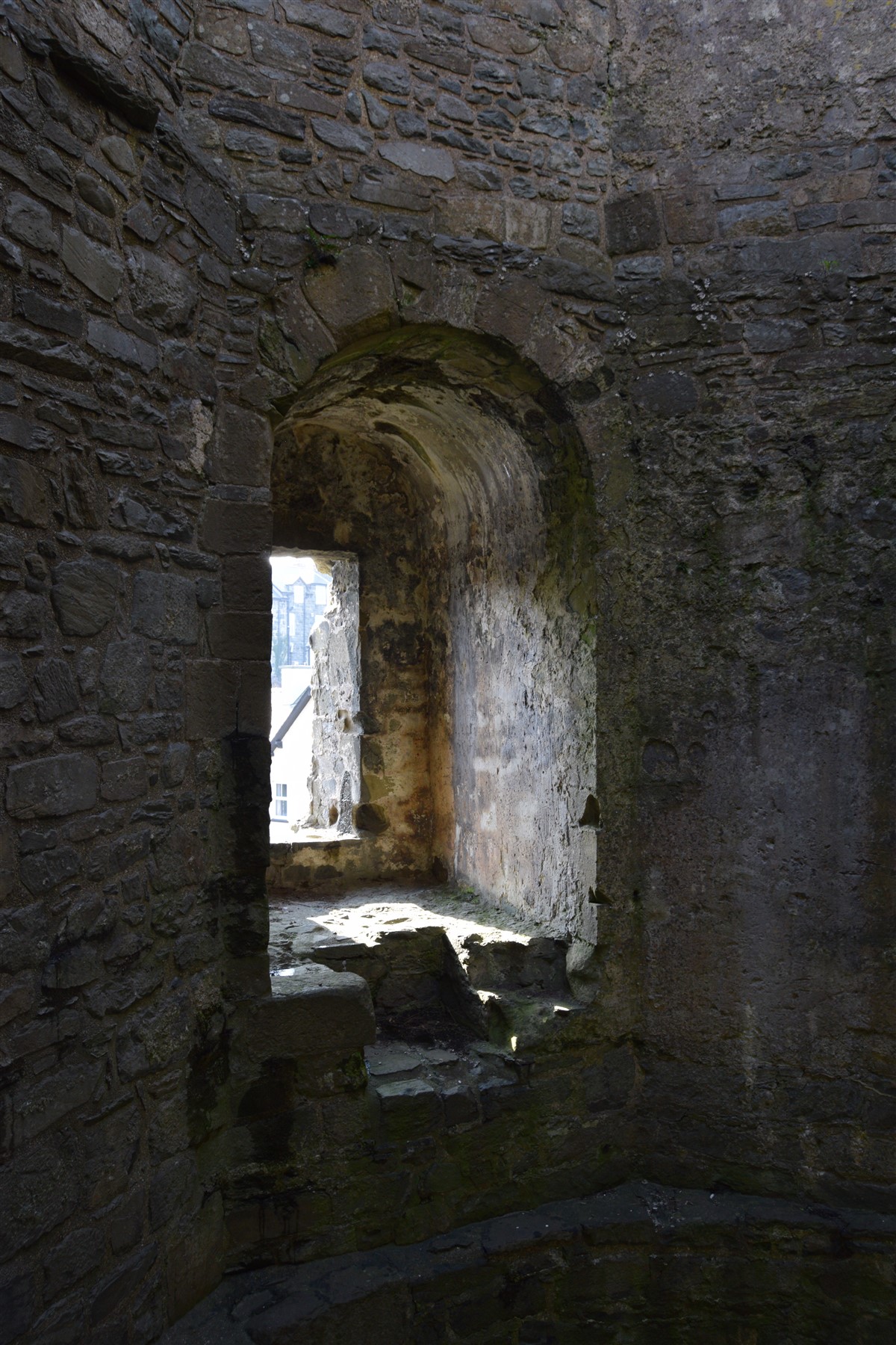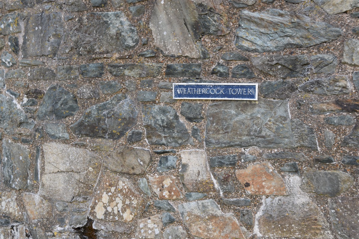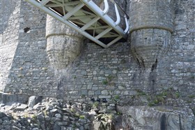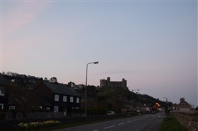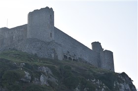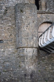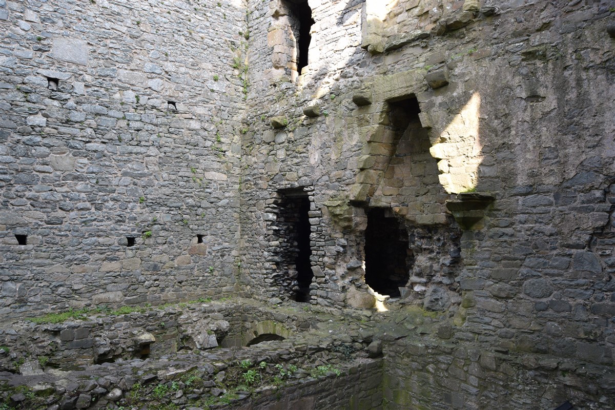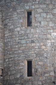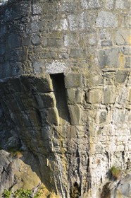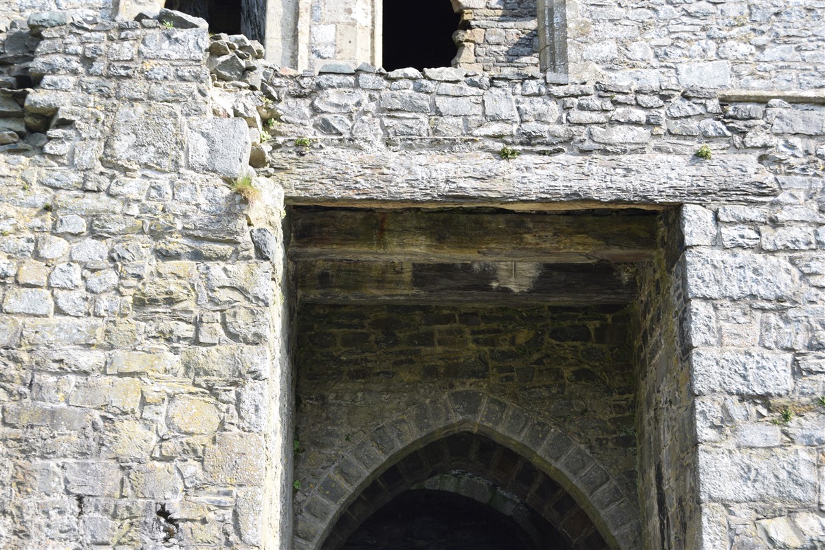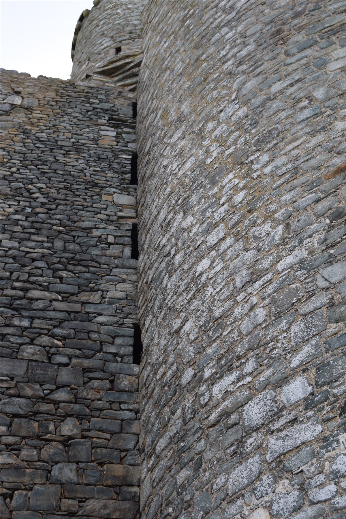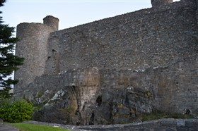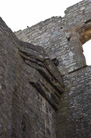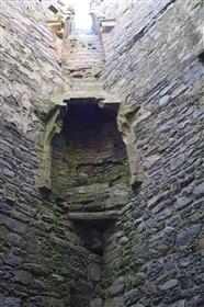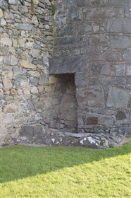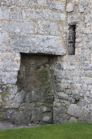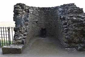Masonry castle, now roofless; of limestone and granite construction faced with roughly-squared and coursed blocks; sandstone dressings to the openings; rock foundations. The castle is of the concentric type and occupies a tight, restricted site on a natural rock outcrop. The main defences consist of a four round towers placed at the corners of a roughly rectangular high-walled inner ward, with a lower-walled outer ward forming a narrow secondary line of defence. The latter broadly follows the line of the inner ward, though its walls have been reduced in height. In the centre of the inner ward's eastern (town-facing) wall is a large square gatehouse block. This consists of a pair of high D-shaped drum towers to the front, and a pair of narrower stair towers to the rear, the latter rising up two stages above the inner ward's corner towers and one stage above the paired front towers. The hall, chapel, service and storage buildings were ranged around the N, S and W sides, with the well located against the N wall. Of these buildings, only the walls of the gabled chapel stand to any height; the remainder is reduced to foundation level. The gatehouse housed the principal rooms, arranged as lavishly-appointed suites, one on each of the upper floors. The first-floor apartment probably served as the constable's quarters, whilst the upper floor rooms, of rather finer quality of detail, would have been reserved for important visitors such as the King and his circle. Access to these apartments was from the inner ward. Here an external stone stair, arranged in three straight flights, leads to a round-arched entrance off-centre to the L on the gatehouse's 3-window inner elevation. The windows to the upper apartments have finely-cut hollow-chamfered jambs and segmental heads, formerly with Decorated tracery lights, typical of the Edwardian Court Style. Various fragmentary fireplaces survive, mostly with stone hoods with decorative corbels. The gatehouse was conceived as an independently defensible unit, and correspondingly could withstand assault from the inner ward, should this be taken. The main approach is in the form of a tunnel entrance between the front towers. This leads through to the inner ward via a system of defences including portcullises, gates and murderholes. The portcullises were operated from the first floor and were therefore under the constable's direct control. The outer ward has a postern gate, comprising a gateway between small turrets, corbelled-out from the wall; a complex bridge system with further gates and a large drawbridge no longer survives. On the N side is a postern gate with small D-shaped drum towers. This gives access to 'Castle Rock', the rocky plateau which provides the site. A wall runs north-eastwards and curves around and down to protect the rock on this side. At the foot of the rock, at the north-western point, is the 'Gate-Next-the-Sea', where supplies were landed by ship. This gateway had its own drawbridge and portcullis system and was further covered by two rock-cut engine platforms above. It was linked to the main castle by a walled and defended track, known as the 'Way From the Sea', which winds its way up along the E and S sides of the rock. (Listed Building Report)