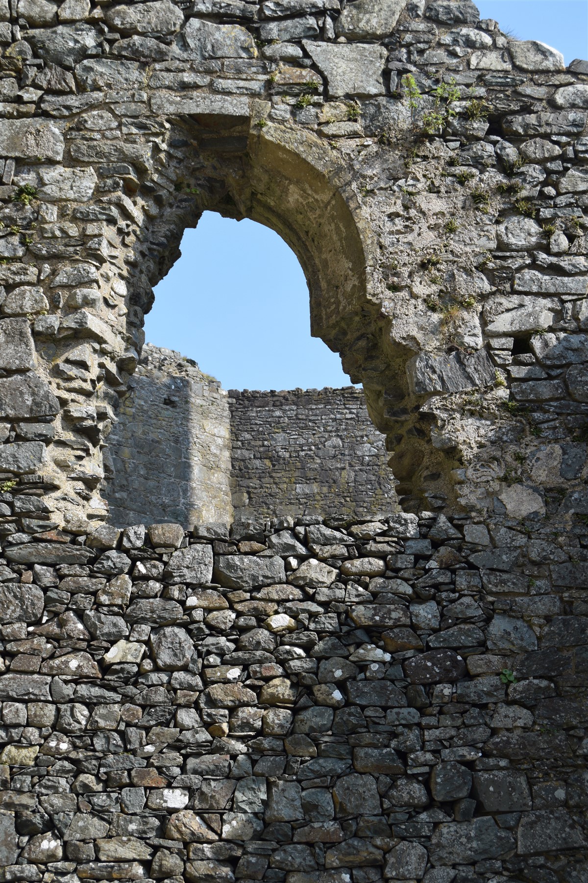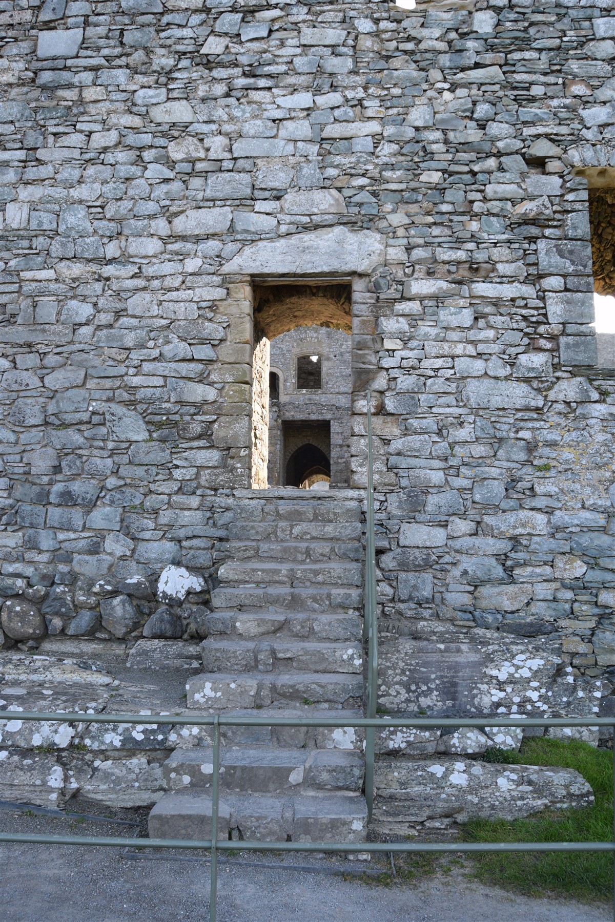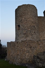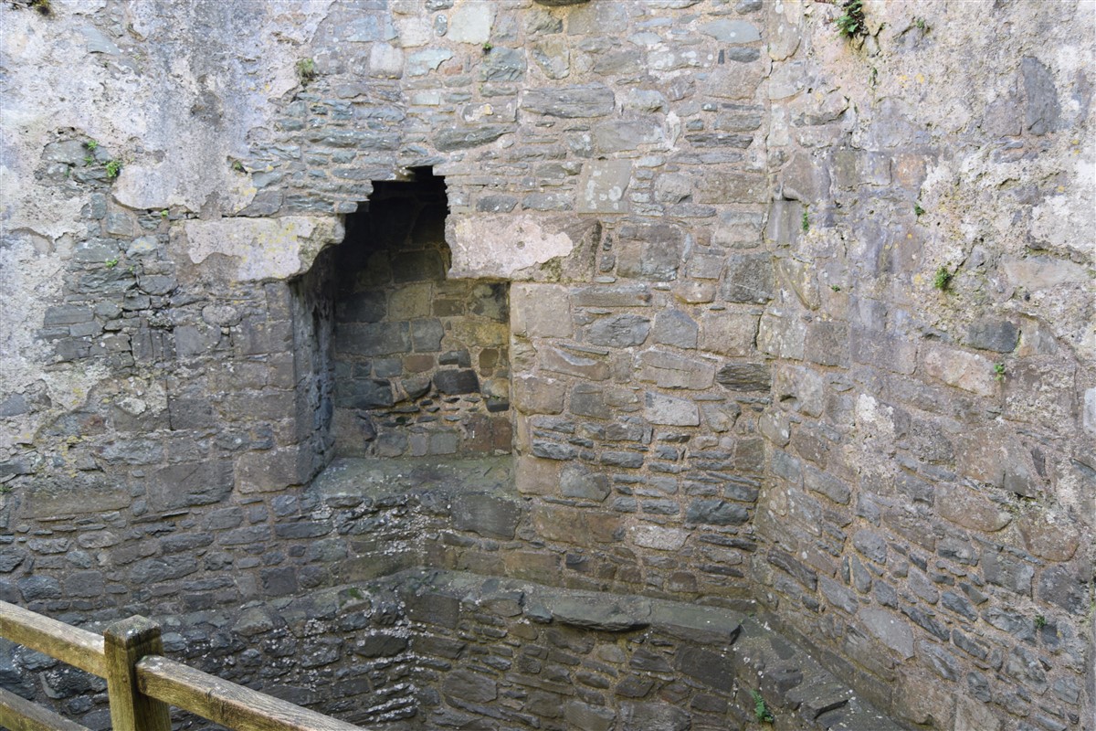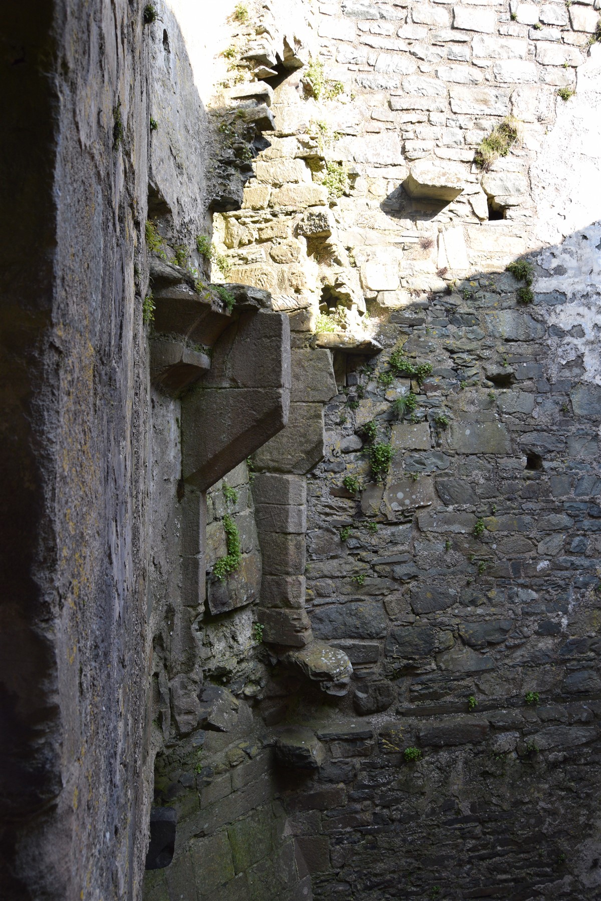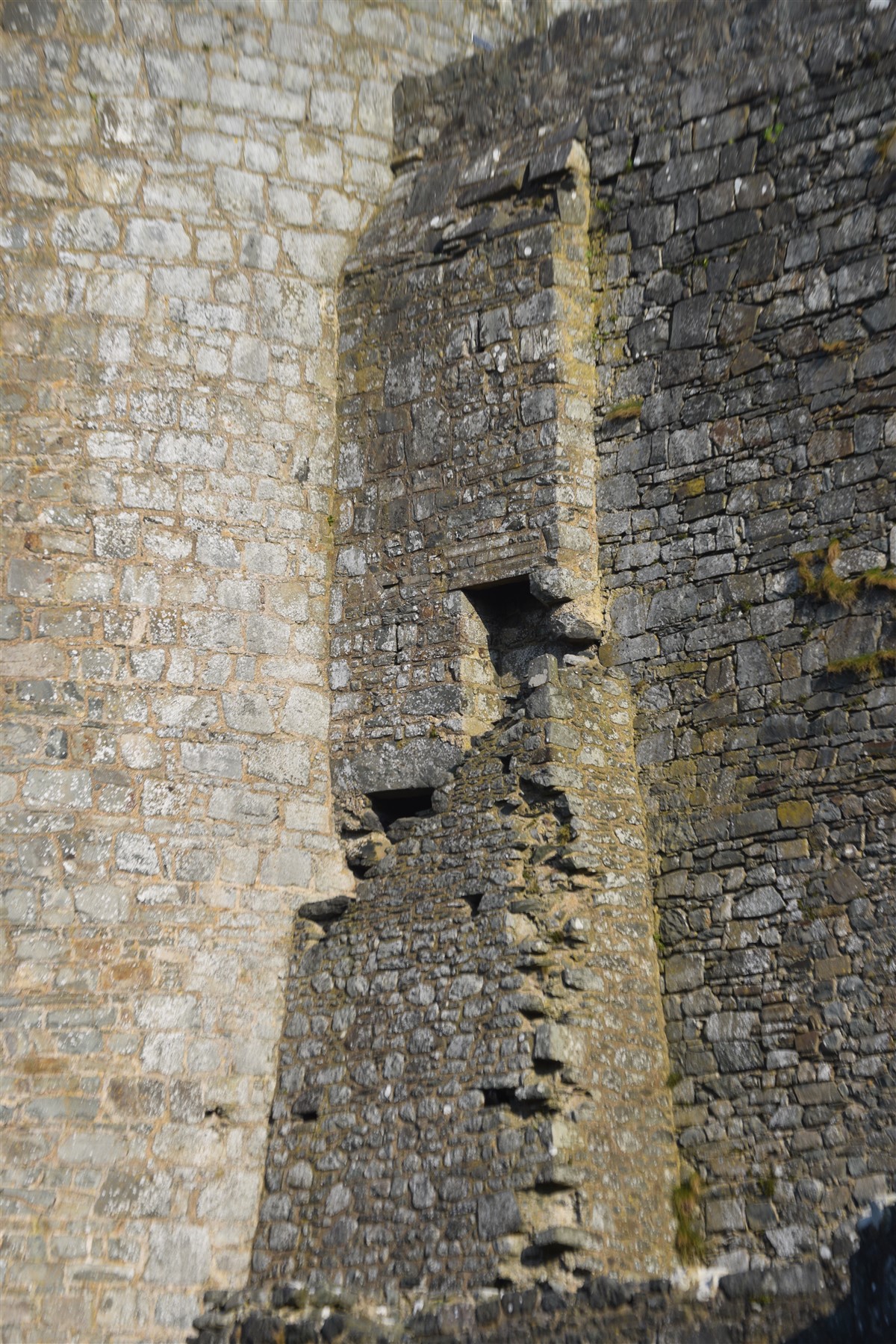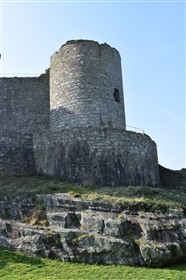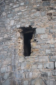 Masonry castle, now roofless; of limestone and granite construction faced with roughly-squared and coursed blocks; sandstone dressings to the openings; rock foundations. The castle is of the concentric type and occupies a tight, restricted site on a natural rock outcrop. The main defences consist of a four round towers placed at the corners of a roughly rectangular high-walled inner ward, with a lower-walled outer ward forming a narrow secondary line of defence. The latter broadly follows the line of the inner ward, though its walls have been reduced in height. In the centre of the inner ward's eastern (town-facing) wall is a large square gatehouse block. This consists of a pair of high D-shaped drum towers to the front, and a pair of narrower stair towers to the rear, the latter rising up two stages above the inner ward's corner towers and one stage above the paired front towers. The hall, chapel, service and storage buildings were ranged around the N, S and W sides, with the well located against the N wall. Of these buildings, only the walls of the gabled chapel stand to any height; the remainder is reduced to foundation level. The gatehouse housed the principal rooms, arranged as lavishly-appointed suites, one on each of the upper floors. The first-floor apartment probably served as the constable's quarters, whilst the upper floor rooms, of rather finer quality of detail, would have been reserved for important visitors such as the King and his circle. Access to these apartments was from the inner ward. Here an external stone stair, arranged in three straight flights, leads to a round-arched entrance off-centre to the L on the gatehouse's 3-window inner elevation. The windows to the upper apartments have finely-cut hollow-chamfered jambs and segmental heads, formerly with Decorated tracery lights, typical of the Edwardian Court Style. Various fragmentary fireplaces survive, mostly with stone hoods with decorative corbels. The gatehouse was conceived as an independently defensible unit, and correspondingly could withstand assault from the inner ward, should this be taken. The main approach is in the form of a tunnel entrance between the front towers. This leads through to the inner ward via a system of defences including portcullises, gates and murderholes. The portcullises were operated from the first floor and were therefore under the constable's direct control. The outer ward has a postern gate, comprising a gateway between small turrets, corbelled-out from the wall; a complex bridge system with further gates and a large drawbridge no longer survives. On the N side is a postern gate with small D-shaped drum towers. This gives access to 'Castle Rock', the rocky plateau which provides the site. A wall runs north-eastwards and curves around and down to protect the rock on this side. At the foot of the rock, at the north-western point, is the 'Gate-Next-the-Sea', where supplies were landed by ship. This gateway had its own drawbridge and portcullis system and was further covered by two rock-cut engine platforms above. It was linked to the main castle by a walled and defended track, known as the 'Way From the Sea', which winds its way up along the E and S sides of the rock. (Listed Building Report)