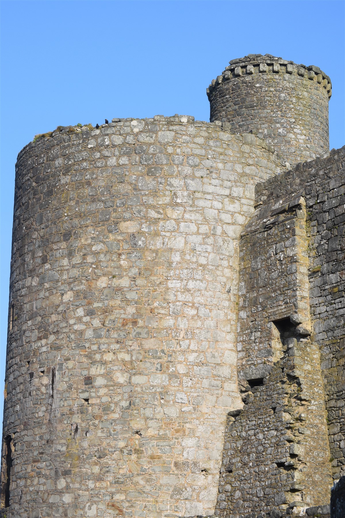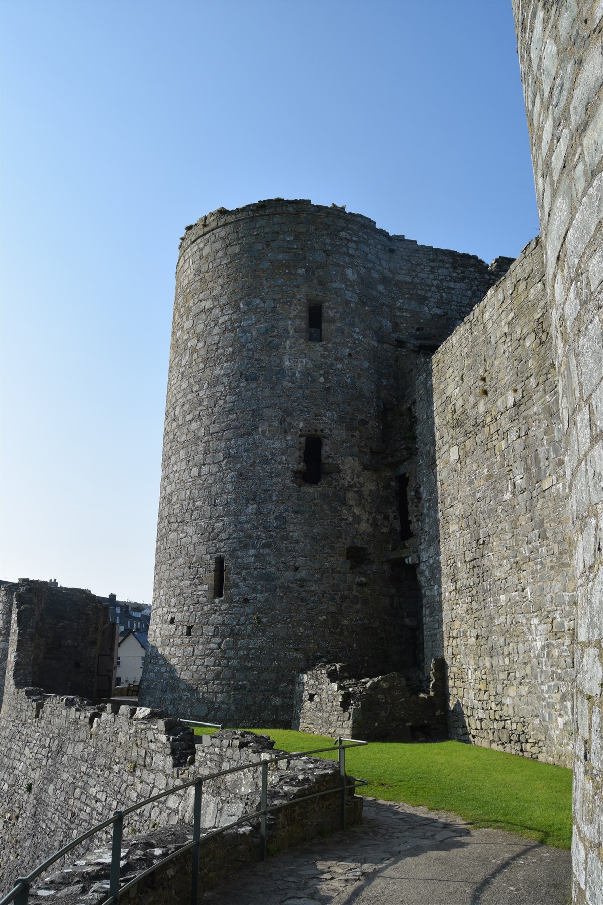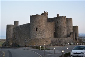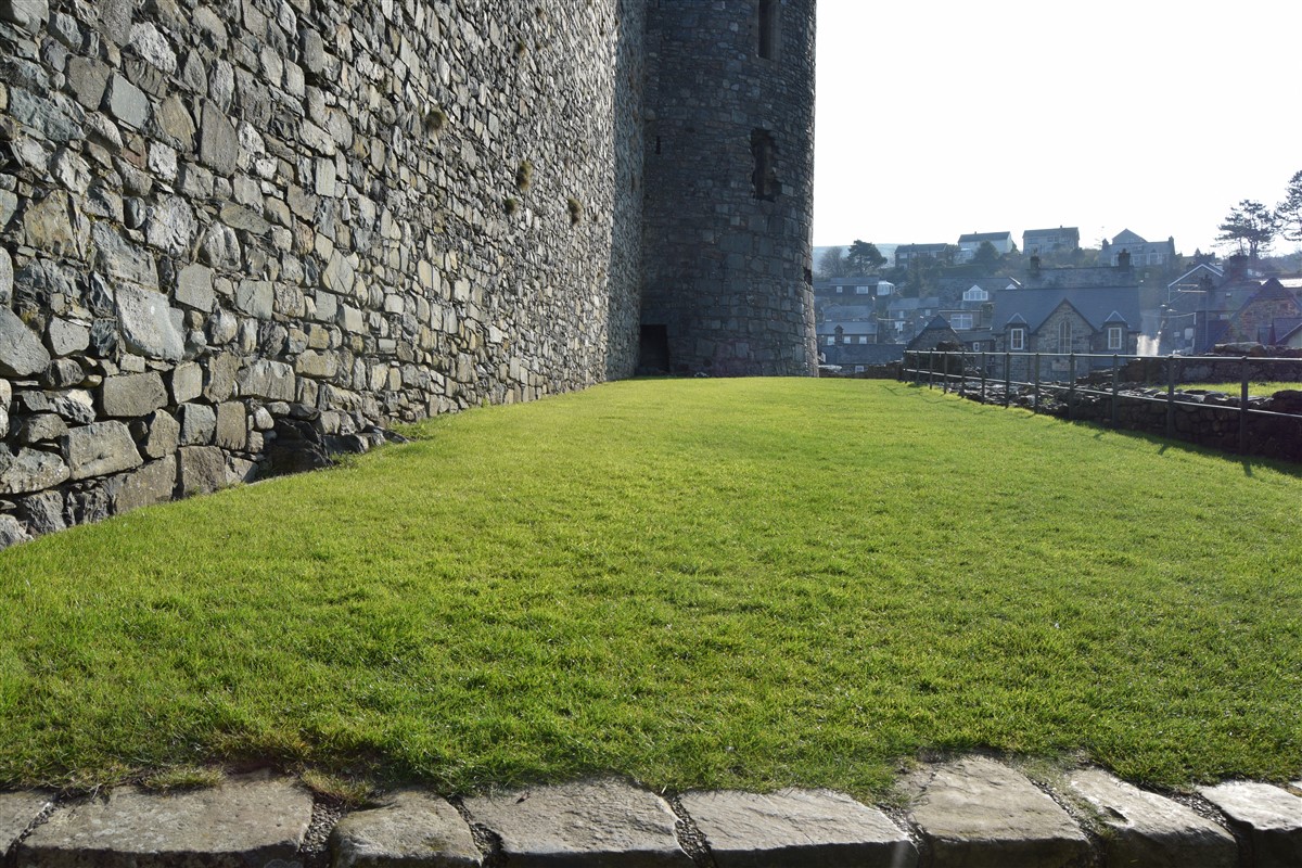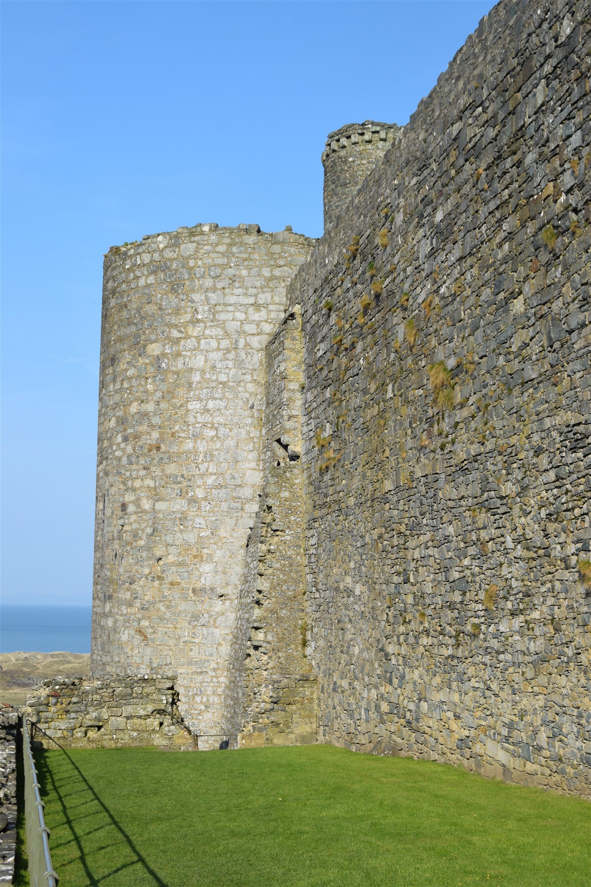 Built between 1283 and 1289 by Master James of St George for King Edward I. Constructed of limestone and granite, with sandstone dressings. Of concentric design, comprising a rectangular, high-walled, inner ward with four round towers at the corners, and a lower-walled outer ward broadly following the same line. Large square gatehouse to the E wall of inner ward, which housed the principal rooms, and was designed to be independently defensible. The hall, chapel, service and storage buildings were located to the N, S, and W sides, although only the chapel remains above foundation height. Seized by Owain Glyn Dwr in 1404 and held successfully by him for four years.