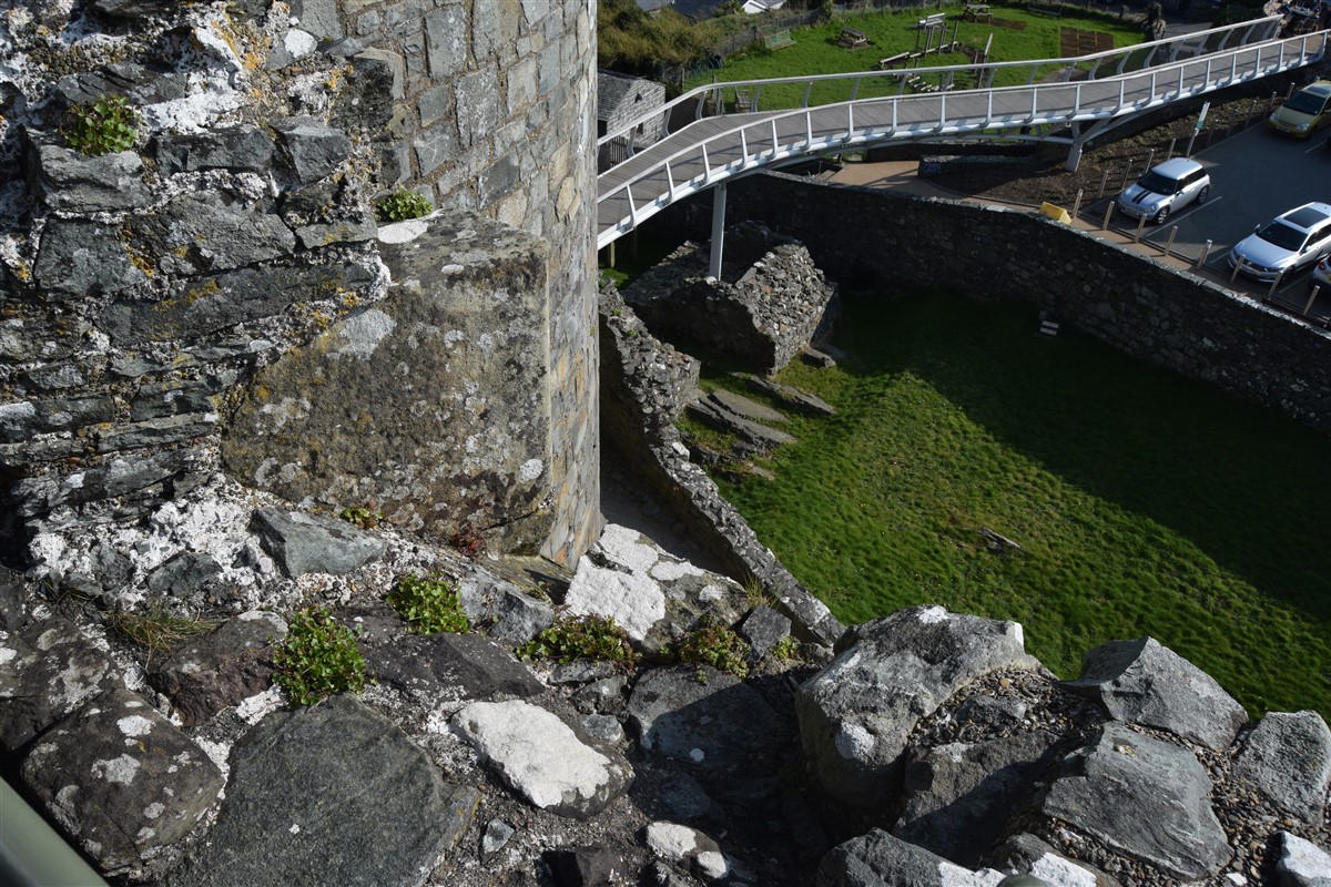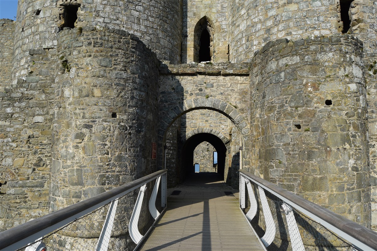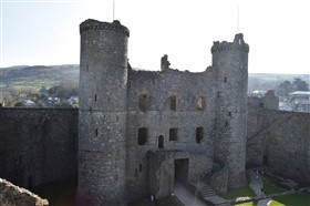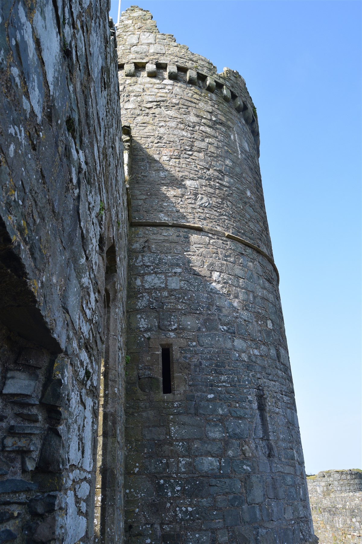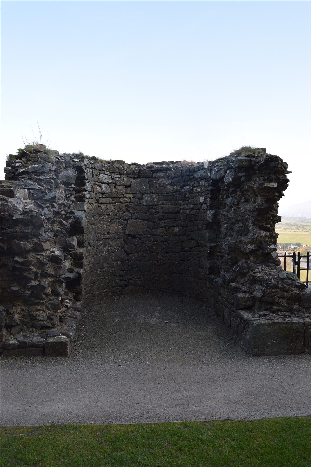 Built between 1283 and 1289 by Master James of St George for King Edward I. Constructed of limestone and granite, with sandstone dressings. Of concentric design, comprising a rectangular, high-walled, inner ward with four round towers at the corners, and a lower-walled outer ward broadly following the same line. Large square gatehouse to the E wall of inner ward, which housed the principal rooms, and was designed to be independently defensible. The hall, chapel, service and storage buildings were located to the N, S, and W sides, although only the chapel remains above foundation height. Seized by Owain Glyn Dwr in 1404 and held successfully by him for four years.