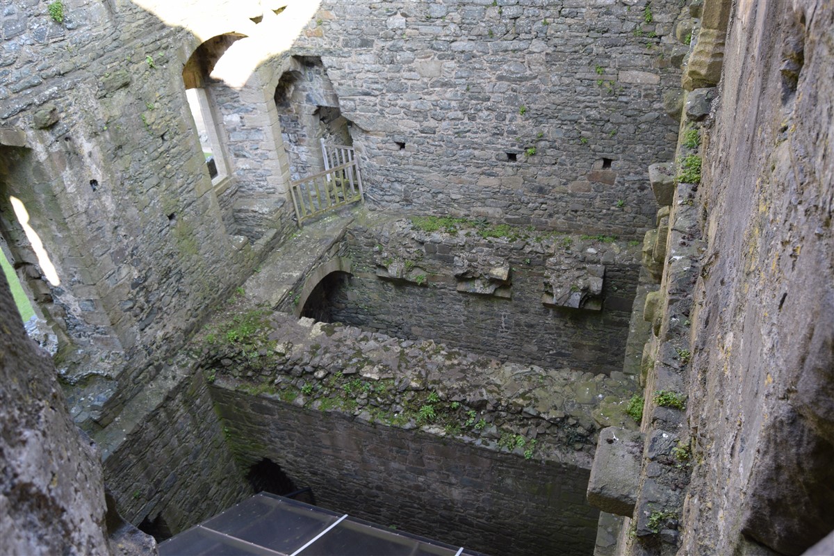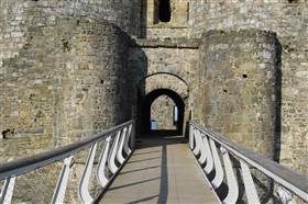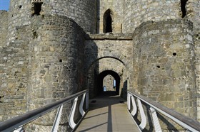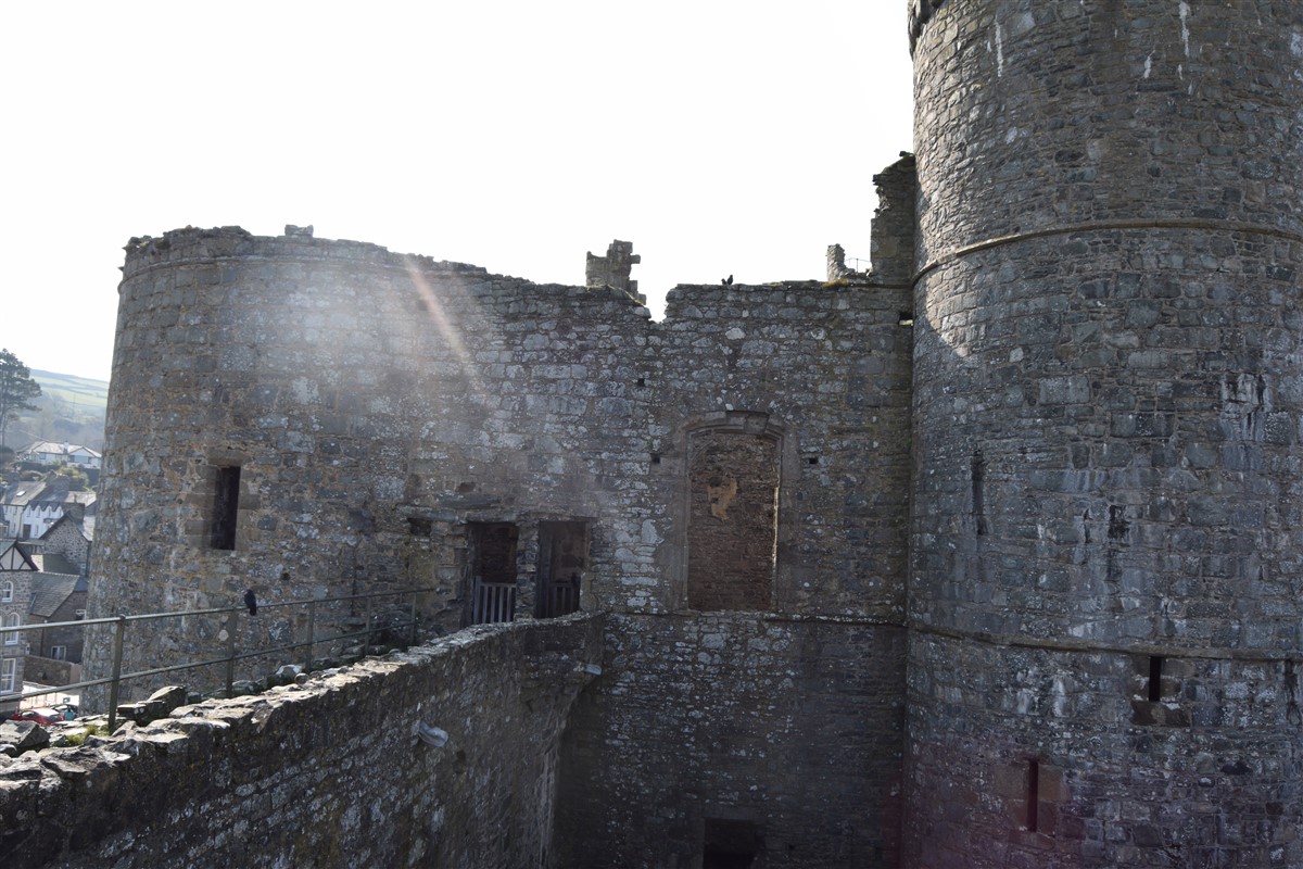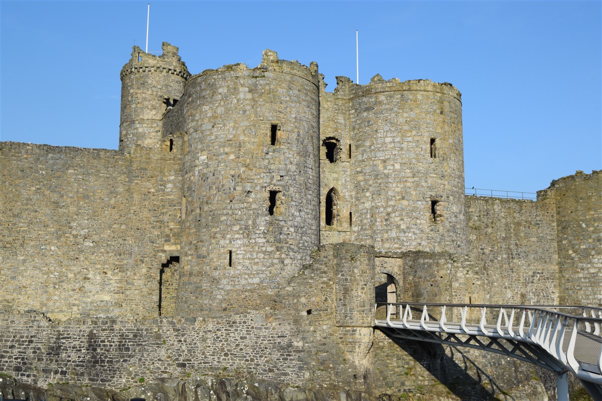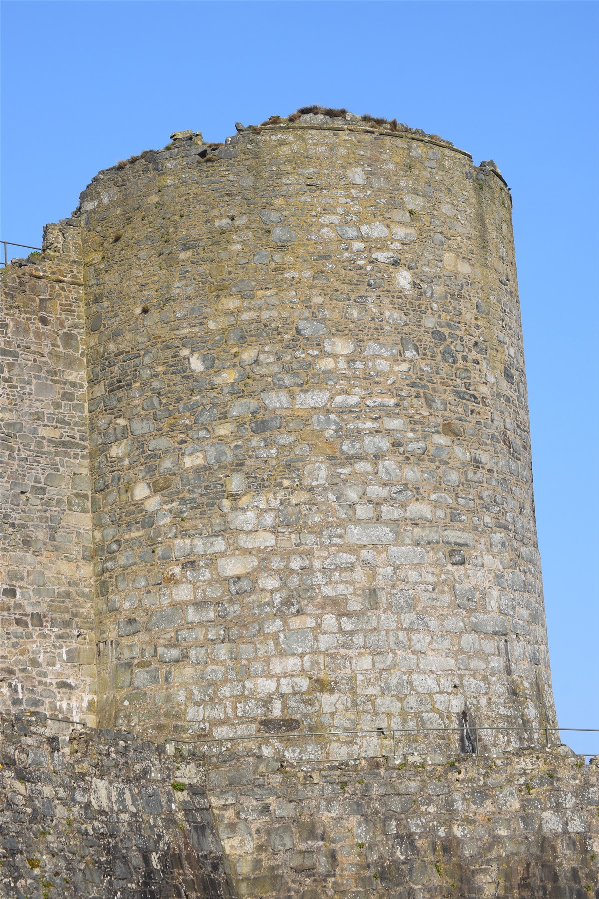 Built between 1283 and 1289 by Master James of St George for King Edward I. Constructed of limestone and granite, with sandstone dressings. Of concentric design, comprising a rectangular, high-walled, inner ward with four round towers at the corners, and a lower-walled outer ward broadly following the same line. Large square gatehouse to the E wall of inner ward, which housed the principal rooms, and was designed to be independently defensible. The hall, chapel, service and storage buildings were located to the N, S, and W sides, although only the chapel remains above foundation height. Seized by Owain Glyn Dwr in 1404 and held successfully by him for four years.