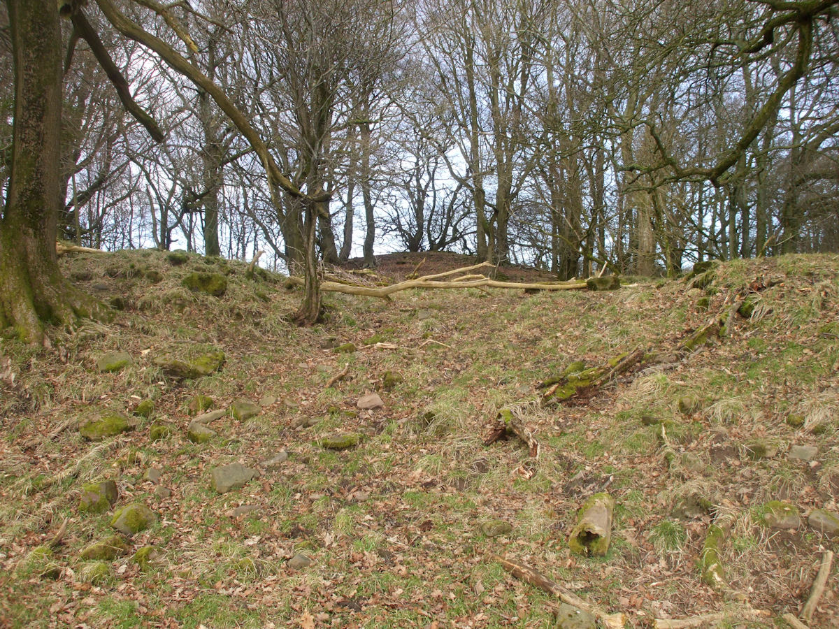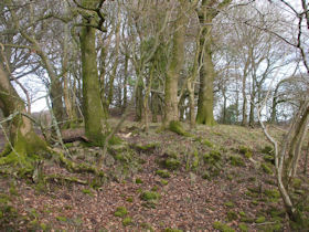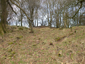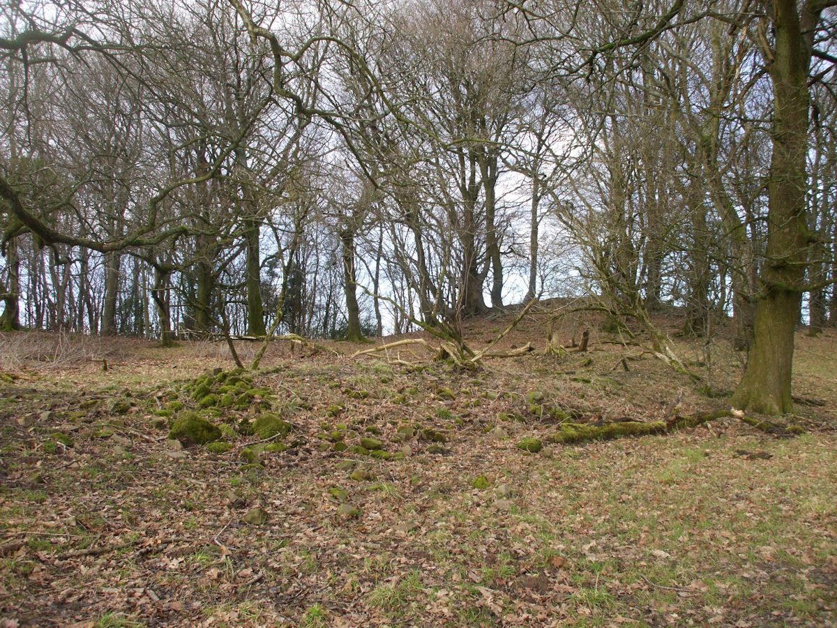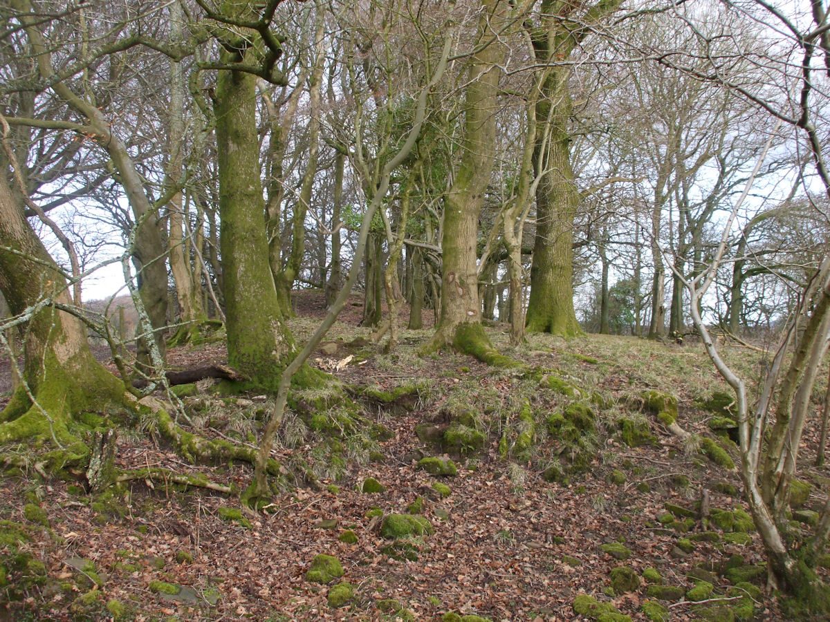 A subrectangular/oval enclosure, c.90m NE-SW by 82m, set upon the summit of a steep ridge above the Usk valley, defined by a scarp and ditch, having an unditched mound, 25m in diameter and 2.0-3.0m high, set towards its NW side. (Coflein)