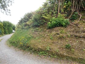 This is a horse-shoe shaped work standing immediately east of the parish church, and on the parish boundary, near the river Anghof which skirts the steep slope that forms the defence to the east. It is protected by a much- disturbed rampart which, rising at its best to 6 feet, falls about 12 feet to a ditch that now is largely filled in. The summit of the slope may have carried a mound of which faint traces may be detected. The length of the slope is about 220 feet; the rock has been scarped in places. The entrance was midway in the rampart; it has been ruined. A school-house has been erected within the enclosed area. (RCAHMW, 1925)