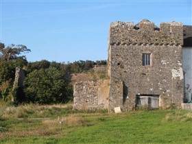A small ruined manor-house of the peel tower type, probably of 15th-century date, standing about 500 yards north-west of the parish church, illustrated and described in detail in Arch. Camb. for 1868 (III, xiv, 79). Although its main features are easily followed, the intervening 60 years have obliterated much. The building, which is now used for farm purposes, has a plain vaulted undercroft, with two apartments above to which access is gained by an exterior flight of steps. From the larger of the two rooms a short newel stairway leads to the summit of a low lantern or beacon tower. Around the roof runs a corbel table and parapet. The windows have been modernised. Certain " geometrical patterns," which are said to have been in the concrete or plaster floor (Journal, British Archaeological Assoc., xli, 82), have disappeared since 1885. The building should be compared with Carswell (No. 846) in the parish of Penally. (RCAHMW, 1925)
