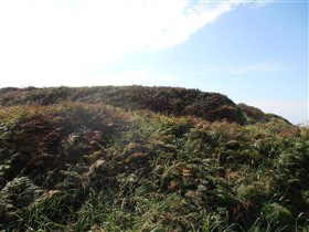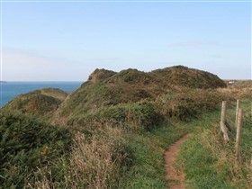 Great Castle Head promontory fort is a coastal promontory enclosure, sundered by landslips, with an interior denuded by erosion, defined by two lines of rampart, ditch & counterscarp, showing a possible, centrally placed entrance: excavation in 1993-4 demonstrated occupation beginning in the early to middle Iron Age and contnuing through at least into the Roman period: the site appears to have been adapted as a medieval, castle fortification, being eventually abandoned in the 13th century. (Crane 1999 (AC 148), 86-145.) Weather and waves have taken their toll on Great Castle Head for over two millennia. The site has some of the most massive promontory defences of all the Pembrokeshire coastal forts. In the late 1990s, with a serious danger that the remainder of the fort might be lost to coastal erosion without record, an excavation was mounted by Cambria Archaeology, funded by Cadw. As at Porth y Rhaw, the work revealed that the fort had been densely occupied, with the defences originally finished with stone walls and timber work