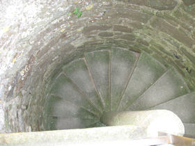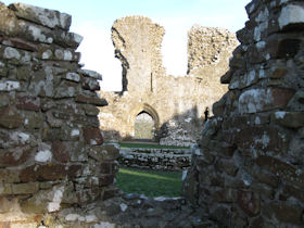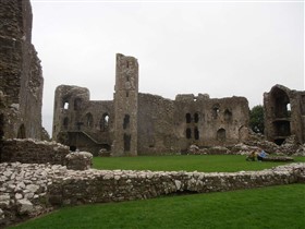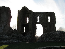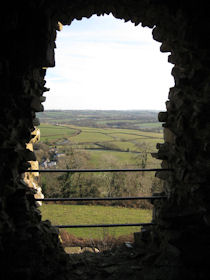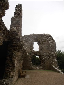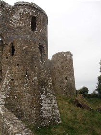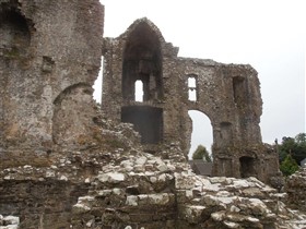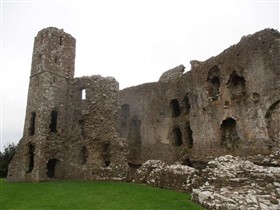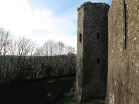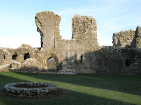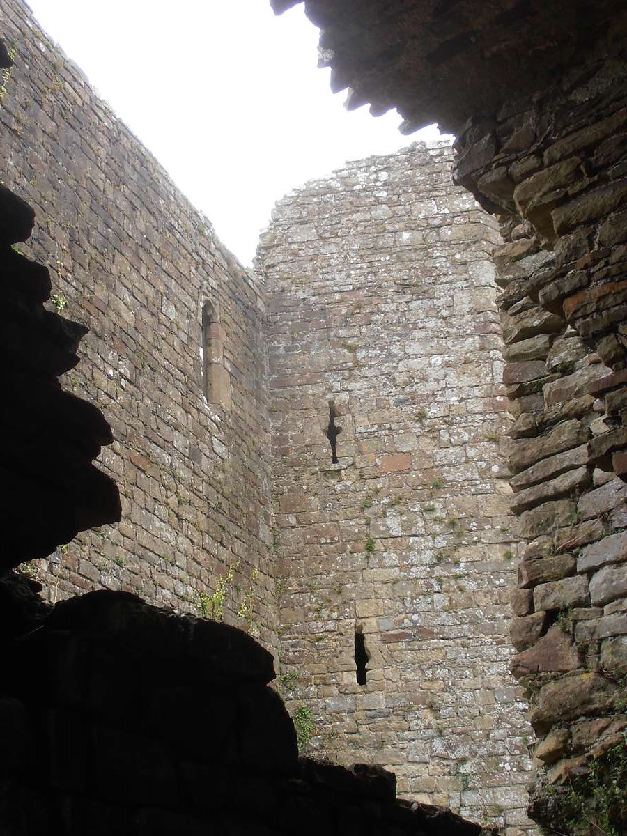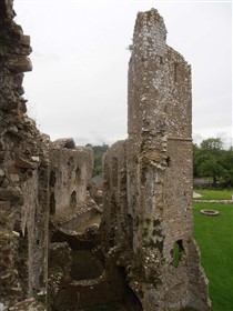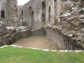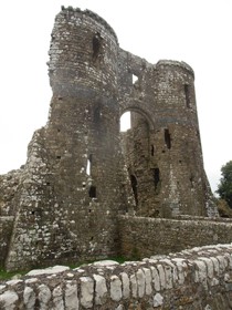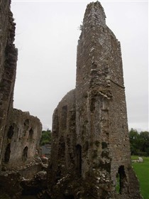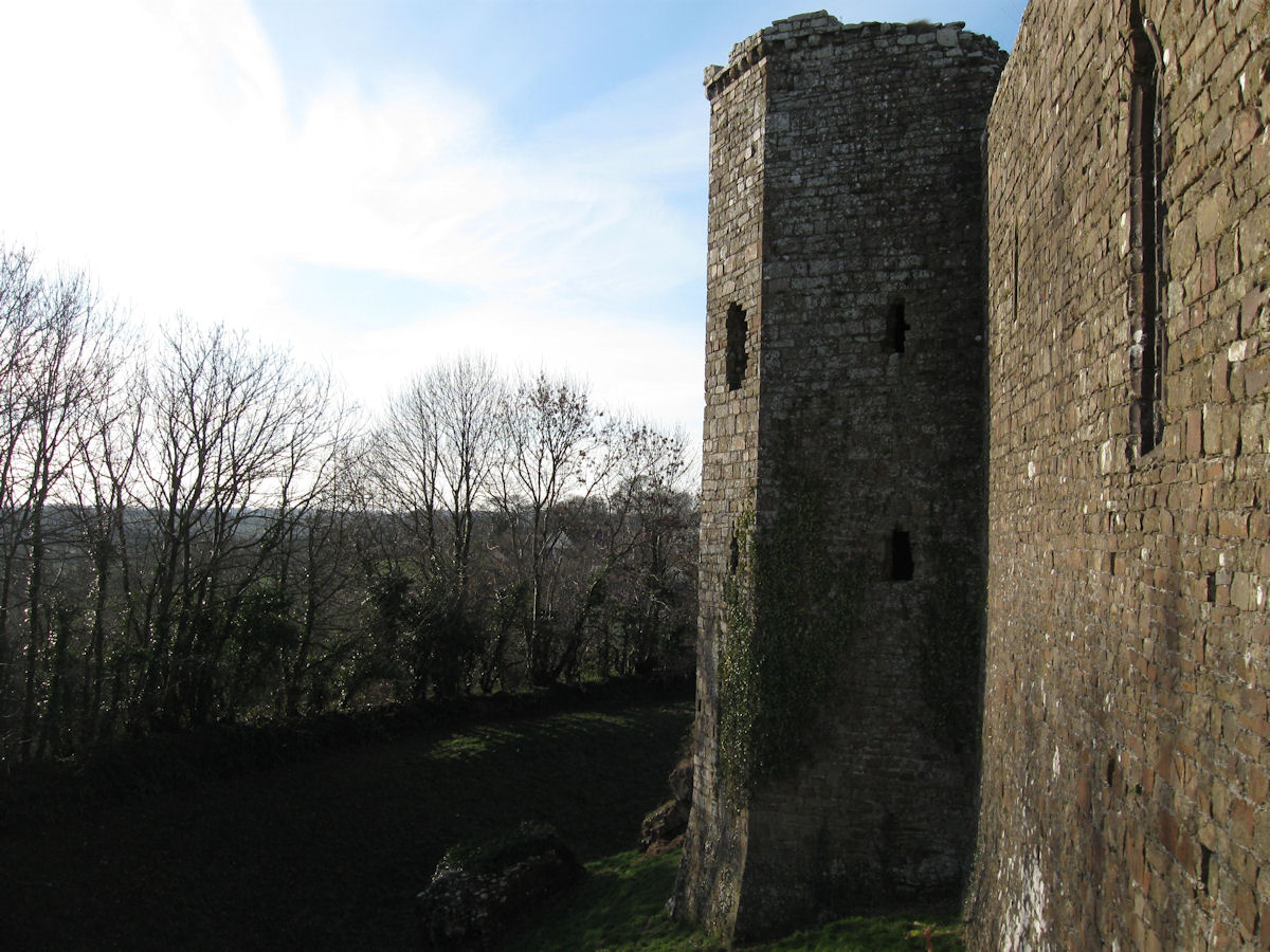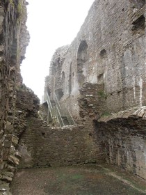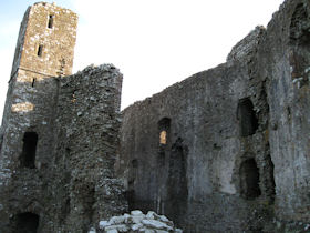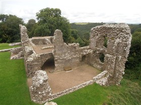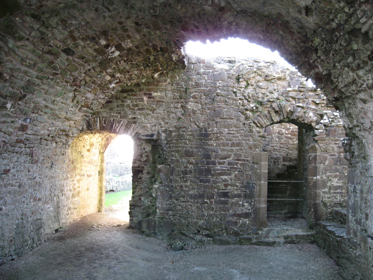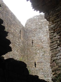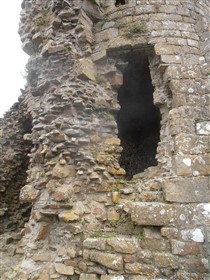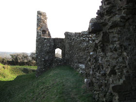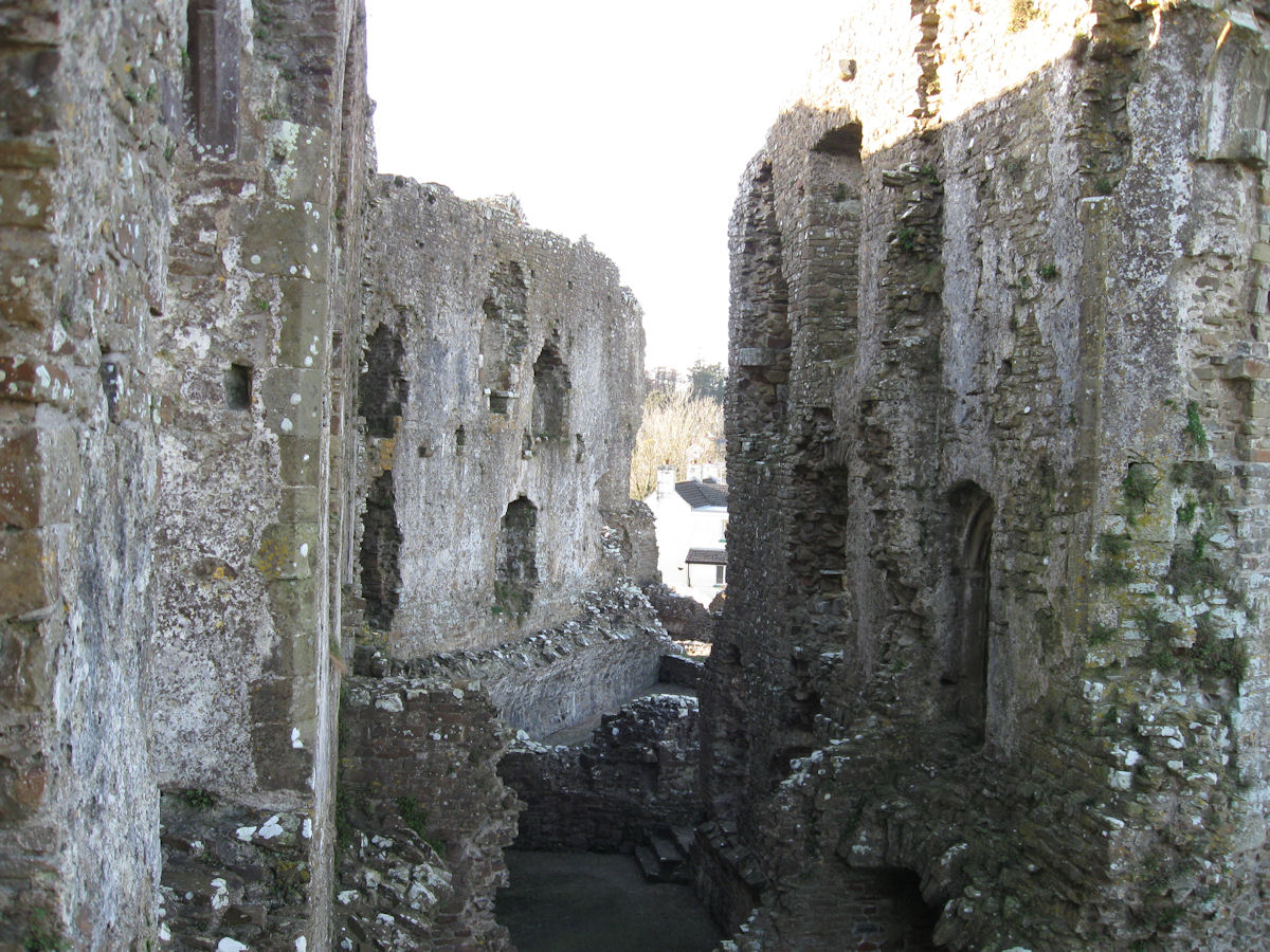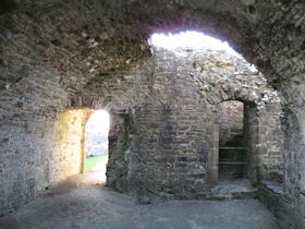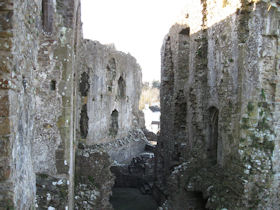 The castle stands within a circular dry moat, about 20 m wide and 7 m deep, which is the surviving visible relic of the period of the original ring motte. The plan now consists of a circuit of buildings using the utmost extent of the old platform and encroaching in several places on to the inner slope of the moat. It is entered at the SW across a causeway where there was formerly a drawbridge, between two late-period gate turrets, of which little more than the outer façade remains. There are guardrooms each side with remnants of good quality rooms above. The passage between the guardrooms leads to an irregularly shaped ward with a deep well. At the left (W) there are remnants of an early circular tower, with a wall about 3 m in thickness surrounding a circular space of about 3.5 m diameter. To the N of this is a remnant of the early curtain wall and the round front of a small defensive turret at the N corner. The Great Hall is at the far side of the ward (NE); it was a first-floor hall, and the undercrofts of the hall and two wings survive. At the S side of the ward there is a domestic and chapel range, including two towers projecting far into the moat and one internal tower projecting into the ward. The materials generally are local sandstone, hammer-dressed and roughly coursed. A small amount of Caerbwdy stone is used for carvings and for bands of contrasting colour in the later work refacing the entrance turrets. Other freestone is used in places for carvings and dressings. Much of the stonework of the inner face of the chapel and domestic ranges has been quarried away, and also the vaulting of the undercrofts of the same parts; the most impressive surviving structures are the vaults of the Great Hall. No original roofing remains. The Great Hall, at NE of ward: The building survives well at undercroft level, but only fragments of the walls above remain. The main undercroft is about 7 by 24 m, spanned by a vault with a rise of about 4 m. This was a plain barrel vault without ribs. The kitchen cross wing at the left of the hall is about 5 by 12 m and the solar cross wing at the right is about 7 by 12 m, both undercrofts also vaulted. The main undercroft communicates only with the latter. The side of the great hall and its wings facing the ward is all in one plane, the projections of the cross wings being to the rear, boldly overhanging the moat. The kitchen part is identifed by rubbish chutes from both the undercroft and the main storey, discharging into the moat. There is also a front extension to it of later date, now surviving only as low walls, with traces of ovens. The other, solar, wing has large windows overlooking the moat. In the front elevation to the ward there was a principal doorway to the left of the main undercroft and two small windows, one well preserved. The main entrance was by external stairs to a door over the undercroft door, but the arrangement was altered as there are signs of a staircase roof cutting across one of the main hall windows. There are no openings at undercroft level facing the moat. One corbel on the SE gable of the hall was evidently a roof support for the solar. The surviving main undercroft doorway is chamfered and of three orders. There are bulbous stops of an unusual type, at differing levels. There is a rebate for the door, and there are traces of the iron hinge pins in the wall. Slots for door bars are present. The better-surviving window is small and trefoil-headed. A door at left gave access to the kitchen from the ward, but became an internal door when the later bakehouse was added. This doorway has chamfered reveals with broach stops. The Chapel and Domestic Range, at S of the Ward: A long range of buildings, mainly domestic in character, but including the chapel at the E end. The two towers overlooking the moat are octagonal, the W tower externally only but the E tower both externally and internally. The porch tower facing the ward is square and of five storeys, and is carried up above roof level to serve as a lookout. The chapel was entered from the first floor of the porch tower. Only the outer wall of the chapel remains, in which there are three deep-set windows with scoinson arches. Two are under a single arch, within what appears to have been a cross-vaulted part of the roof, showing the chapel roof was T shaped or cruciform. The window tracery is carved in Caerbwdy stone. Beneath the chapel are traces of a vaulted undercroft, entered by a side door in the porch and a passage beneath the main stairs. Off this undercroft, in the E octagonal tower, is a dungeon with latrine and beneath its floor an oubliette. At the level of the chapel is a tower room octagonally vaulted, with fireplace, also with a latrine. Above this is another room reached by spiral stairs from the chapel, also with latrine, and with an octagonally groined vault. This room has a separate closet or small bedchamber and was presumably a chaplain's room. The remainder of the range is domestic in character. Only the outer wall survives to any great extent. There are the springings of an undercroft, and in the main rooms there are fireplaces and windows with window seats. In the top storey there are small trefoil-headed windows. The other tower serves these rooms, containing latrines and closets or small bedchambers. This tower is slightly battered at the base, with some loopholes or narrow windows with trefoiled heads. The five-storey porch facing the ward contains remains of very awkwardly planned broad winding stairs to the chapel level. The first floor of the porch consists of an antechamber to the chapel, with corner colonettes and traces of cross-vaulting, plus a good doorway to the chapel. From this level the stairs continue in a side projection of the tower, so the upper rooms were rooms and not merely landings; the floors, however, do not survive. At the front to the ward the main entrance to this tower has a label mould with king and queen's head stops. There 