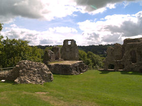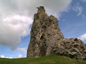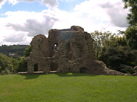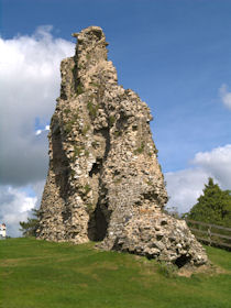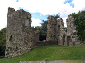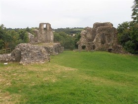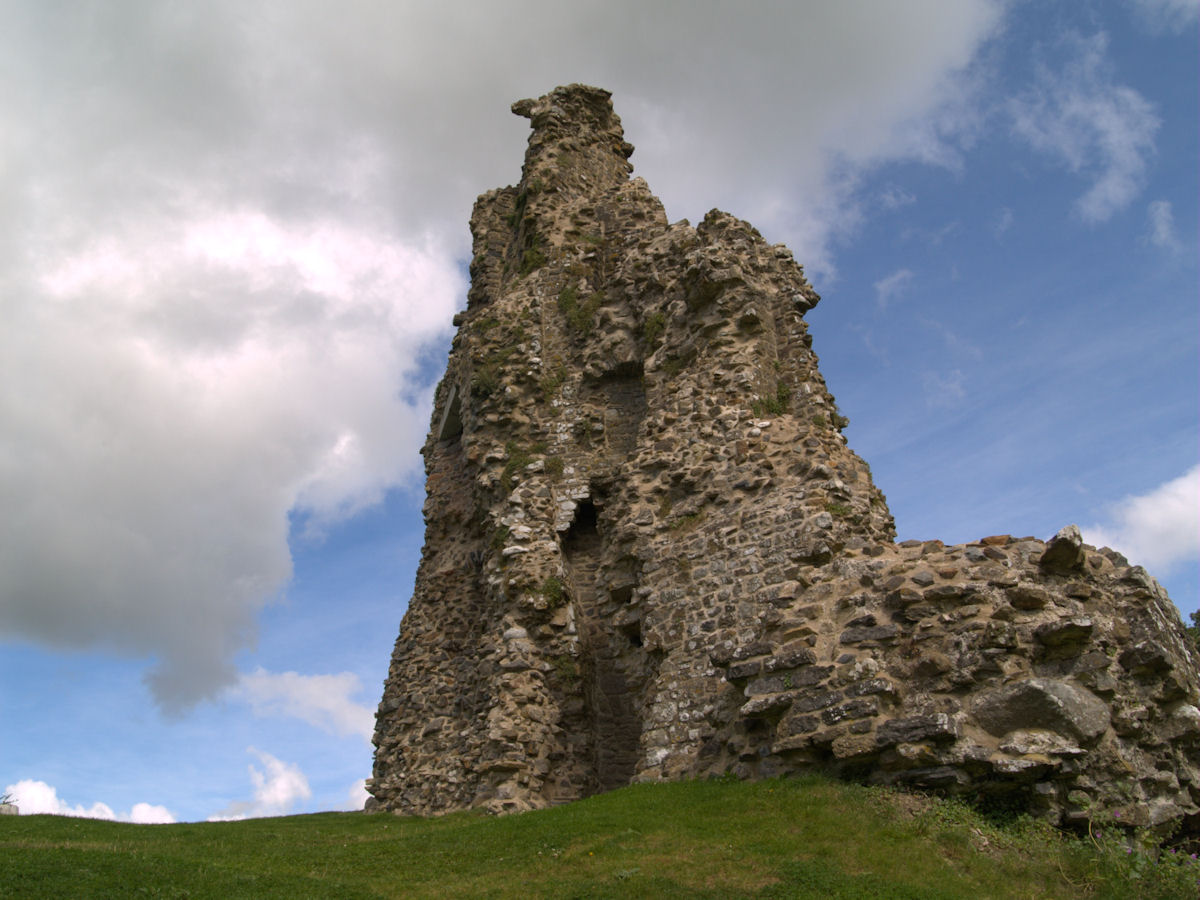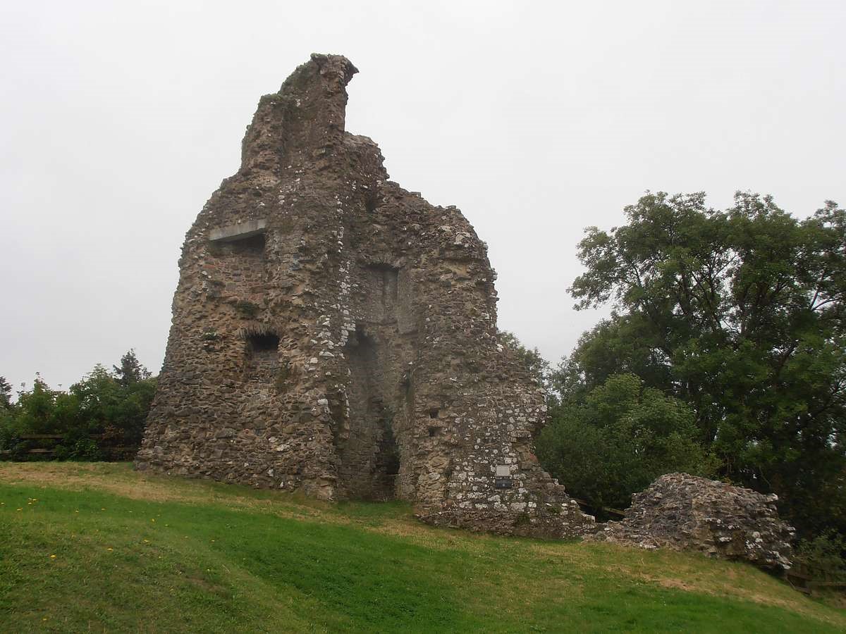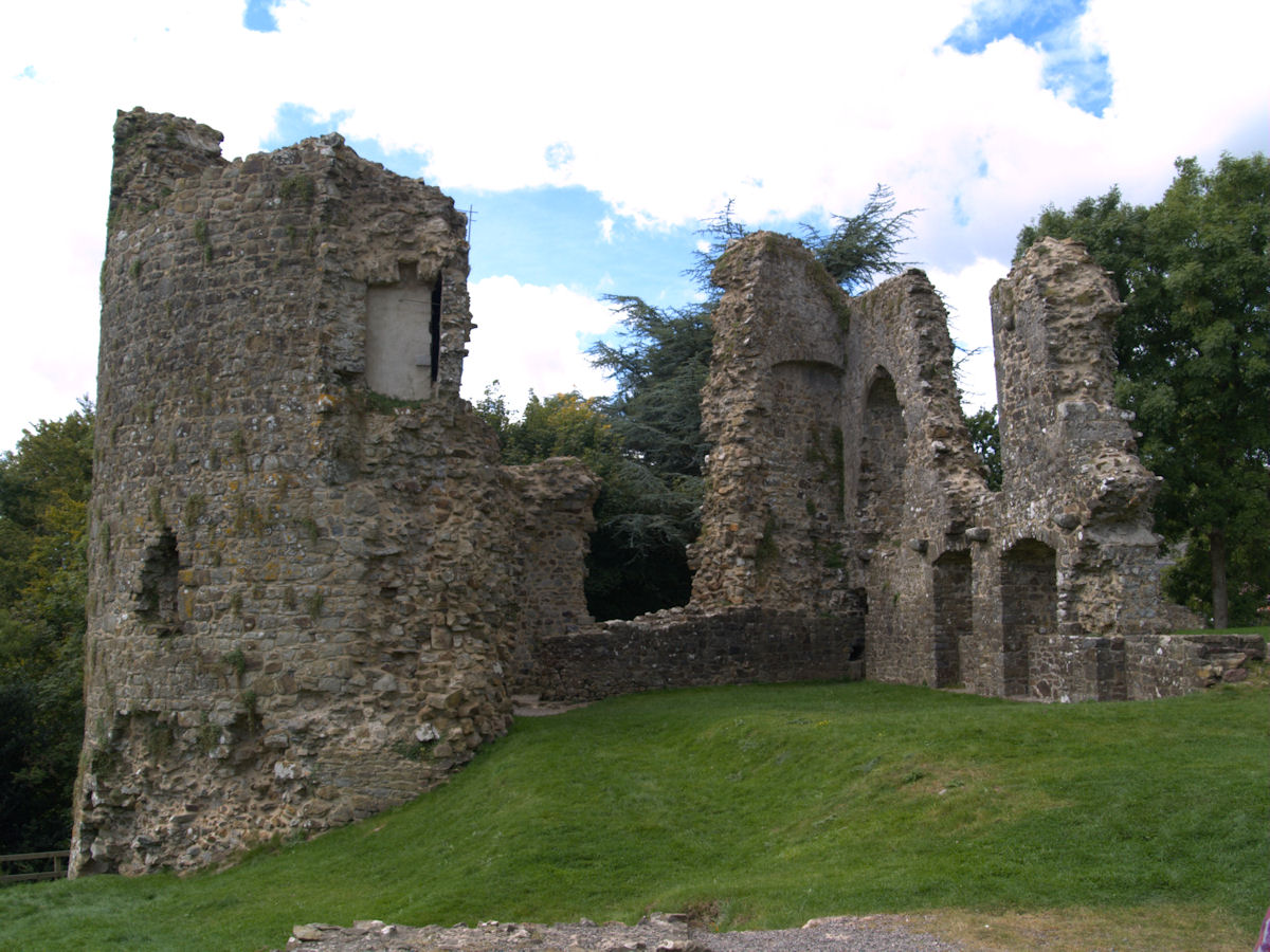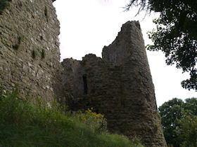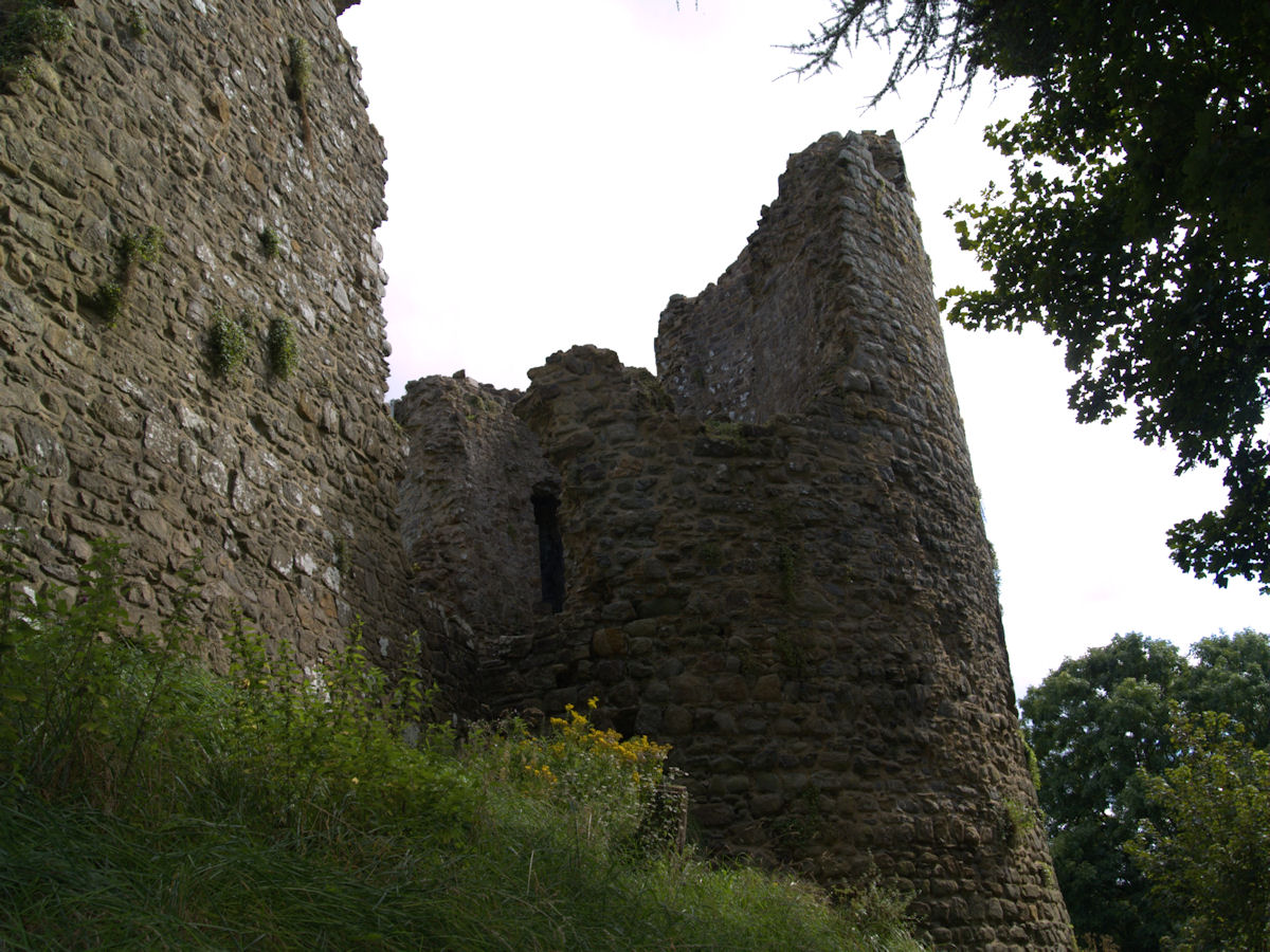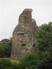 Rectangular site. Half moon outwork covers S front. Ruins of 2 quarter-engaged drum towers with battered bases. SE tower (bakehouse and chapel tower), has aumbry to 1st storey former reveal; window opening to 2nd storey. SW tower survives to 3 storeys. (Larder with 2 chambers over) pointed arches to 2nd floor openings, broad internal splays to ground floor openings. At right angles to N, fragment of walling rises to 1st storey height (former kitchens with hall over). Cambered openings to ground floor - modern blocking. Traces of arched openings to 1st floor level. Corbels.