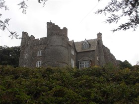 Medieval castle mostly late C13 of which the major surviving part, the gatehouse, was incorporated into a house 1859 for Sir Thomas Lloyd of Bronwydd, Cards, 25th Lord of Cemaes. History: Castle founded by William Fitz Martin 3rd Lord of Cemaes in 1191, after loss of Nevern Castle; but most of present structures probably date from the time of the 6th Lord, William Fitz Martin (1257-1324) who inherited in 1282, and to a rebuilding after damage in the uprising of Owain Glyndwr ca1405. From 1326 to 1543 the Lords Audley of Heleigh, Staffs, held the barony of Cemaes, but were rarely resident and by the C16, when it was sold to the Owen family of Henllys, the castle had been 'in utter ruin for a long time'. Plan: Castle comprises a NE gatehouse with flanking towers, incorporated into the 1859 house, the NW Hunters' Tower, still partly standing to full height, SW Kitchen Tower, largely disappeared, and NE Great Tower of which the ground floor survives with open courtyard and fine ashlar pointed entry. The various curtain walls are largely ruinous, but N of the Great Tower survives the basement of a substantial building, possibly chapel, with vaulted undercroft of 4 cells on central octagonal pier. For full archaeological report, see National Monuments Record, Aberystwyth. Exterior: House itself is built into back of gatehouse tower with main C19 front to S. 2 storey and basement 3 window front with slate eaves roof, crested ridge, ridge stack of 3 stone circular shafts and very large W end round stack with chimneybreast built up from original curtain wall. Windows are unevenly spread, the upper windows cambered-headed square sashes with marginal glazing bars, stone voussoirs and slate sills, the centre window slightly higher and under an eaves gable. Ground floor has one longer similar sash aligned under first floor right window, gabled stone porch to right and hipped-roofed timber square bay window to left, aligned between centre and left windows above. Porch has pointed arch, slated eaves roof and crested ridge tiles. Bay window has French windows to front. Basement has cambered headed casement. To right of house a lean-to roof abuts a square medieval tower, the rear of the E side of the gatehouse structure; the roof appears to be a post 1859 addition built over the vaulted medieval stairs down to the gatehouse passage. C19 pointed arched porch with flat roof. House is L-plan and 3-storeys on N side, where windows are pierced through medieval masonry. Original gatehouse was of 2 round towers flanking entry, but that to E has been rebuilt flat-fronted, having collapsed in early C19, with 2 lancets and picturesquely ruinous top. Central part, site of former entry is largely rebuilt, with three C19 cambered-headed casement windows, vertically aligned and corbelled embattled parapet. West tower retains its original rounded form on battered base, 3 stages each slightly recessed then corbel table and ruinous octagonal cap. C19 arched light to basement front and first floor NE. W return of gatehouse tower has two C19 arched lights to basement, big first floor timber 3-light window with transom and stone cambered head, and casement pair above under stone eaves gable. Rear of main front range is built out from curtain wall with basement triple casement, first floor big timber oriel on wooden brackets, with hipped slate roof and 3-light gabled half-timbered dormer in roof. W end wall has ground floor timber cross-window and casement pair above. Blank shield plaque in gable. Interior: House interior is relatively plain for the C19 work, with clear evidence that additions post-1859 have been made on E end. Pointed rough vaults survive on both sides of the original entry passage, wall recesses and other extensive remains of the medieval structure. The centre staircase of the new work runs up from basement level entrance passage of original gatehouse. Plain open-well timber stair not relating clearly to C19 front door, possibly altered post 1859. 6-panel doors and simple fireplaces. Newport Castle is an outstanding survival of Anglo-Norman castle building in West Wales and the C19 house built within is an unusual example of C19 romanticism associated with Sir Thomas Lloyd's revival of the customs of the Barony of Cemaes. (Listed Building Report)