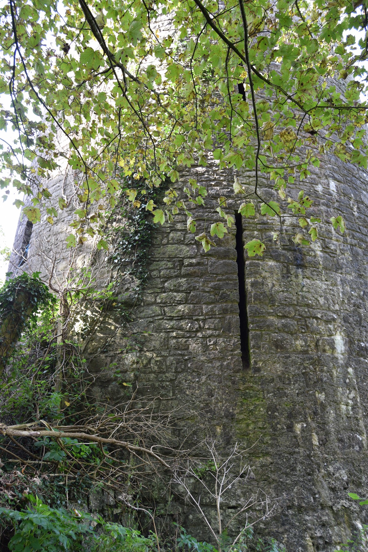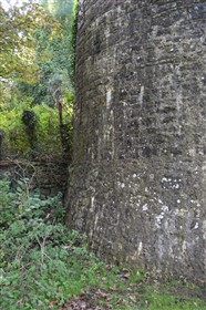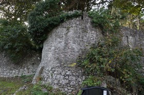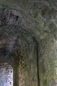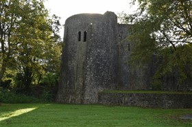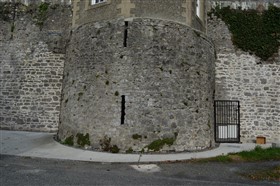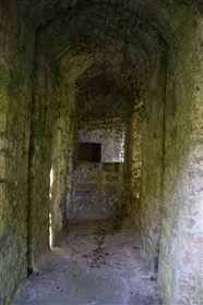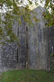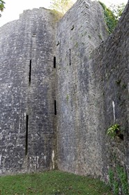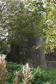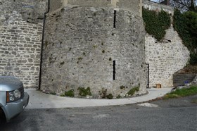 Barnard's Tower: a big, three-storeyed, round tower standing outside the north-east angle of the town and joined to it by a four-sided entrance or fore-building, rather lower in height; its external diameter is 29'6" (8.99 m.) the walls 7'3" (2.10 m) thick. The whole forms of powerful spur-work flanking the eastern defences. The sill of the door is head-high above the approach, reached my modern steps. It seems likely there was a bridge-pit, here strange as it may seem. The pointed arch of the heavily-barred doorway opens into a vaulted passage. On the right hand going in there is a very small latrine chamber carried externally on massive corbels and discharging alongside the eastern wall the town. Next, a simple arrowslit on the left; then the chase and grooves for a portcullis - a most unexpected feature. Beyond this a blocked arrowslit on the right; then, on the left, the entrance to the newel stair, the timber flooring has been lost overhead is visible the stone dome of the tower.