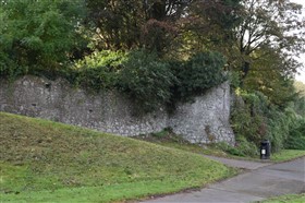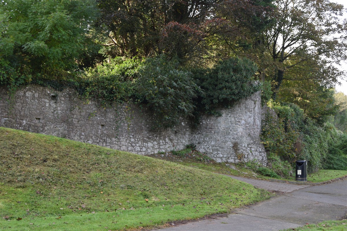There are substantial remains of the town wall, which runs around the perimeter of the narrow peninsula along which the town lies, with the castle at its tip. The remains include four of the original six flanking towers and part of one of the three gatehouses. The wall dates from the first two decades of the 14th century, but is the latest in a possible sequence of three lines of defence. The first may date to the 12th century and encircle a small area between the castle and the parish church of St Mary. The second appears to have been established midway along the peninsula, probably in the early 13th century, beyond which an extra-mural suburb was established around St Michael's parish church and marketplace. Both these defences were probably of earthwork and timber. The final masonry phase enclosed all elements of the town, and both parish churches. The wall was repaired, and partly rebuilt during the 15th century, but was damaged, and finally slighted as a result of the Civil Wars of the 1640s