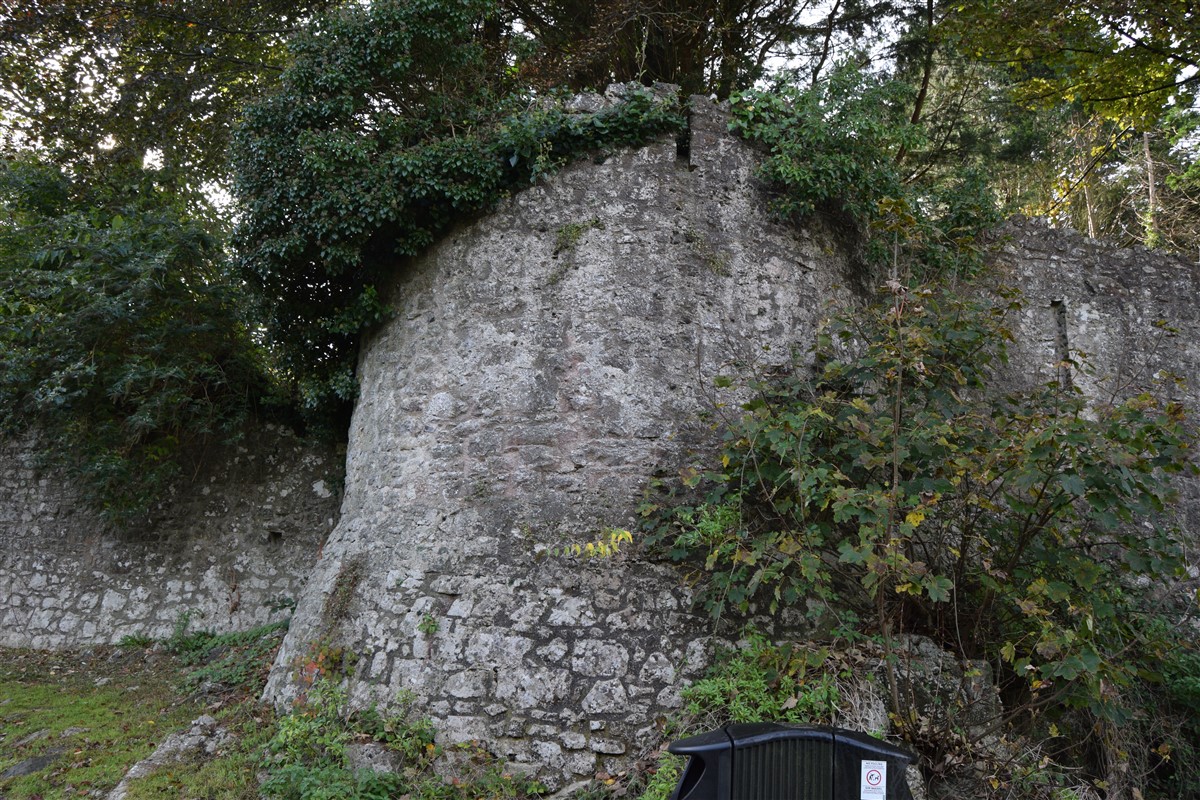 Walls, rubble stone, partly built on bedrock. The first section appears to be the S walls of outbuildings built parallel to the old wall line behind Nos. 87-91 Main St.. Straight joint to right of No 5 Common Road and a high rubble wall, with door to right and access ramp up, behind No 87 Main Street, then straight joint and low door to rear garden of No 89 and ramp running down to E, further door at lower level at end of ramp and window with brick head at higher level to right. This section not marked on c. 1865 map. Then a straight joint to a C19 lofted outbuilding (marked on c. 1865 map) with corrugated iron roof, a stone doorway at left and two windows with brick heads. Ramp in front. E end gable has broad entry with high timber lintel. This building probably has the older wall as the back wall as this continues the line of the walls further E. (High separate stone terrace walls in the steep rear garden of Nos. 89-91 and continued E to rear of Tabernacle Chapel). E of the outbuilding described above is a wall of stone rubble behind No 91 which has been broken in the centre for a broad opening, the walling much rebuilt. Behind Tabernacle Congregational Church, a doorway, then an early C19 lime kiln, comprising a semi-circular stone projection with recess on each side giving access to curved pointed kiln-eyes. Behind is an area of rough ground with shallow caves or quarries. High walls running back to chapel S retaining wall, straight joint at foot of E wall, then door and higher section of wall behind No 93, rebuilt wall and another two doors behind Nos. 95 and 97. Garden wall to S of no 99 Main Street is more substantial and has a doorway to left of one of the towers of the medieval town wall. Round rubble stone medieval tower has arrow slots on two levels and overgrown roof possibly vaulted. Tower is a Scheduled Ancient Monument. To right of tower, behind No 101 the wall is set back with a stub wall dividing two recesses, the right one roofed as a garage. The stub wall is curved at the S end of the W side. The c. 1865 map shows a building on this site. Garden door to No 101 to right with earth ramp in front. More substantial walling behind Nos. 103 and 105, the ramp leads up to a doorway; a further ramp against wall of no 105. The walling drops considerably in height to rear of no 107 where there is a vehicular doorway with concrete lintel. A yellow brick passage entry to no 109 Main Street adjoins this. The garden wall to rear of no 111 Main Street is much higher; a lateral ramp leads up to stone doorway at W end. Here too, a further Scheduled Ancient Monument, comprising the base of a medieval bastion, rubble stone with loop each floor on S, arched door with stone voussoirs to E and loop over. Interior lined in C20 blockwork. Built on to bastion is gazebo formerly part of garden of No 111. Later C18, restored in late C20, deteriorating 2004. Two-storey octagon with pebbledashed stone rubble walls with stucco quoins and window surrounds. Octagonal pagoda roof of shaped slates with ball finial. It formerly had a wooden eaves cornice, replaced with iron gutters, partly missing 2004. In N E, S and W faces, there are renewed sash windows, long 12-pane in the upper storey, and, in W, S and E faces, short 9-pane sashes. To E of the bastion and gazebo, a short length of overgrown high wall as far as No 4 Rock Terrace. (Listed Building Report)