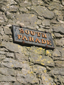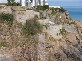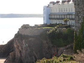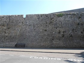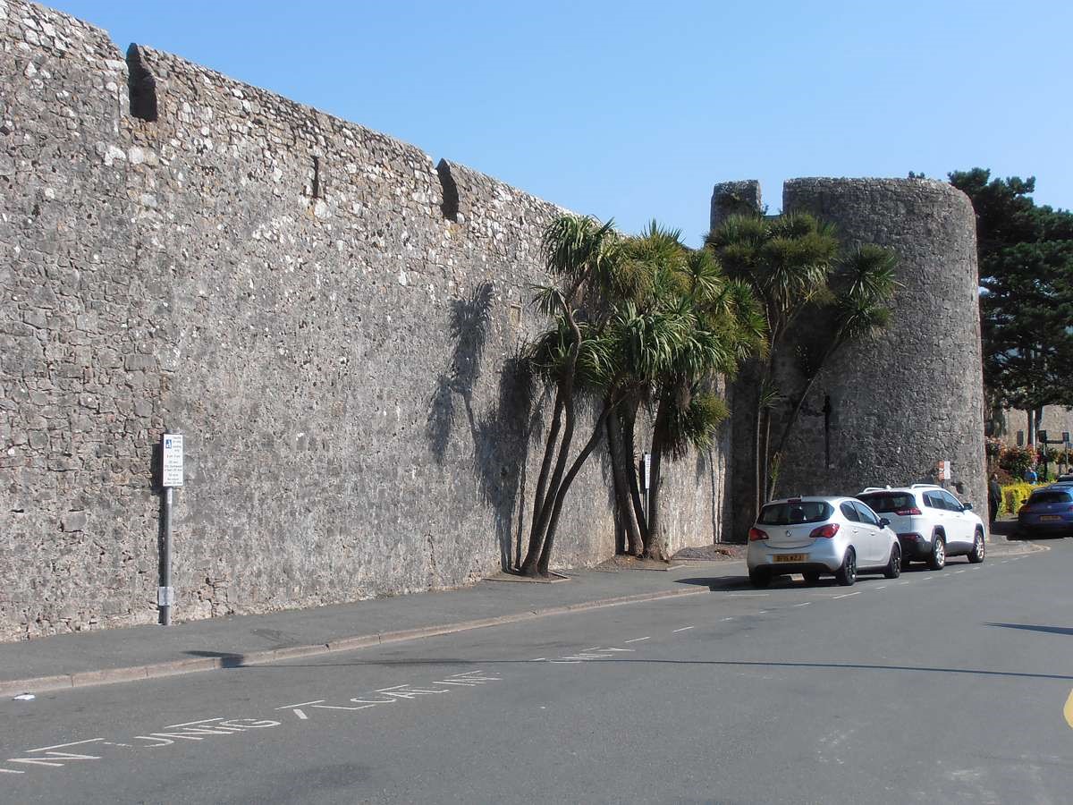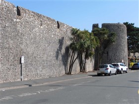 The walls run W along White Lion Street from corner of Upper Frog St, and then S along South Parade and St Florence Parade to the sea.