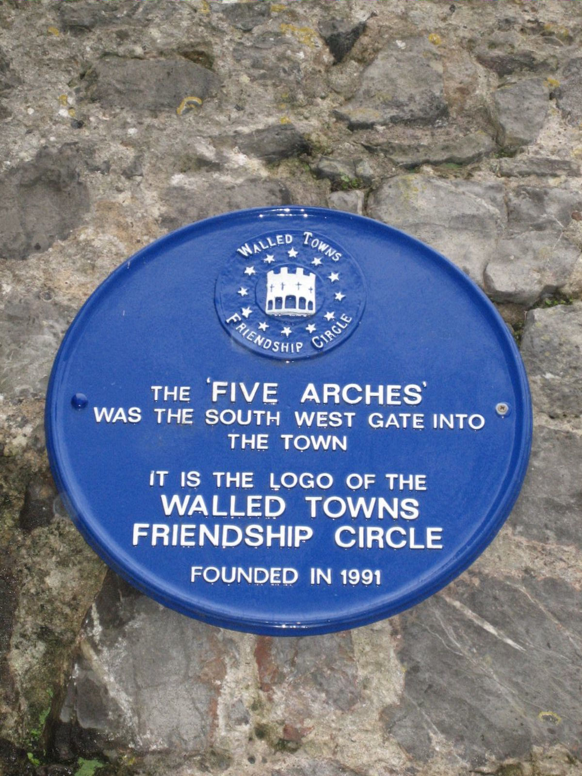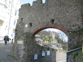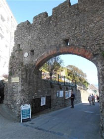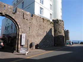 Town walls with 6 towers and one large semicircular town gate. Rubble stone with arrow loops and crenellated parapet. Short length along White Lion Street to circular bastion at corner of South Parade and then main long length down to the sea with various towers: semi-circular bastion half-way along South Parade, Five Arches gateway opposite former R C convent, semi-circular bastion opposite the garage at S end of South Parade (the interior infilled by Tower Cottage, Lower Frog Street), square tower on St Florence Parade (backing onto garden of No 4 Frogmore Terrace), semi-circular bastion built up in C19 as round tower on W end of the Imperial Hotel and finally a small battered square tower on the cliff edge. (Listed Building Report)