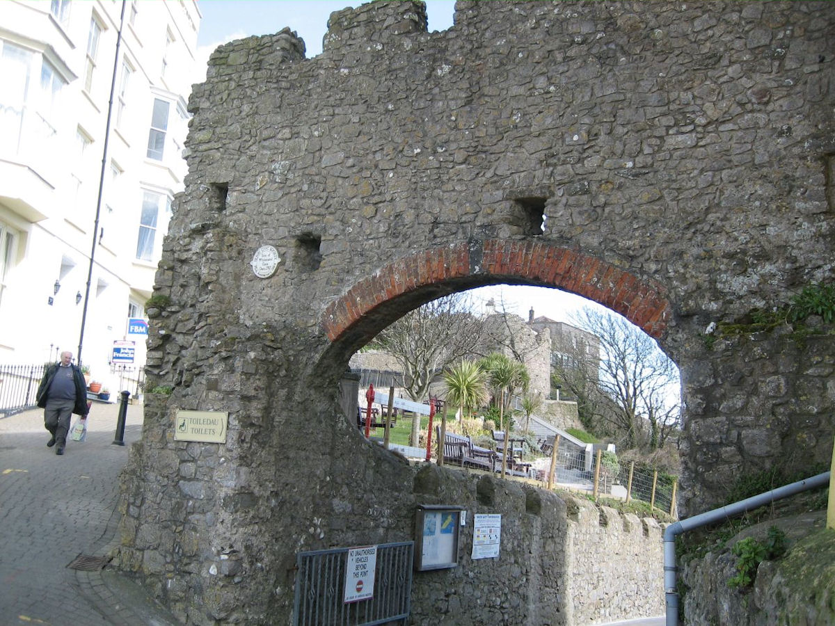 Medieval town walls extending the full original length from the cliff above the South Beach, along St Florence Parade and South Parade to the corner at White Lion Street, and thence returning towards the cliff over the North Beach. This short return is shortened by the loss of the Great or Carmarthen Gate (removed 1781), and connecting wall on the site of the Royal Lion Hotel. There were also walls around the harbour area and linking to the Castle, now gone. The walls may have been begun under the Marshals, Earls of Pembroke to 1245, replacing an earthen rampart of the late C12, and have been completed after Tenby was sacked in 1260 by Llewelyn ap Gruffydd, the later work for William de Valence, Earl from 1247 to 1291. Much rebuilt in 1457 for Jasper Tudor, at which time the walls were said to have been badly built and maintained, and to require both raising and widening all around for a wall walk. The evidence of raising by some 5' (1.5m) at this time can clearly be seen, and the wall walk was mostly still intact in 1812, but largely removed in the early C19. A fragment survives behind York House, Lower Frog Street. There was a moat along the whole length. Only the Five Arches survives of the town gates