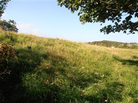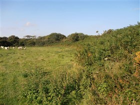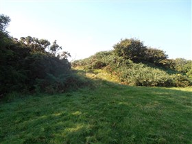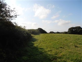 The medieval castle was situated in the Cantref of Rhos, an area settled by the Anglo-Normans from 1093, brought under control by Roger de Montgomery’s son Arnulf from his base at Pembroke. This area was subsequently reorganised as the Lordship of Haverford, initially subject to the Earls of Pembroke. From 1247 onwards, the Lordship also contained the large barony or sublordship of Walwyn’s Castle, commonly independent of Haverford and for which the castle here was the main stronghold and administrative centre. By the mid thirteenth century the castle had been acquired by the de Bryan (de Brian) family, whose main seat was at Laugharne and thus the castle never further developed and remained a predominantly earthwork castle throughout its existence. The earthwork remains comprise a 5m high curving bank that crosses the neck of the promontory on its north side, cut by a 4m wide entrance. Slight traces of an external ditch survive, as does an outwork surrounding the entrance that defines a circular area 56m in diameter. Traces of stone and the outline of a probable curving structure survive here. The interior area of the castle is an irregular roughly tear drop shape, 1.3ha in extent. On its east, south and west sides it is predominantly defended by steep natural slopes with the exception of a 75m stretch along the west side which has been artificially enhanced. It is unclear whether a similar although much slighter enhancement along the east side also relates to the castle or is of a later date. The castles interior is divided in two by a straight section of bank and ditch running across the promontory's narrowest point. This stops short of the western edge of the promontory and thus provided an entrance into the lower bailey. At its eastern end the dividing bank curves outwards to create a roughly square motte nearly 6m high by 13m wide. A depression on top of the motte is likely to mark the site of a circular tower and here there are also traces of stonework, which may indicate both a stone tower as well as a wall along the top of the bank. The only other extant remain within the interior is an earthwork running southwards and dividing the upper bailey, most likely representing a later field division. A detailed survey of the castle was carried out by RCAHMW and the Walwyn’s Castle Historical Society in 2009. (Coflein)