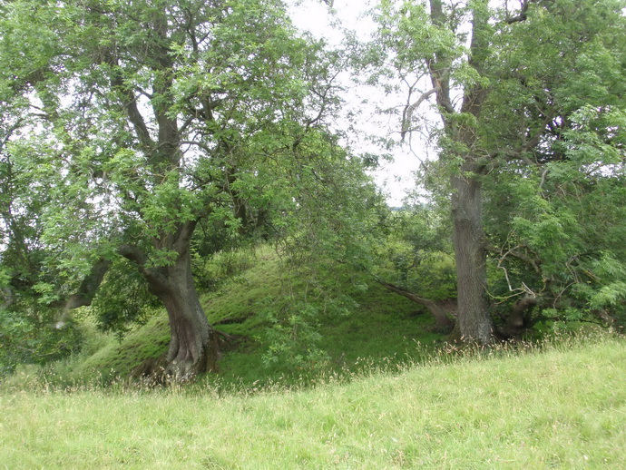 A complex of earthworks, set above the left bank of the Lugg. At the SE is a 37m diameter, 4.1m high mound, ditched and counterscarped, to the NW and N are a complex array of enclosures and apparent platforms, the whole covering an area c.190m by 100m and includes 'Cuckoo Pen Mound IV' associated with the battle of Pilleth, 1402. (Coflein)