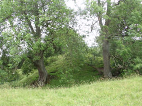 The western bank and ditch of this area are prolonged c.20m towards the north-east, as is the counterscarp to the east of the motte; the northern side of the resulting area, which measures c.50m north-west to south-east by c.20m, is now formed by a trackway with a small tributary stream beyond. The apparent lack of defences along this side of the site may suggest that it has at some stage been truncated by stream action; the stream by itself is not an especially substantial obstacle. To the west and north-west of the bank and ditch defining the inner two enclosures lies a further roughly triangular enclosed area defined by scarps on the south-west and west, though with little obvious defence on the north-east apart from the small stream. A further scarp or slight bank divides this area, with the southern third, measuring 60m north-west to south-east by c.40m, at a slightly higher level than the remainder, which measures c.80m north-west to south-east by c.50m. Traces of possible building platforms are visible immediately below the scarp. This scarp also appears on the same line in the adjacent inner bailey, suggesting a possible earlier layout beneath the present plan. At the northern corner of the site is a second substantial mound c.25m east-west by c.20m and c.4m high, which has been claimed as a burial place for the fallen at the nearby battle of Bryn Glas in 1402, though it may in fact be a natural feature. (Scheduling Report)