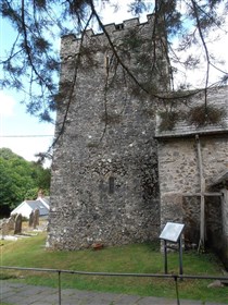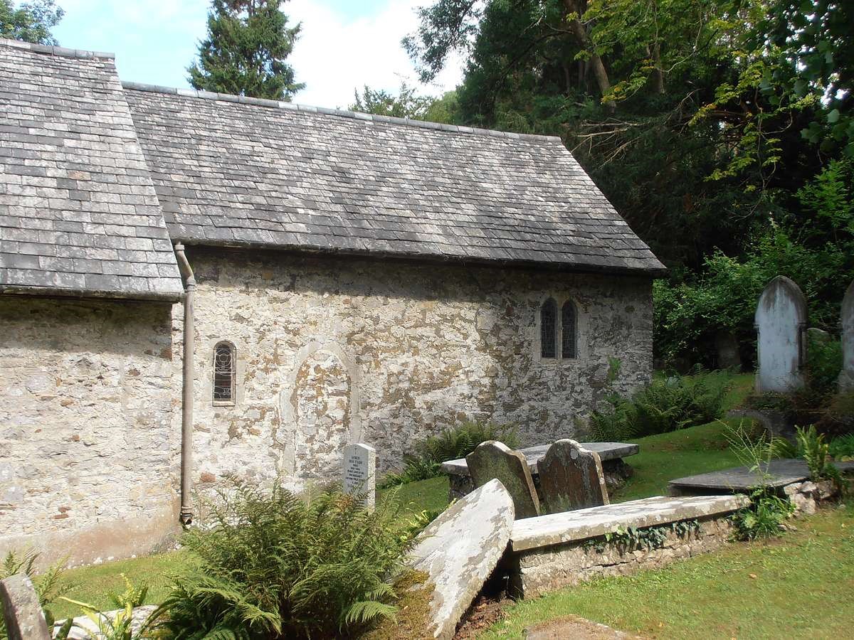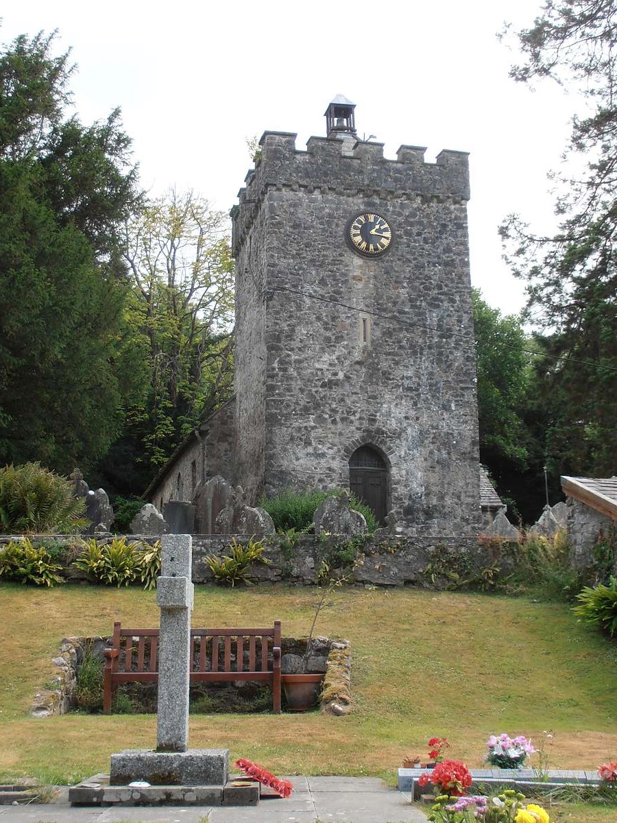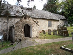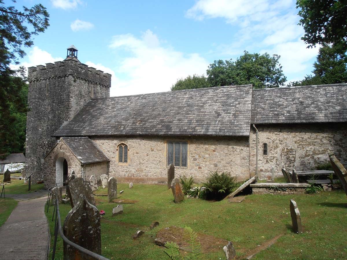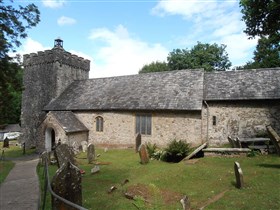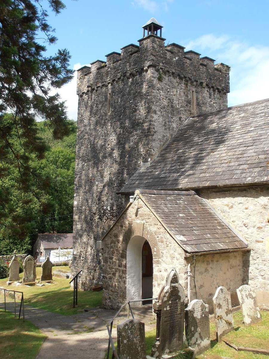 Nave, chancel, S porch, W tower. Constructed of rubble stone under stone tile roofs, of no discernible style but probably C12-13. Massive square unbuttressed tower with corbel table and embattled parapets, enclosing a pyramidal roof with cupola. Narrow W doorway under pointed arch of voussoirs containing C19 studded and panelled double doors under overlight with quarries. Early round-headed lancet to S side at ground level. Narrow slits to upper level, all probably C19, except that to N which is earlier. Large clock on W wall below parapets. Long narrow nave with steeply pitched roof and splayed walls. Two raked buttresses added to N wall and one to SW angle. Gabled S porch added to L of nave, with round headed opening of voussoirs bearing a keystone with inscription 'David Jones / Rector / Thomas Edwards / David Daniels / Churchwardens, 1851 / G William, Mason'. The S doorway is round headed and contains studded and panelled double doors. R of porch, a 2-light window under 4-centred head with hoodmould ending with head-bosses, and beyond, a 3-light Tudor window, both probably mid-late C19. The N wall of the nave has a Dec. trefoil-headed lancet to the far L. A blocked round-headed N doorway is now butted by one of the buttresses, and flanked by C19 windows like that in centre of S wall. Late C20 square window opening to far R. The S side of the chancel has a blocked priest's door with 2-centred head L of centre. To its L, a small round-headed lancet, and to R, a pair of similar lancets. Three-light Perpendicular-style E window, mid-late C19, with head-bosses to hoodmould. Single lancet to N side with shallow pointed head. (Listed Building Report)