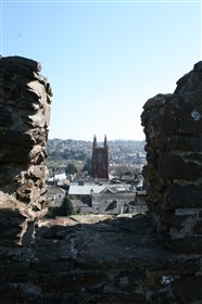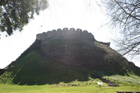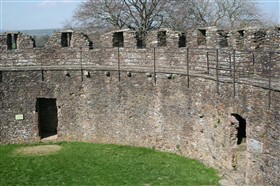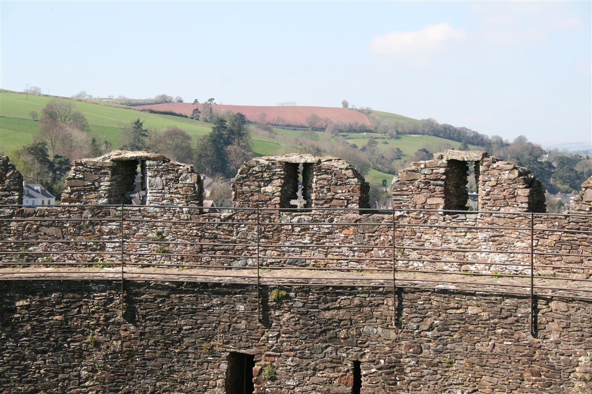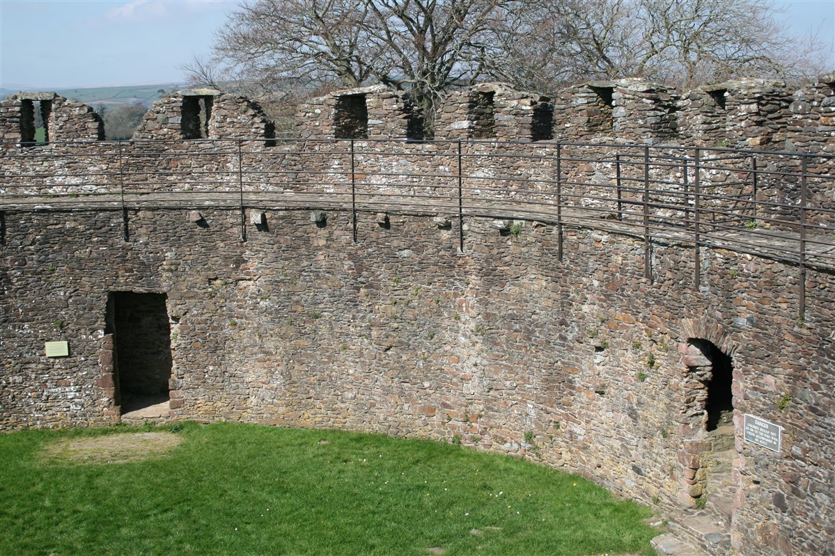 Motte and bailey castle, presumably with timber fortifications, was constructed by Judhael of Totnes shortly after the Conquest. It occupied the north-east corner of the Anglo-saxon burgh. The earliest shell-keep, built by Reginald de Braose circa 1219, was extensively rebuilt together with the rest of the castle by Baron Zouche in 1326. The castle was later owned by the Edgecombes of Cothele and the Seymour family, by whom it was placed in the guardianship of the Ministry of Works in 1947. The main function of Totnes castle was to act as a centre for the manorial courts under the constable, and as a base for the administration of the family estates. The earliest remains, apart from the motte and bailey earthworks, are masonry footings on the top of the motte of an C11 or C12 square, timber tower. The surviving upstanding masonry is mostly of C14 date and comprises a circular masonry shell-keep and sections of the bailey curtain wall. Keep of Devonion limestone rubble with red sandstone dressings and battered external face. Crenellated battlements with merlons pierced for loom; approached by 2 stairways in the thickness of the wall. Garderobe chamber also within the thickness of the curtain and projecting beyond the line of the wall; lit by pair of crossed loops. Bailey curtain-wall of pitched limestone rubble. The hall and other domestic buildings which formerly stood in the bailey no longer survive. (Listed Building Report)