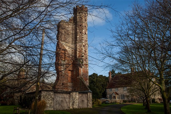 Warblington Castle, HavantThe 'Castle' is said to have been built, or a license to crenellate the existing manor granted, c1340 and the foundations of some buildings surrounding the courtyard date possibly from the 14th century. They are surmounted by 1-4 courses of Tudor brick and the gatehouse ruins are of that date, built of brick faced with Isle of Wight stone, the mouldings and ornament of Caen stone (VCH).It would seem that the 'castle' was uninhabitable in 1695 and after the siege of 1644 it had probably been dismantled (Butchart).The 'castle' - a fortified homestead - has been totally destroyed, its site occupied by the modern farm. This house and the ruins of the gatehouse, which has a turret of early Tudor brick, are surrounded by a square moat, the traces of which, on the S and E sides, are to be seen as a very shallow depression. Along the N side the moat is still quite deep and apparently turned south at the modern pond. Along the N side, outside the moat, is a steep-sided, clay rampart, c8 feet high, and 11-12ft above the bottom of the moat, with a flat top 6-8 feet wide. At its NE end is a square 'expansion', 30 x 30 feet and at the NW end it stops abruptly in a line with the gateway. In the field to the westward, there are traces, possibly of former buildings flanking the main approach. At the end of the 18th century, the field to the north is described as 'surrounded with a mound and fosse as deep as that of the castle' (Williams-Freeman 1915)Mick HallidayView details